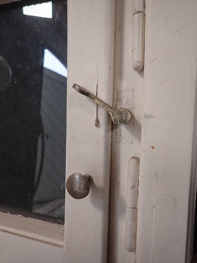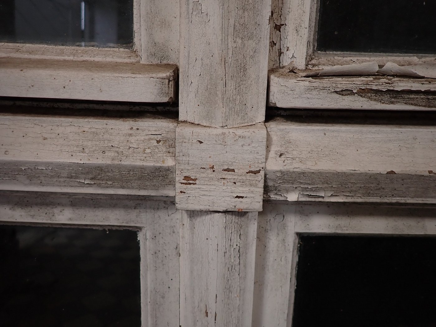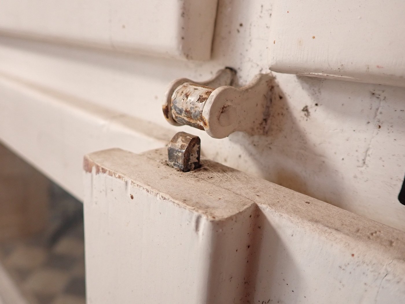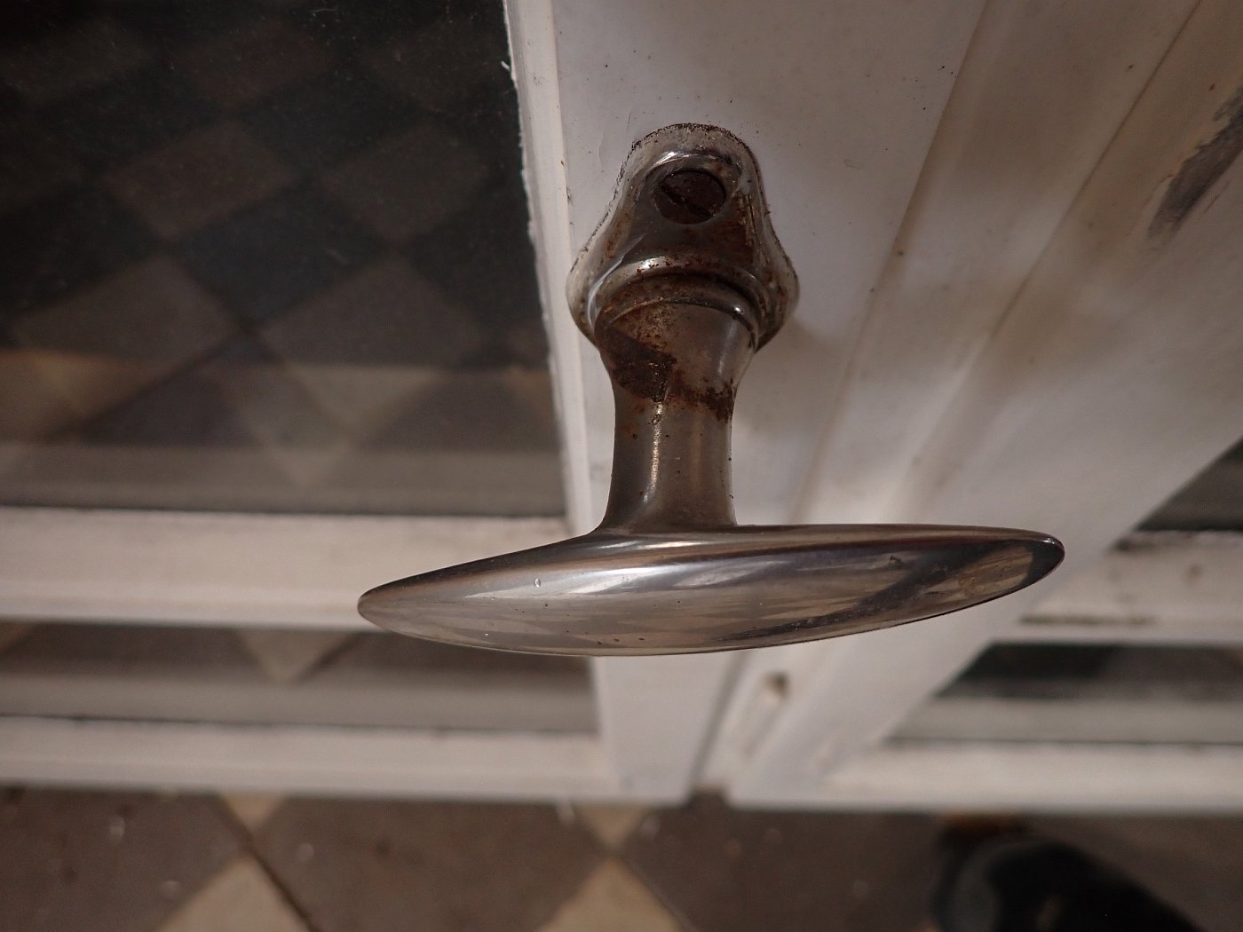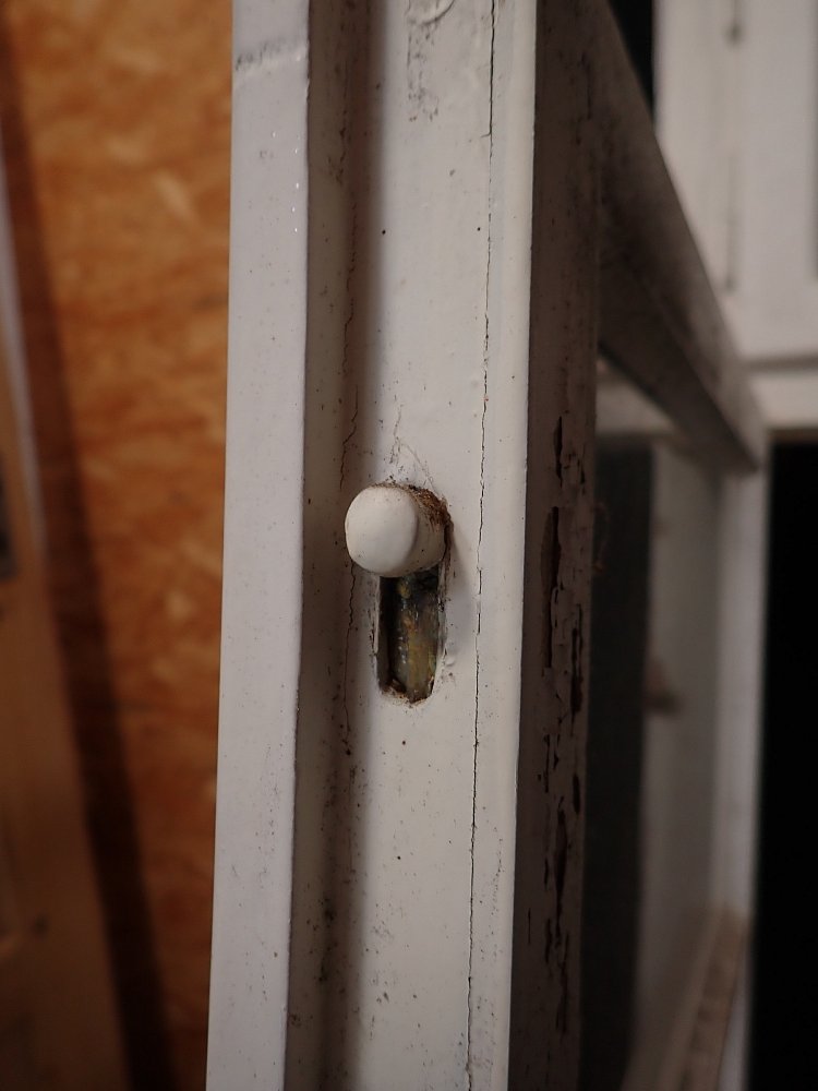Mittlerweile löst sich der weiße Lack und blättert stark ab, außerdem weisen die Metallelemente des Fensters Rost auf.