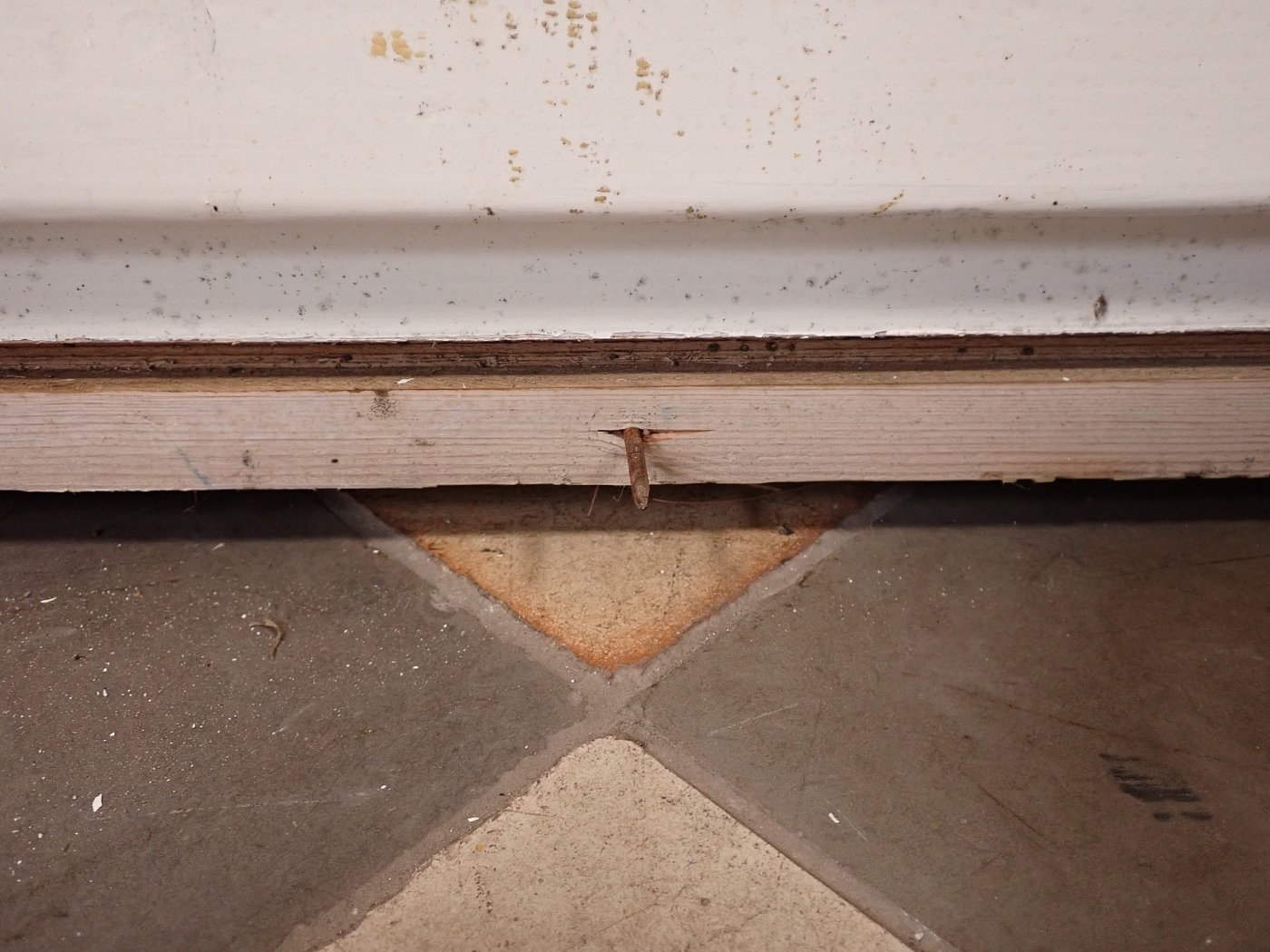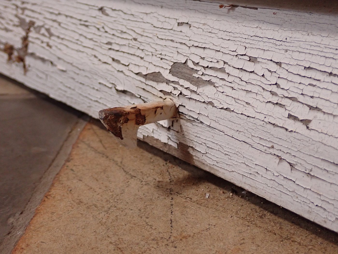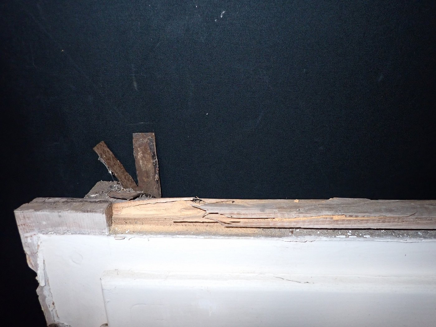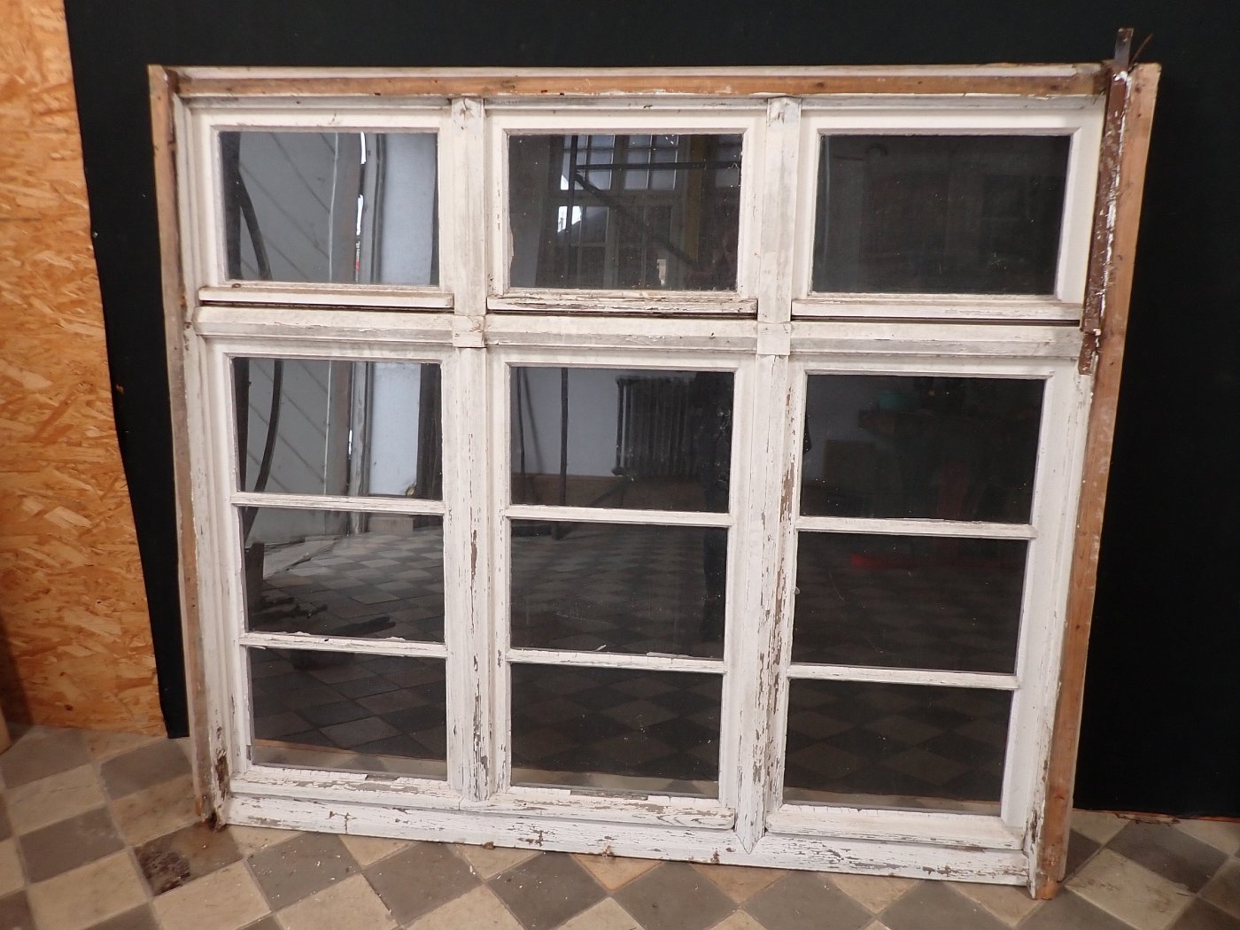 Mittlerweile löst sich der weiße Lack und blättert stark ab, außerdem weisen die Metallelemente des Fensters Rost auf.