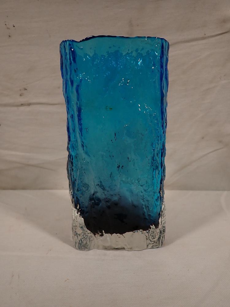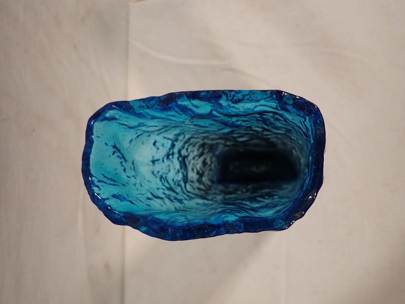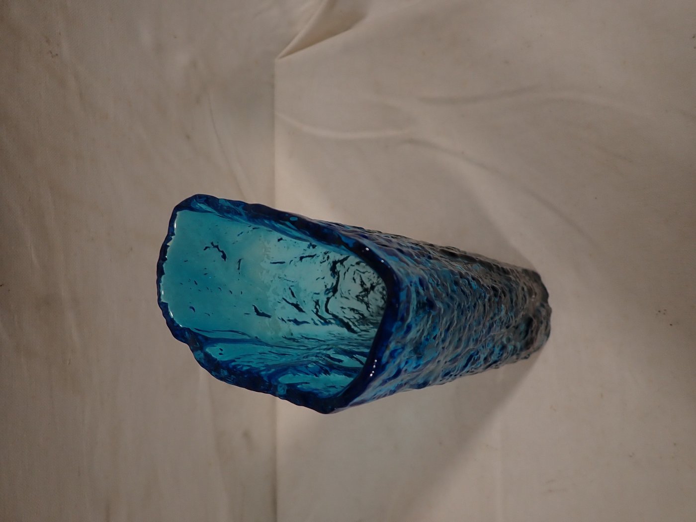 Die Vase besteht aus geblasenem kaltgeschliffenem Glas in einer bläulichen Farbe. Diese Design wird oft als Keulenvase bezeichnet. An der Vase haftet Dreck,...