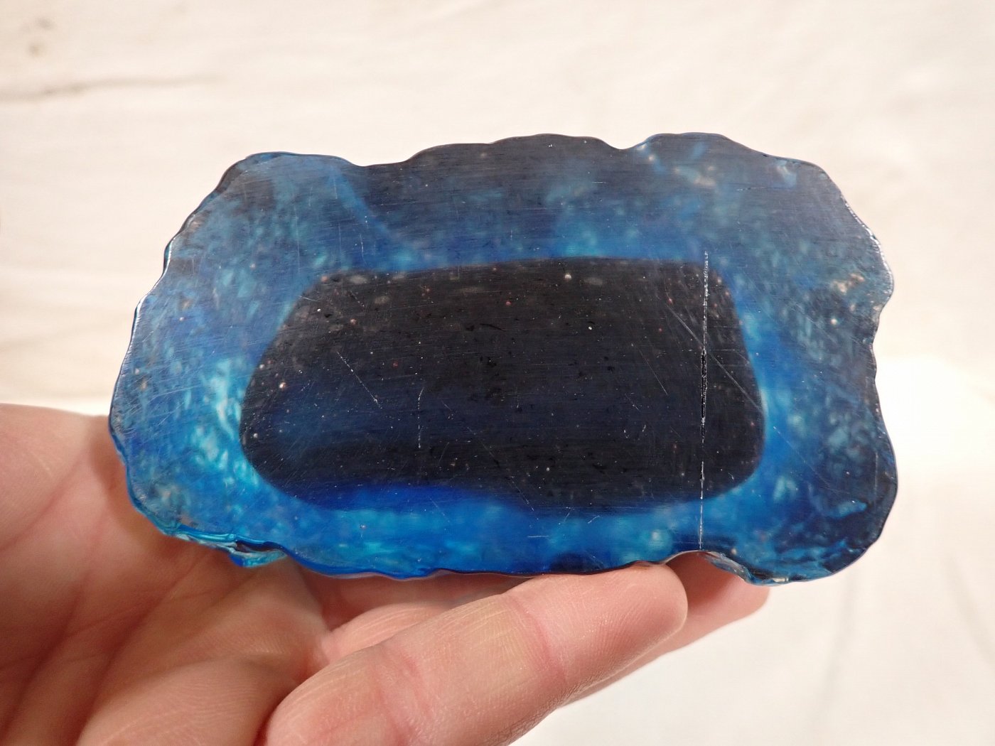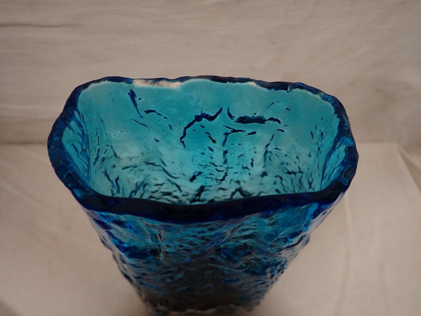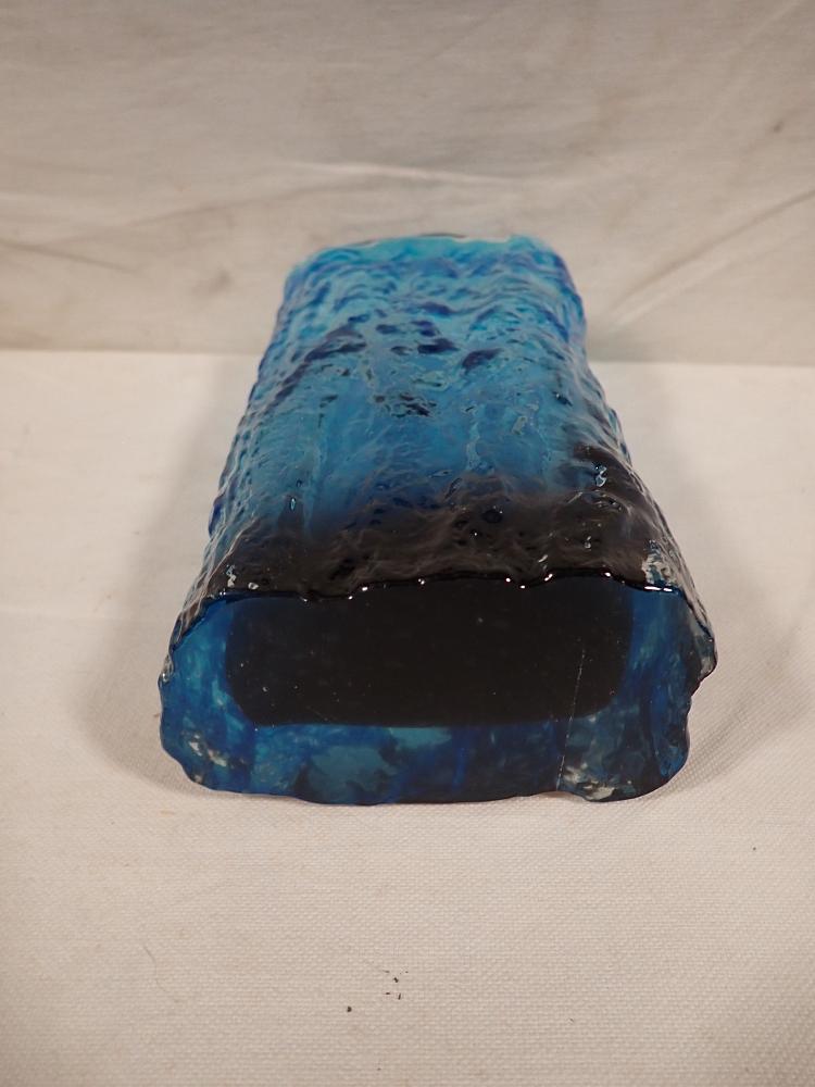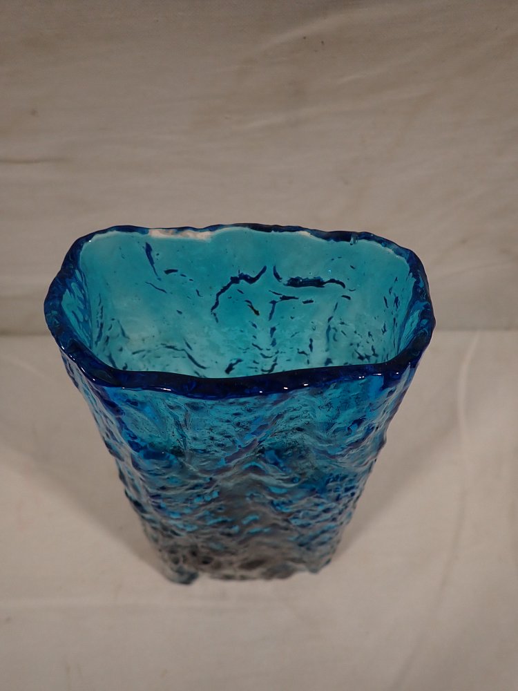 Die Vase besteht aus geblasenem kaltgeschliffenem Glas in einer bläulichen Farbe. Diese Design wird oft als Keulenvase bezeichnet. An der Vase haftet Dreck,...