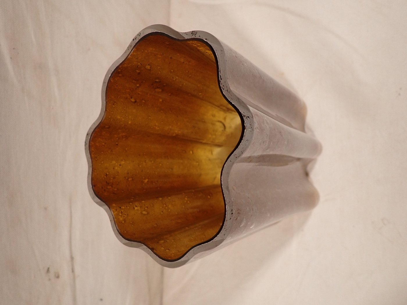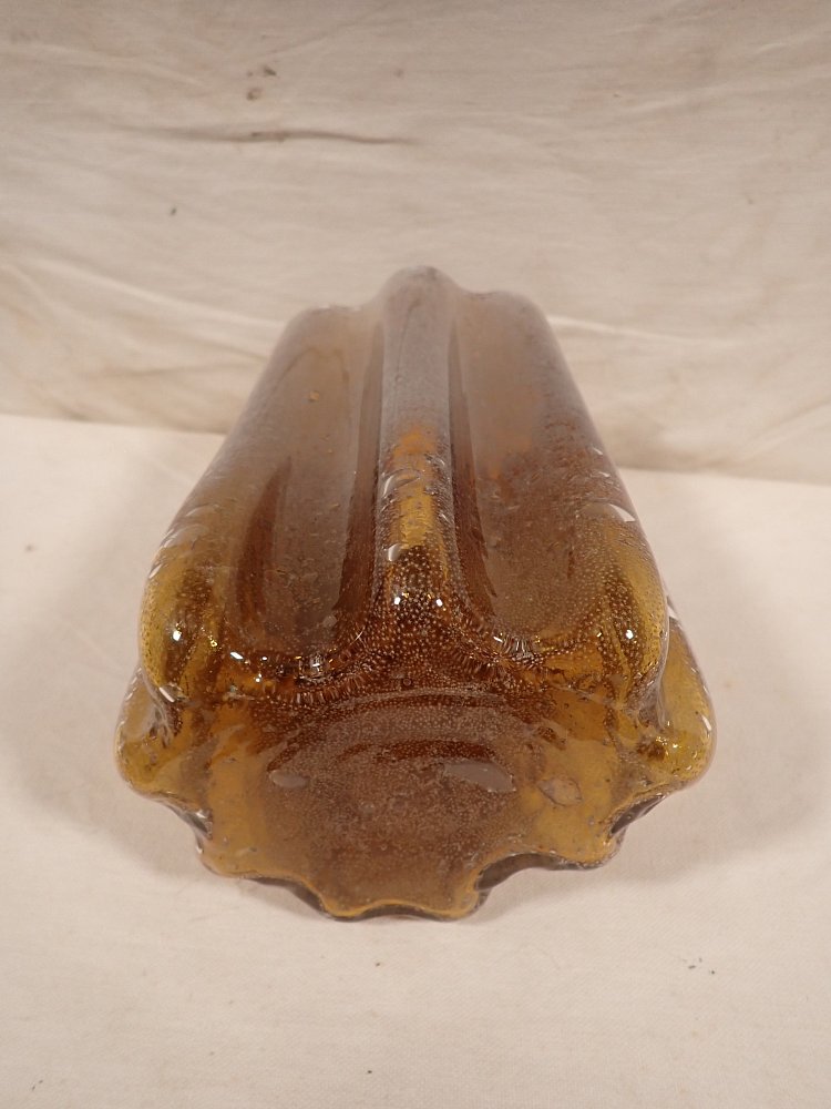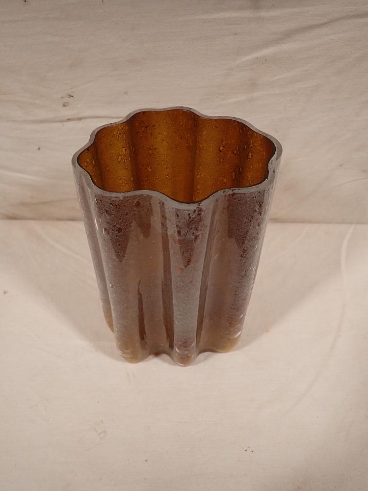 DetailansichtDie Vase hat eine außergeöhnliche Wellenform und einen besonders schönen bernsteinfarbenen farbverlauf, der sich mit den weißlichen Bläschen im Glas abwechselt.
