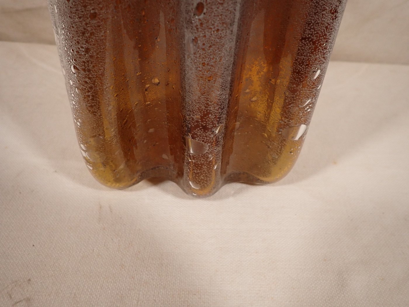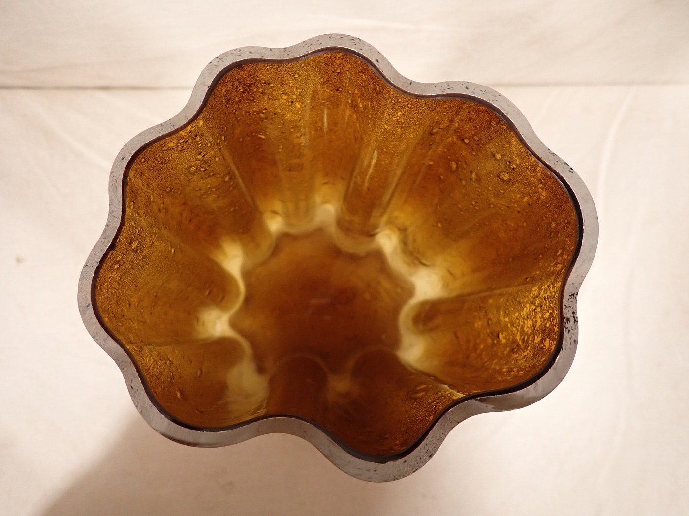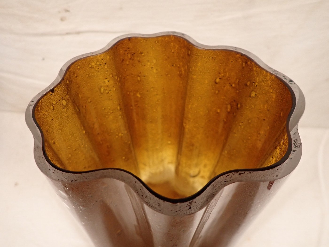 DetailansichtDie Vase hat eine außergeöhnliche Wellenform und einen besonders schönen bernsteinfarbenen farbverlauf, der sich mit den weißlichen Bläschen im Glas abwechselt.