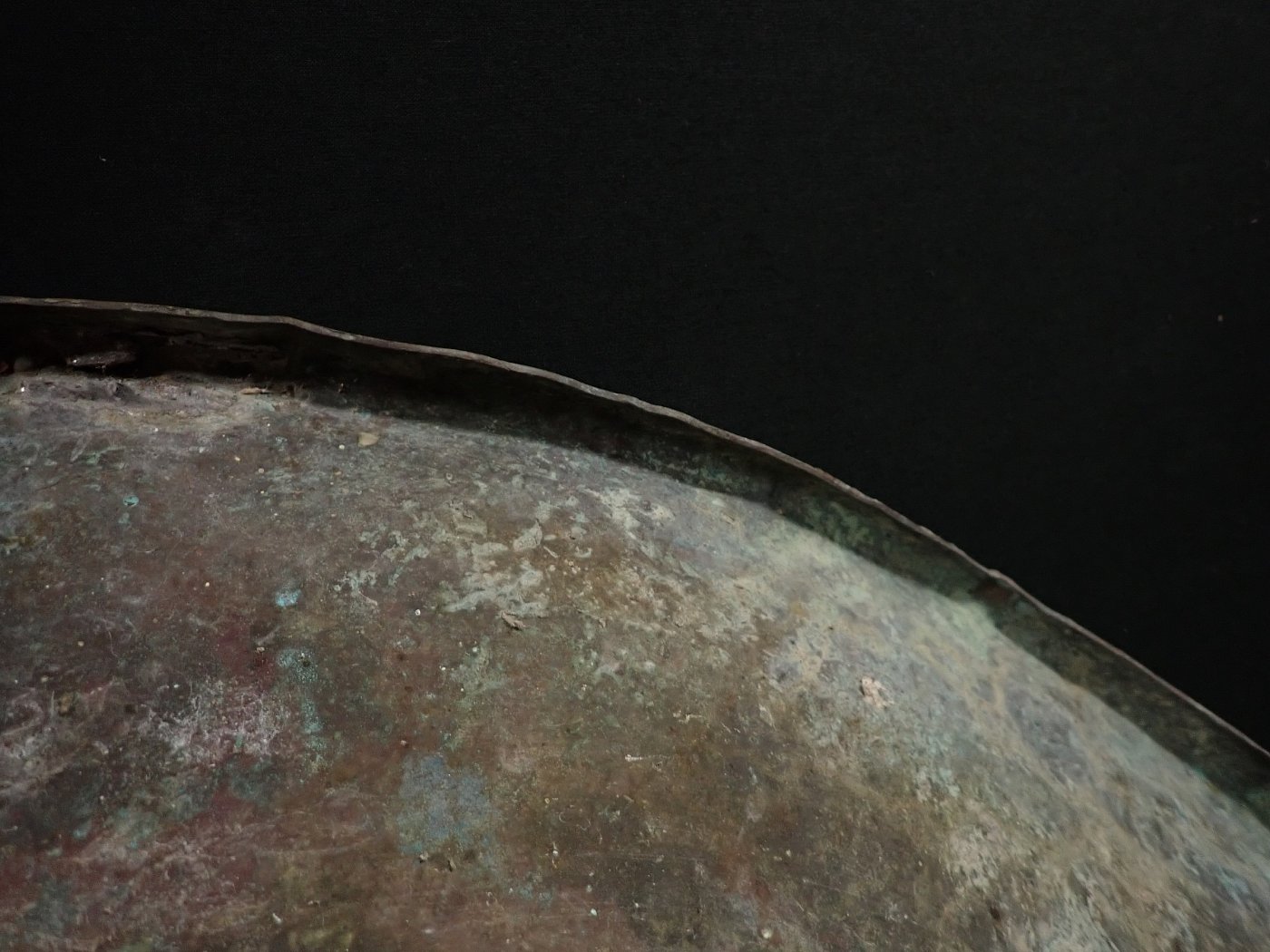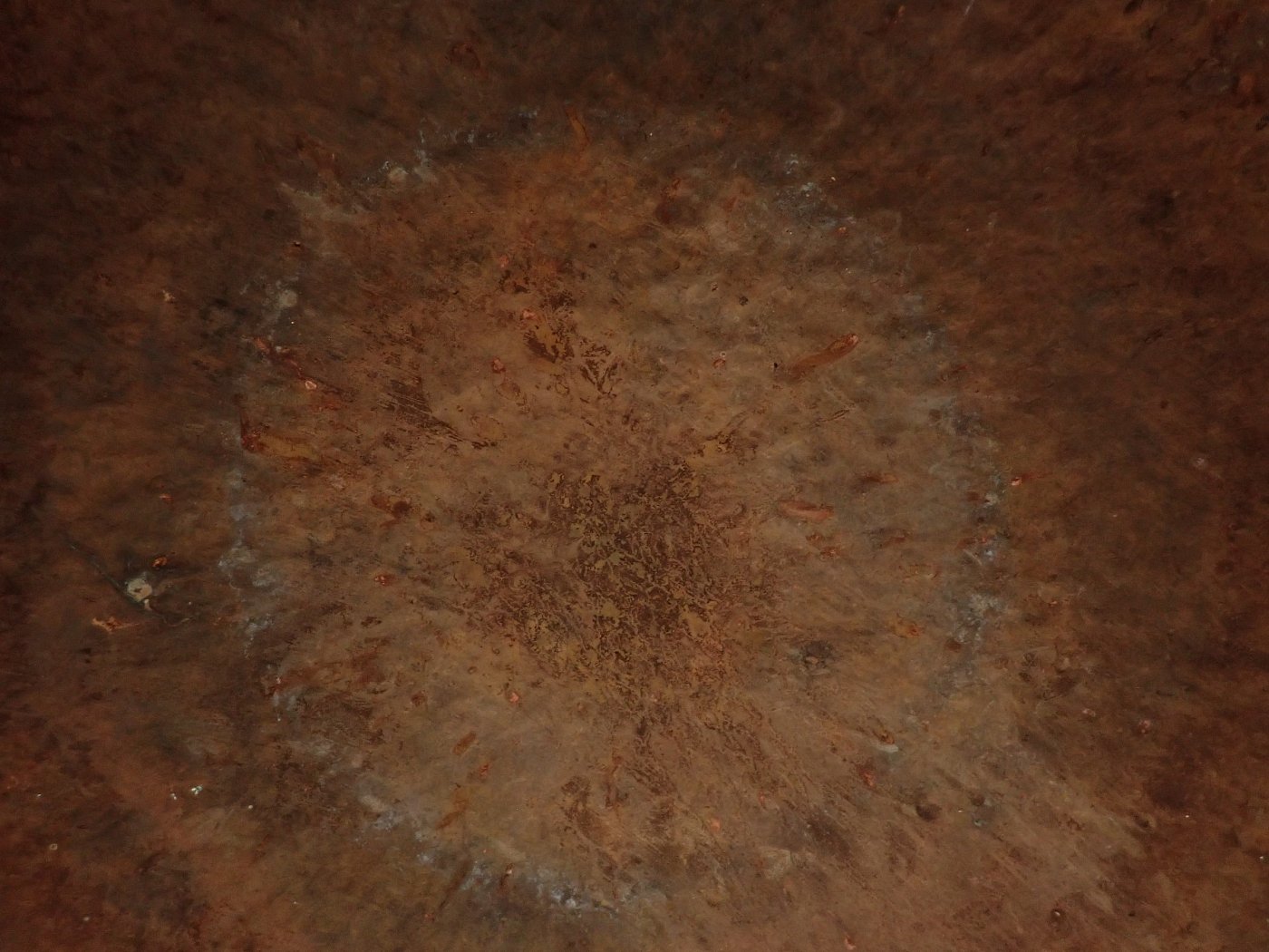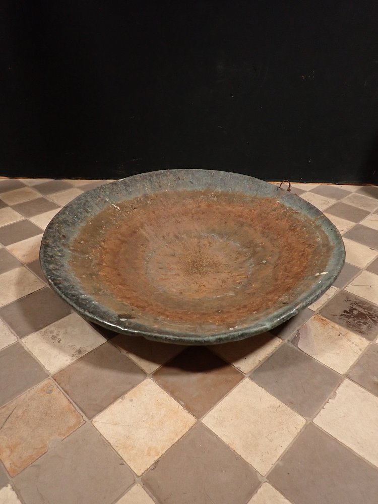 Große, flache Schale aus Kupfer.