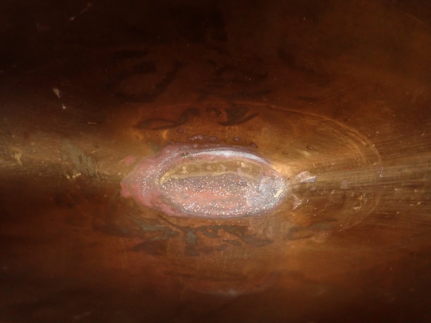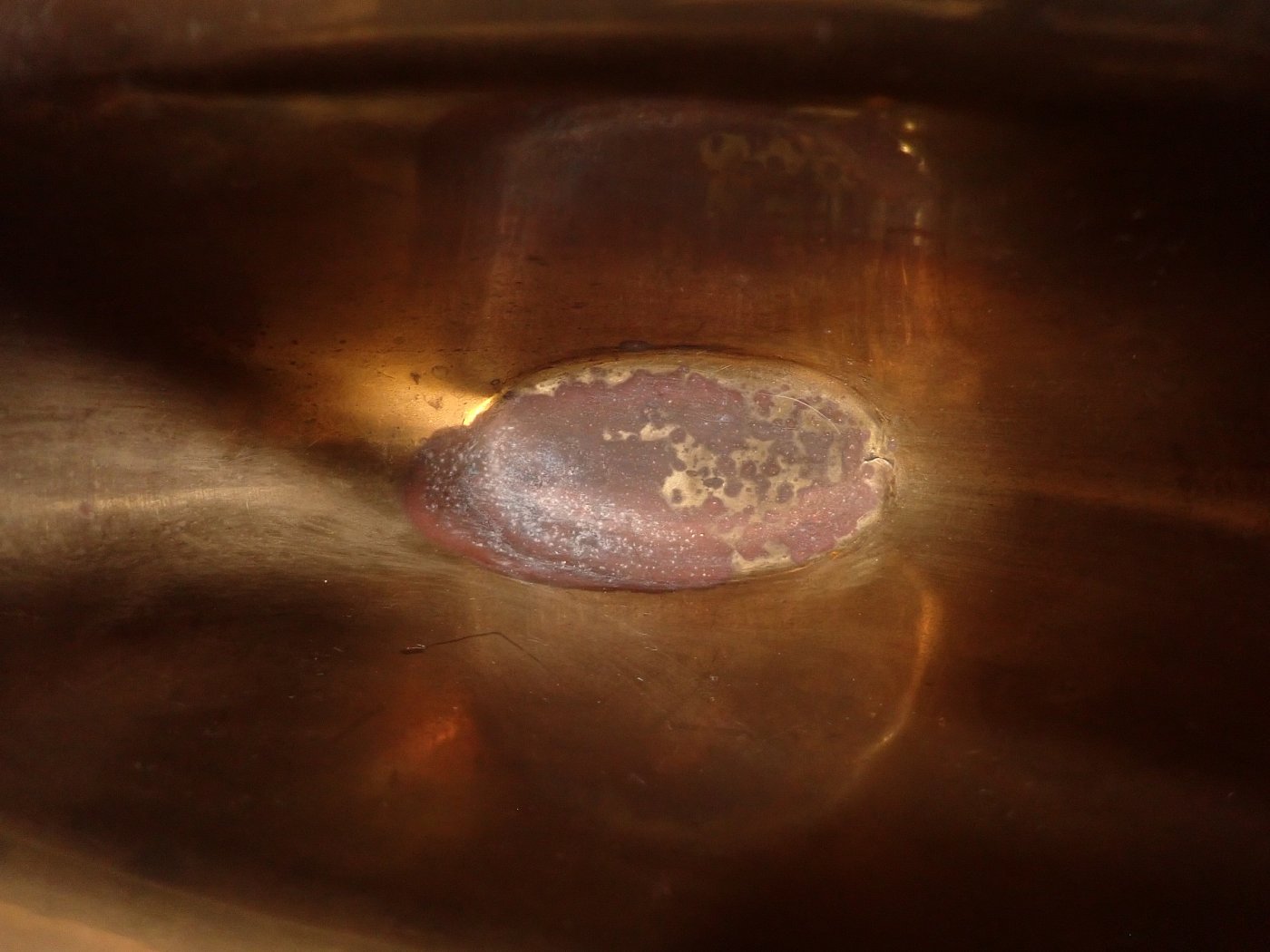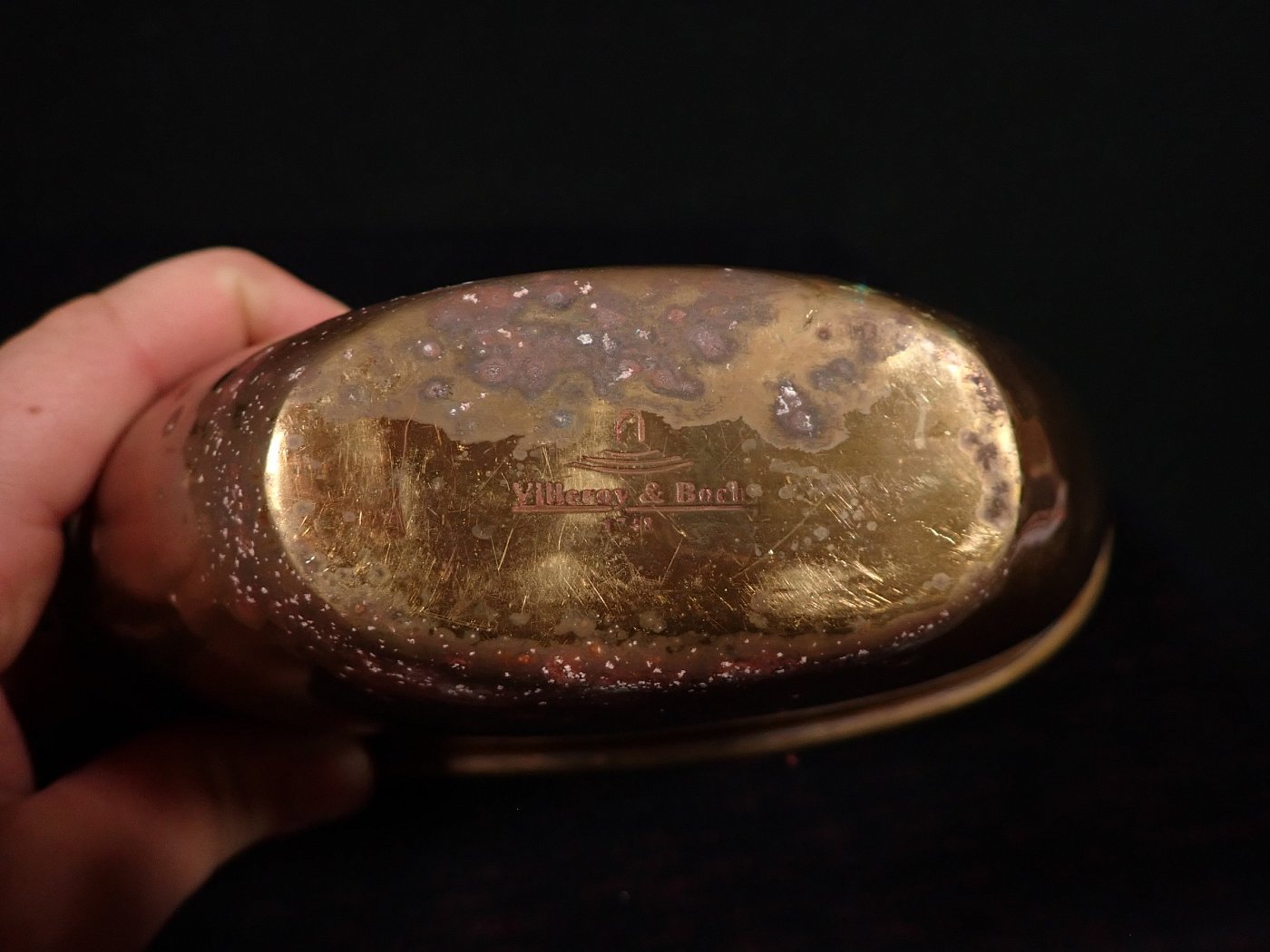 Von Außen und Innen sind angelaufe Stellen zu erkennen. Besonders auf dem Boden Außen und Innen sind sehr stark angelaufene Stellen.