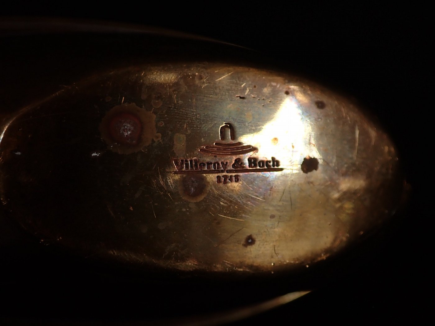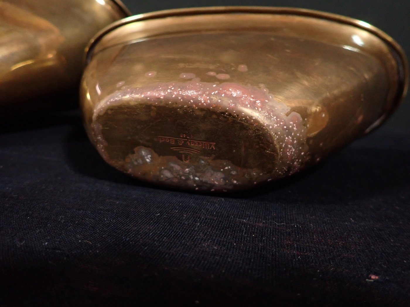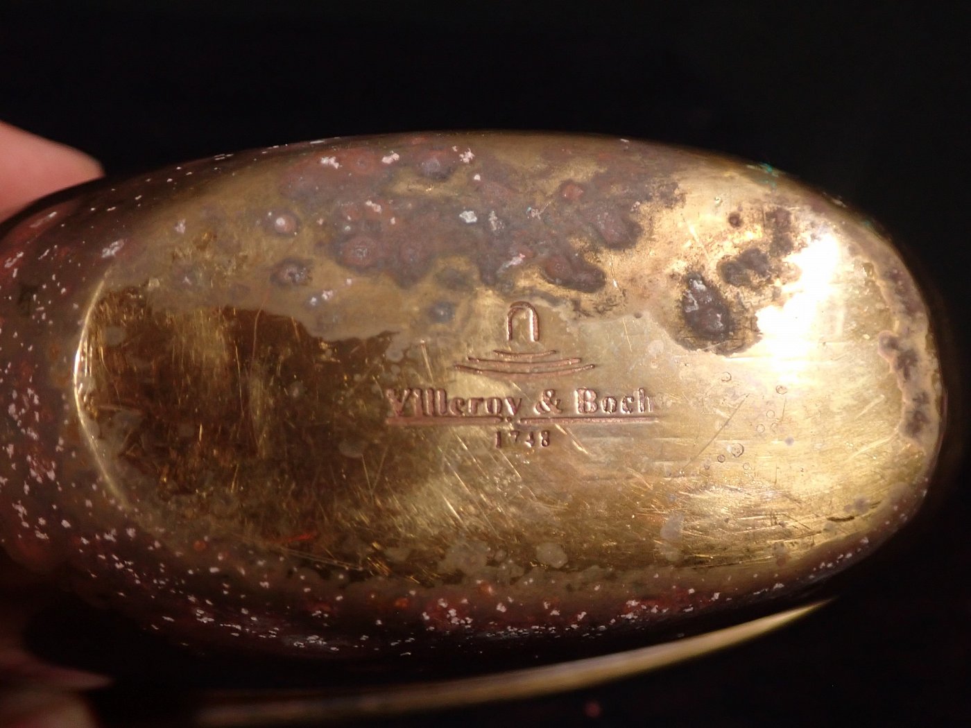 Von Außen und Innen sind angelaufe Stellen zu erkennen. Besonders auf dem Boden Außen und Innen sind sehr stark angelaufene Stellen.