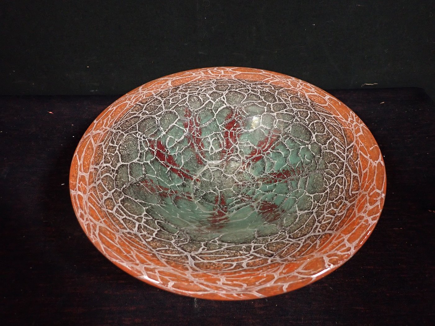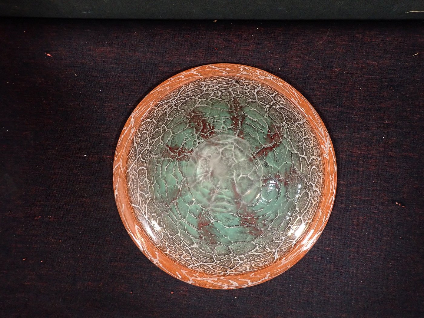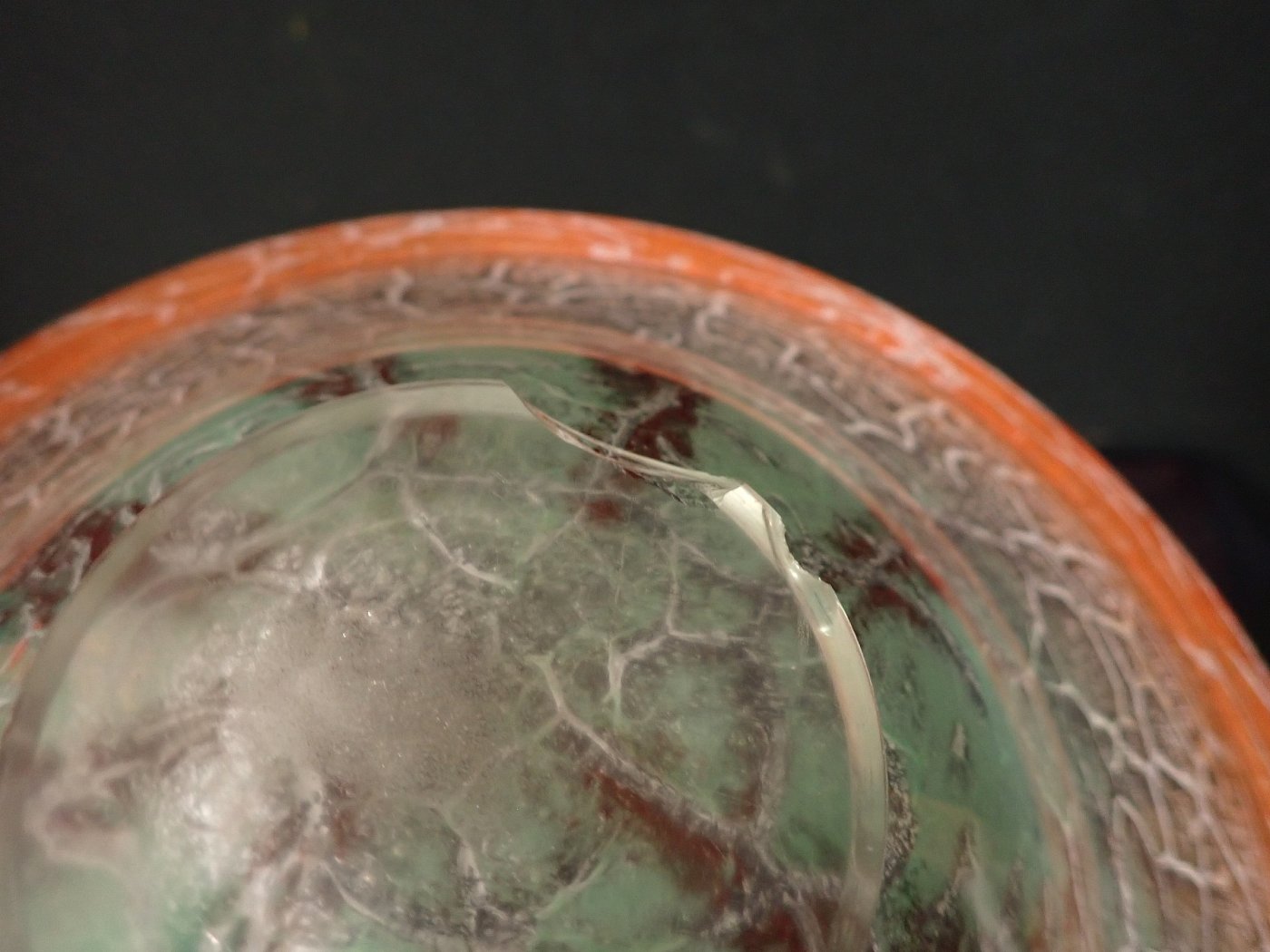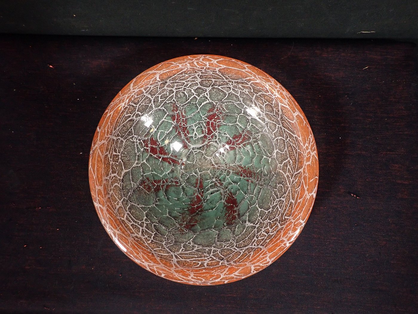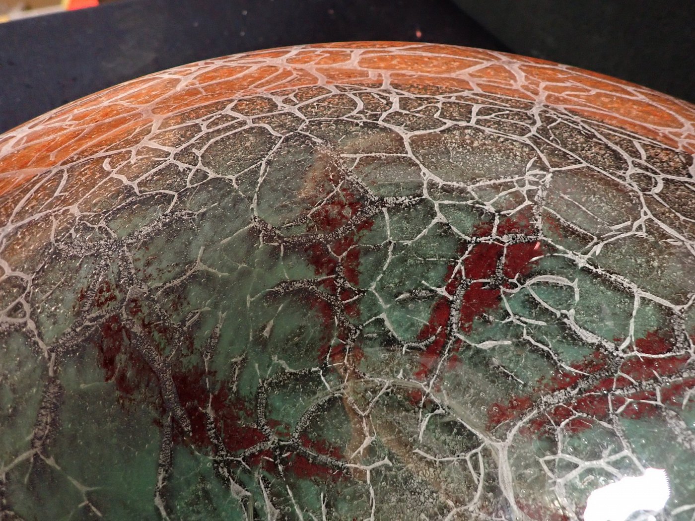 DetailansichtDie Glasschale hat Karl Wiedmann 1930 für WMF entworfen. Sie hat einen Verlauf von rot und hellgrün/türkis in orange und ein krakeliertes Muster. Dieses hat feine, helle und dunkle Risse in der Farbschicht, damit dieser Effekt entsteht.