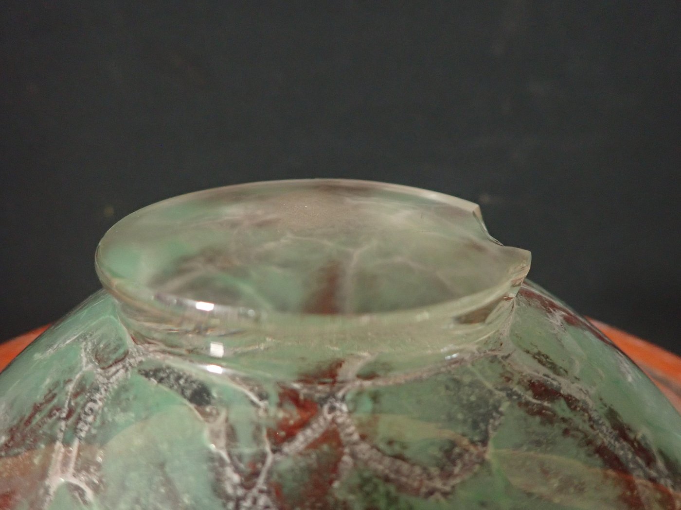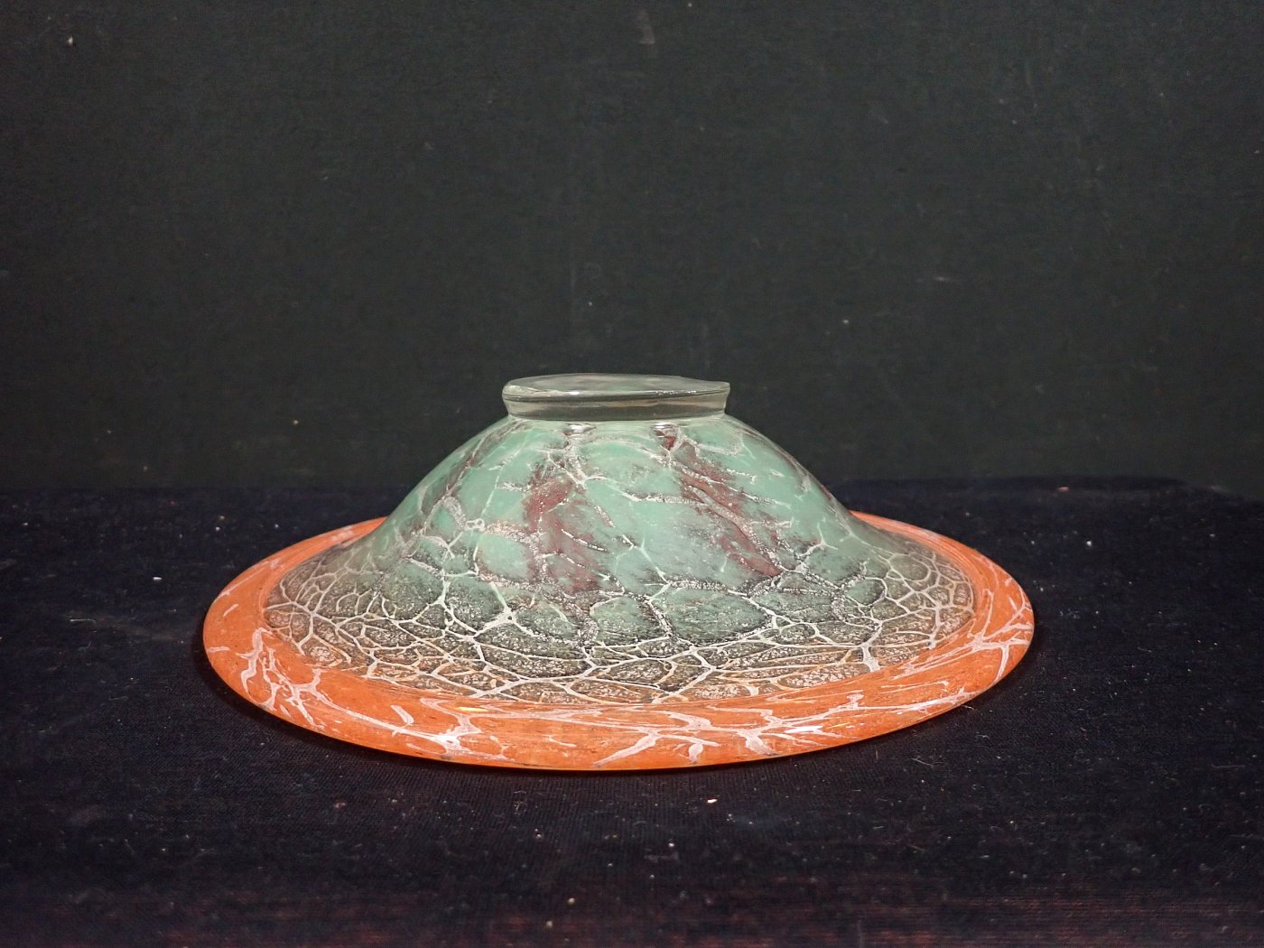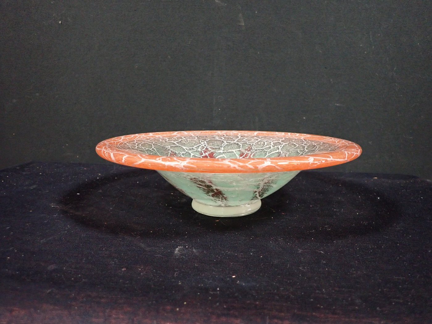 DetailansichtDie Schale wurde Mundgeblasen und hat Lufteinschlüsse und rote Pulvereinschlüsse. Auf der Unterseite sind Kratzer und Abplatzer zu erkennen.