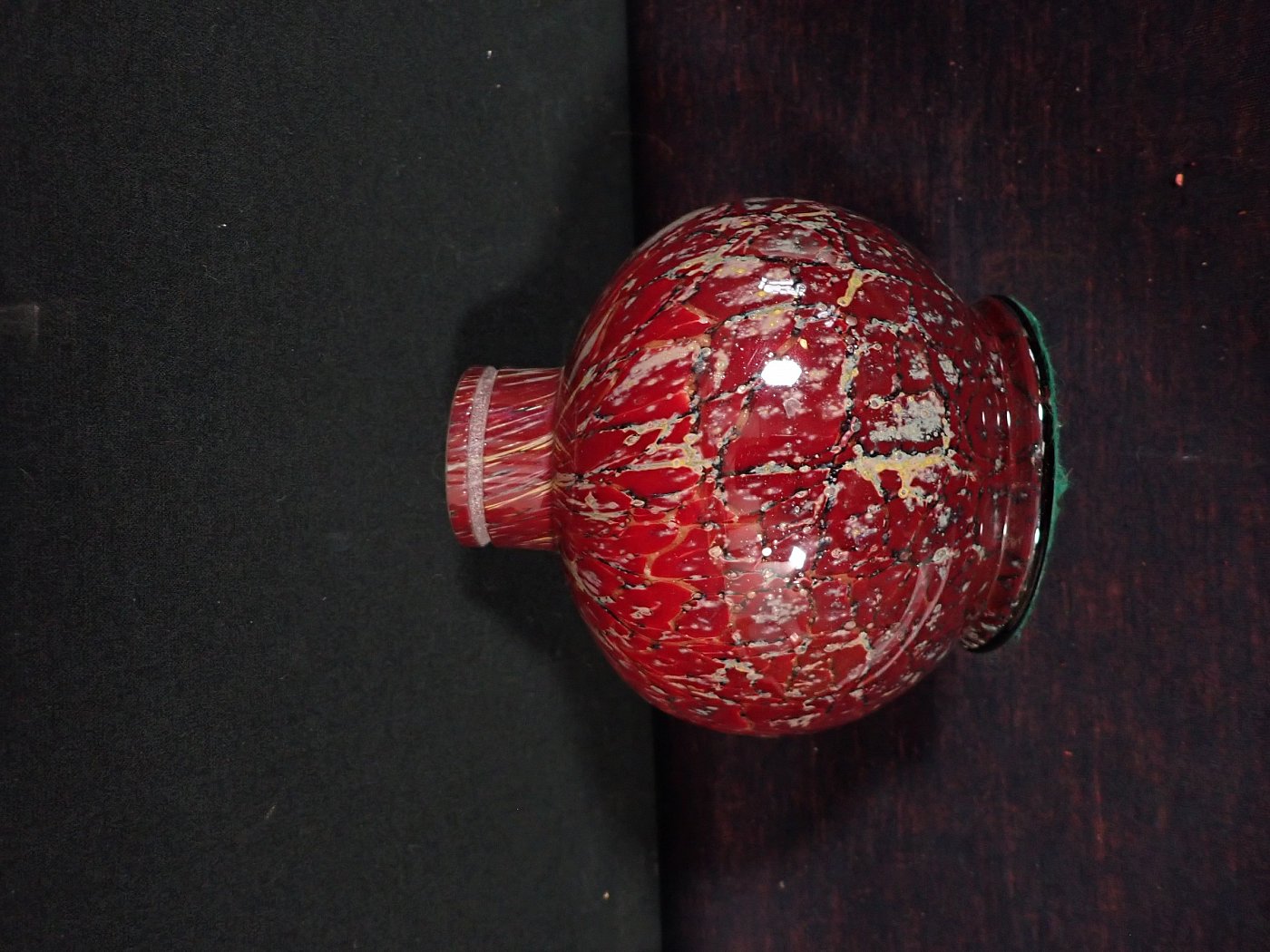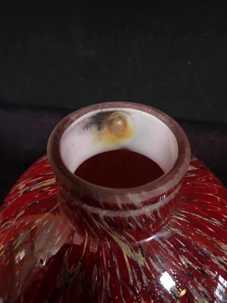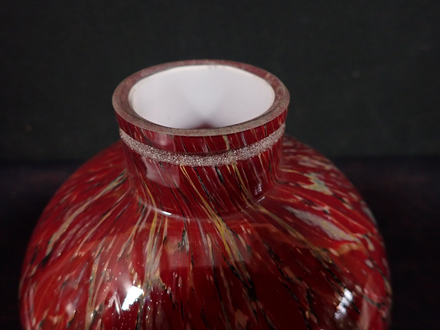 DetailansichtDie Vase besteht aus Glas mit einem Farbverlauf von rot-orange zu Braun- dunkelrot mit eingeschlossenen silbrig-weißen Partikeln oder Pulvereinschlüssen. Auf...
