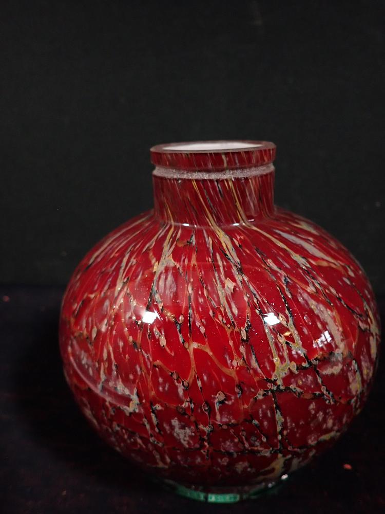 DetailansichtDie Vase besteht aus einem weinrotem Glas mit einer gelb-grauen Netzwerk Krakelee Struktur. Angefertigt wurden sie oft mit Lufteinschlüssen und einer opaken weißen...