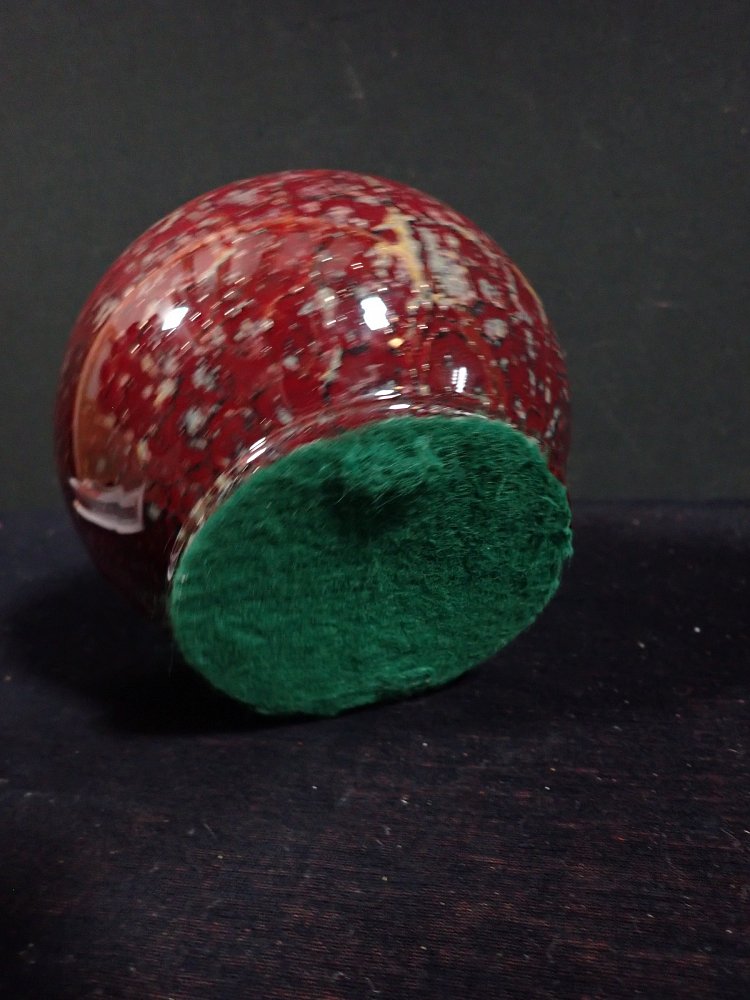 DetailansichtDer Leuchtenfuß besteht aus mundgeblasenem, farblosen Glas mit einem weinroten und weißen Innenüberfang. Typisch sind netzartige Einschmelzungen aus Luftblasen und farbigem Pulverschmelz, die eine marmorierte Optik erzeugen. Auf der Unterseite ist der Leuchtenfuß mit einem grünen Filzboden ausgestattet, um kratzer zu vermeiden.