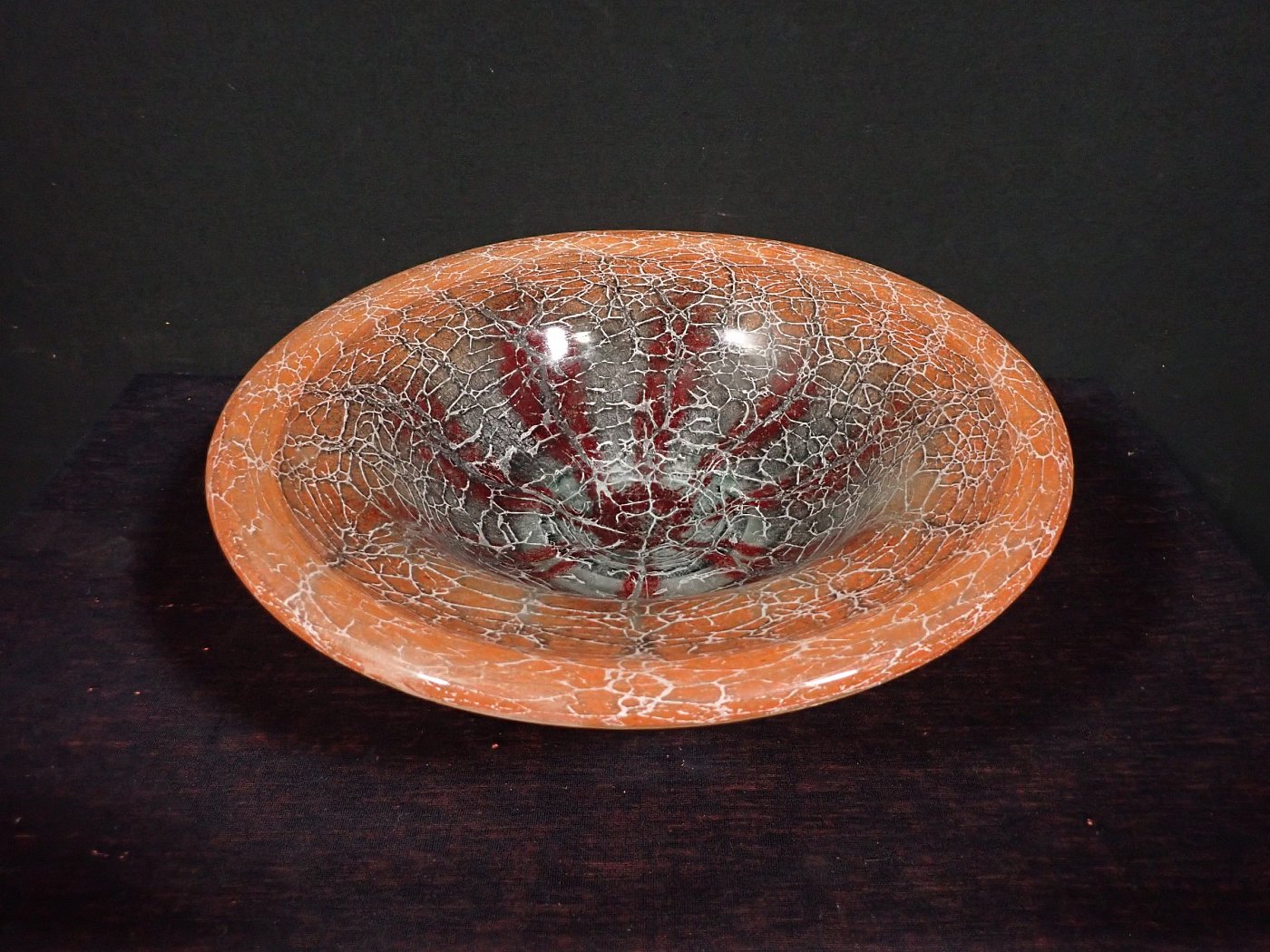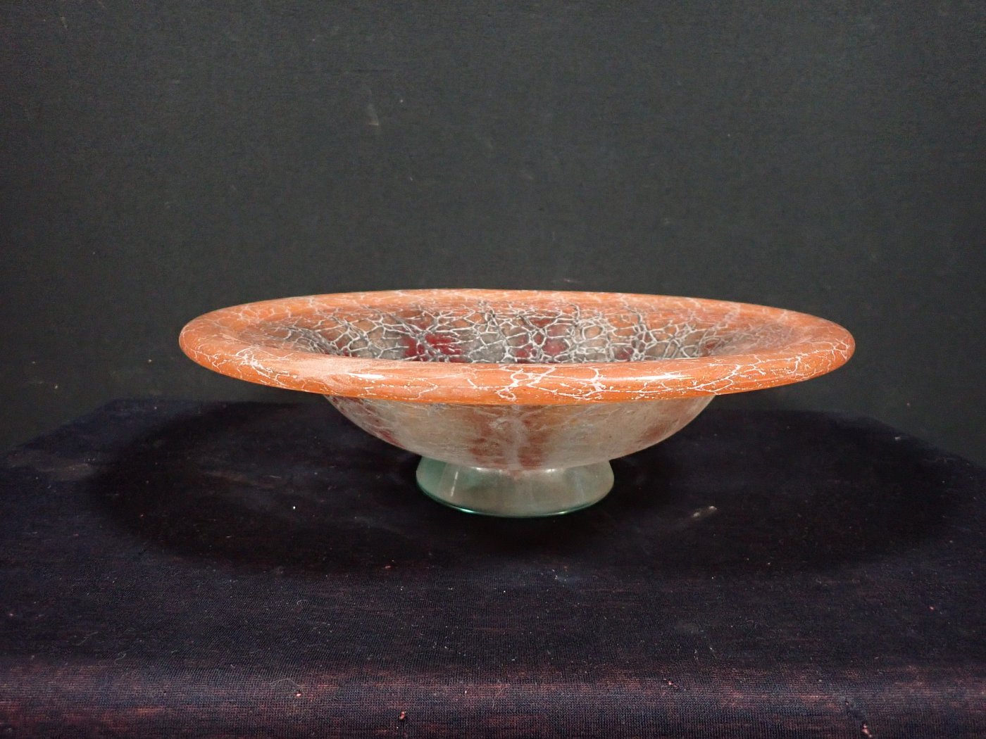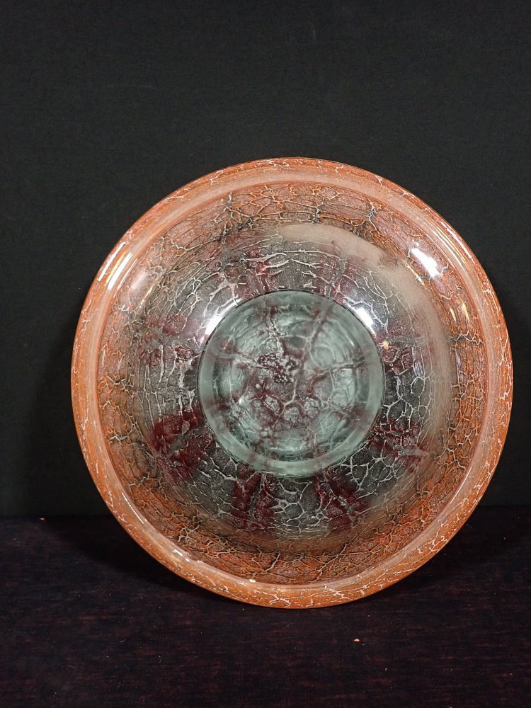 Die Glasschale hat Karl Wiedmann 1930 für WMF entworfen. Sie hat einen Verlauf von rot ins hellgrün/türkis und ein krakeliertes Muster. Dieses hat feine Risse...