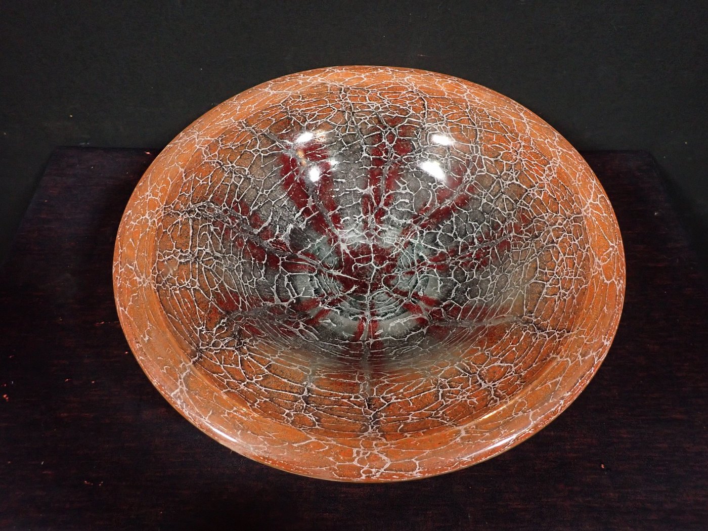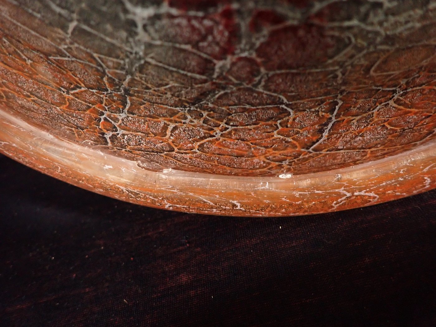 DetailansichtDie Schale besteht aus Glas mit einem Farbverlauf von orange zu Braun- oder Rottönen mit eingeschlossenen silbrig-weißen Partikeln oder Pulvereinschlüssen.