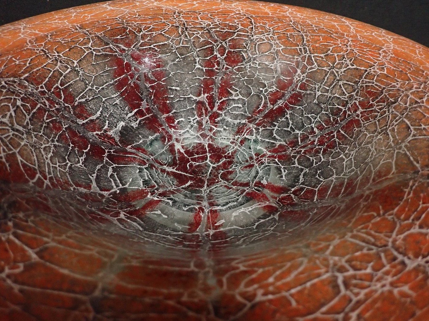 DetailansichtDie Glasschale hat Karl Wiedmann 1930 für WMFentworfen. Sie hat einen Verlauf von rot in orange und ein krakeliertes Muster. Dieses hat feine helle und dunkle Risse...