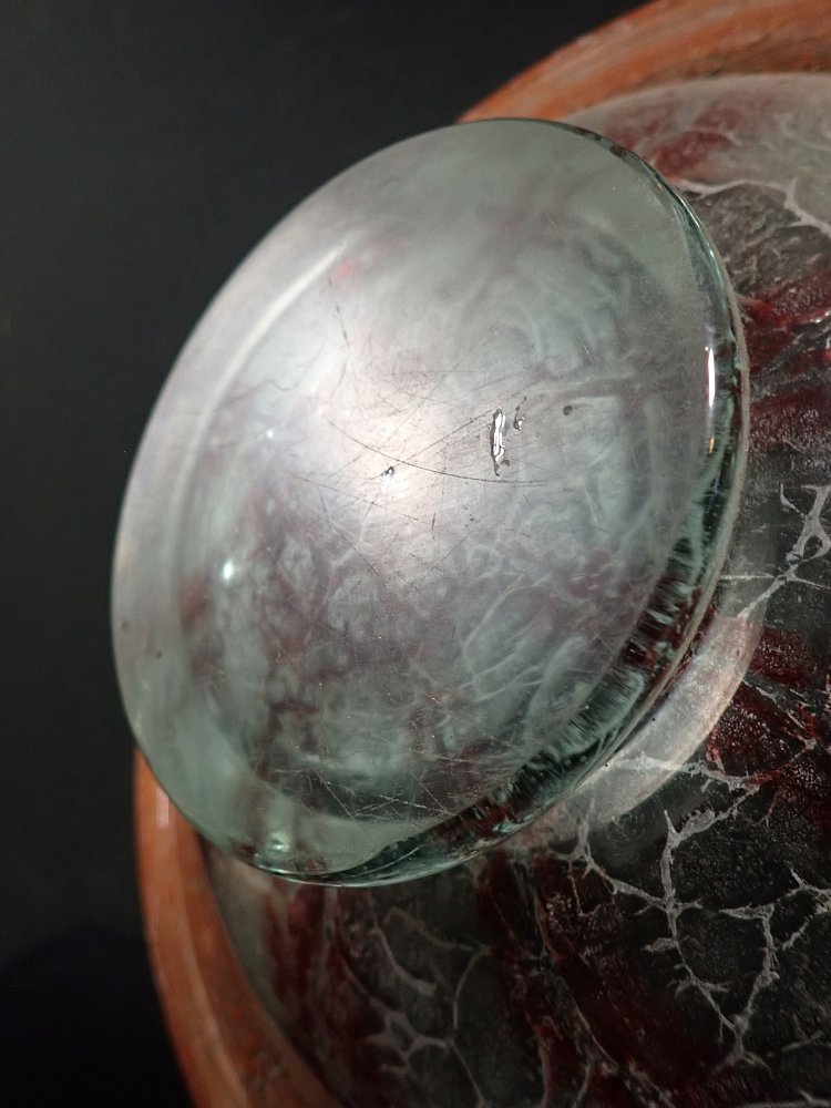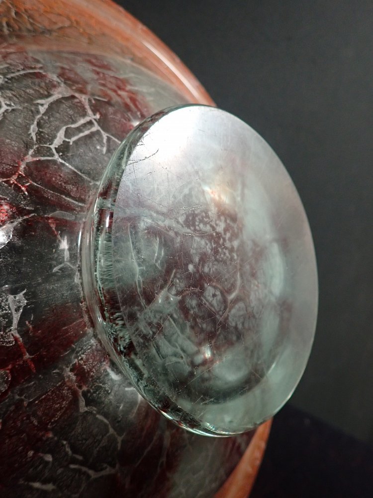 DetailansichtDie Schale wurde Mundgeblasen und hat Lufteinschlüsse und rote Pulvereinschlüsse. Auf der Unterseite sind Kratzer und Abplatzer zu erkennen.