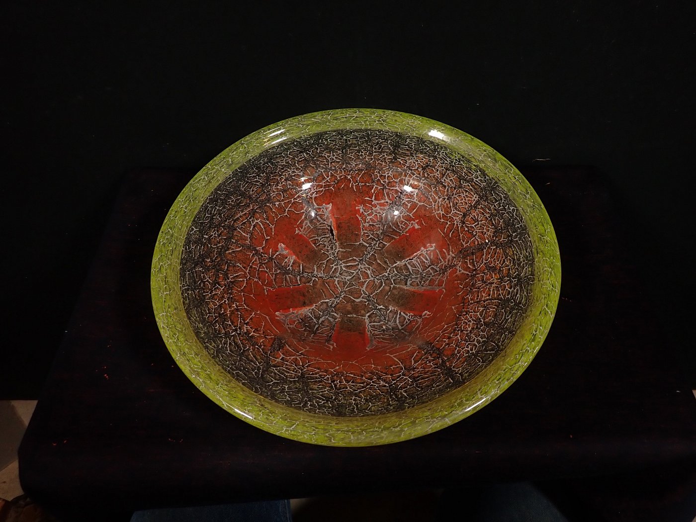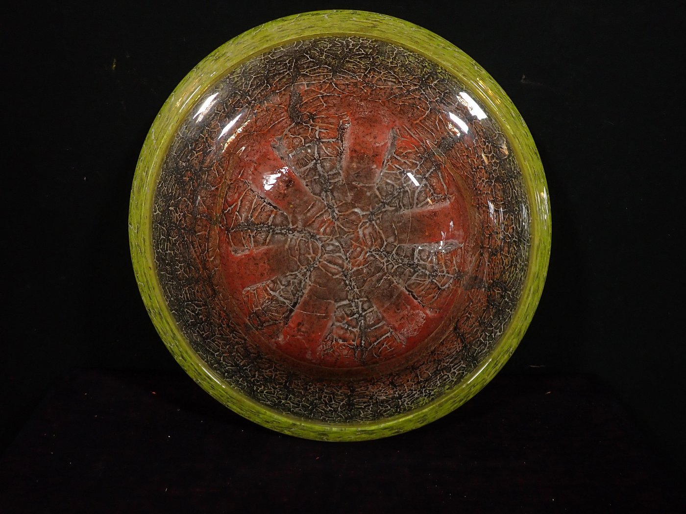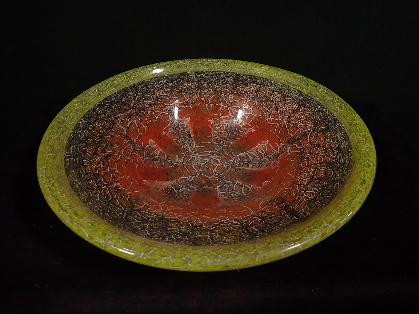 DetailansichtDie Schale besteht aus Glas mit einem Farbverlauf von grün zu dunkelrot mit eingeschlossenen silbrig-weißen Partikeln oder Pulvereinschlüssen.