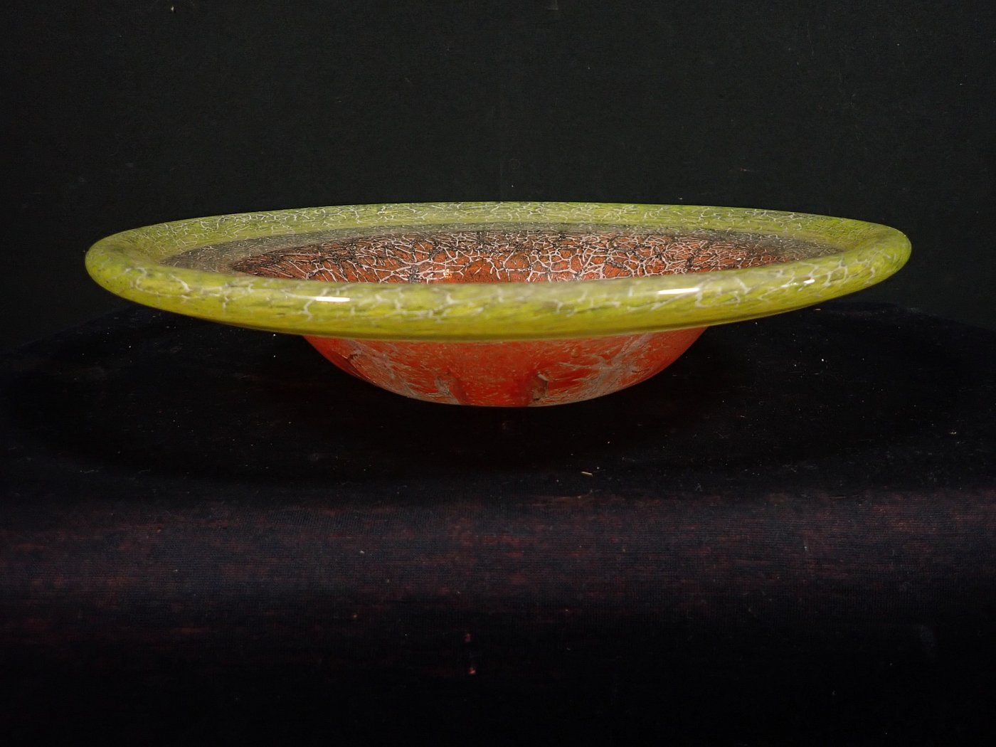 DetailansichtDie Schale besteht aus Glas mit einem Farbverlauf von grün zu orange mit eingeschlossenen silbrig-weißen Partikeln oder Pulvereinschlüssen. Auf der Unterseite...