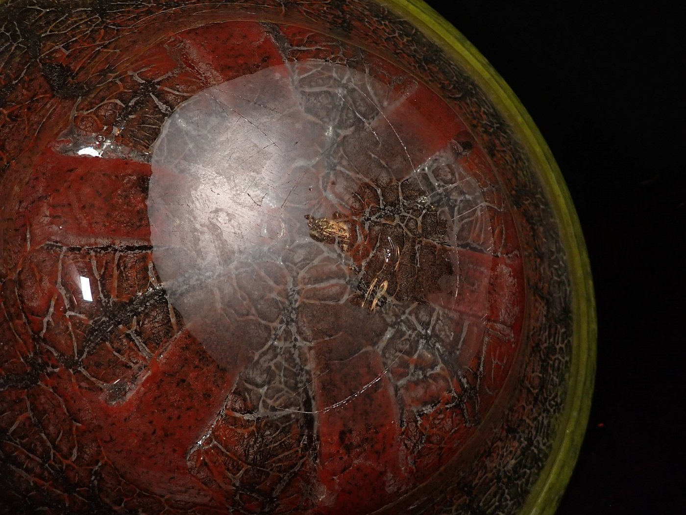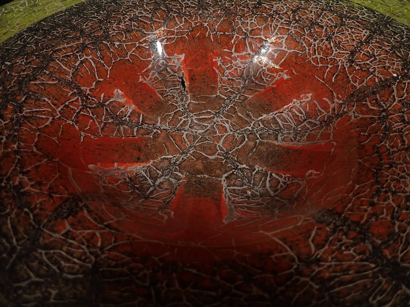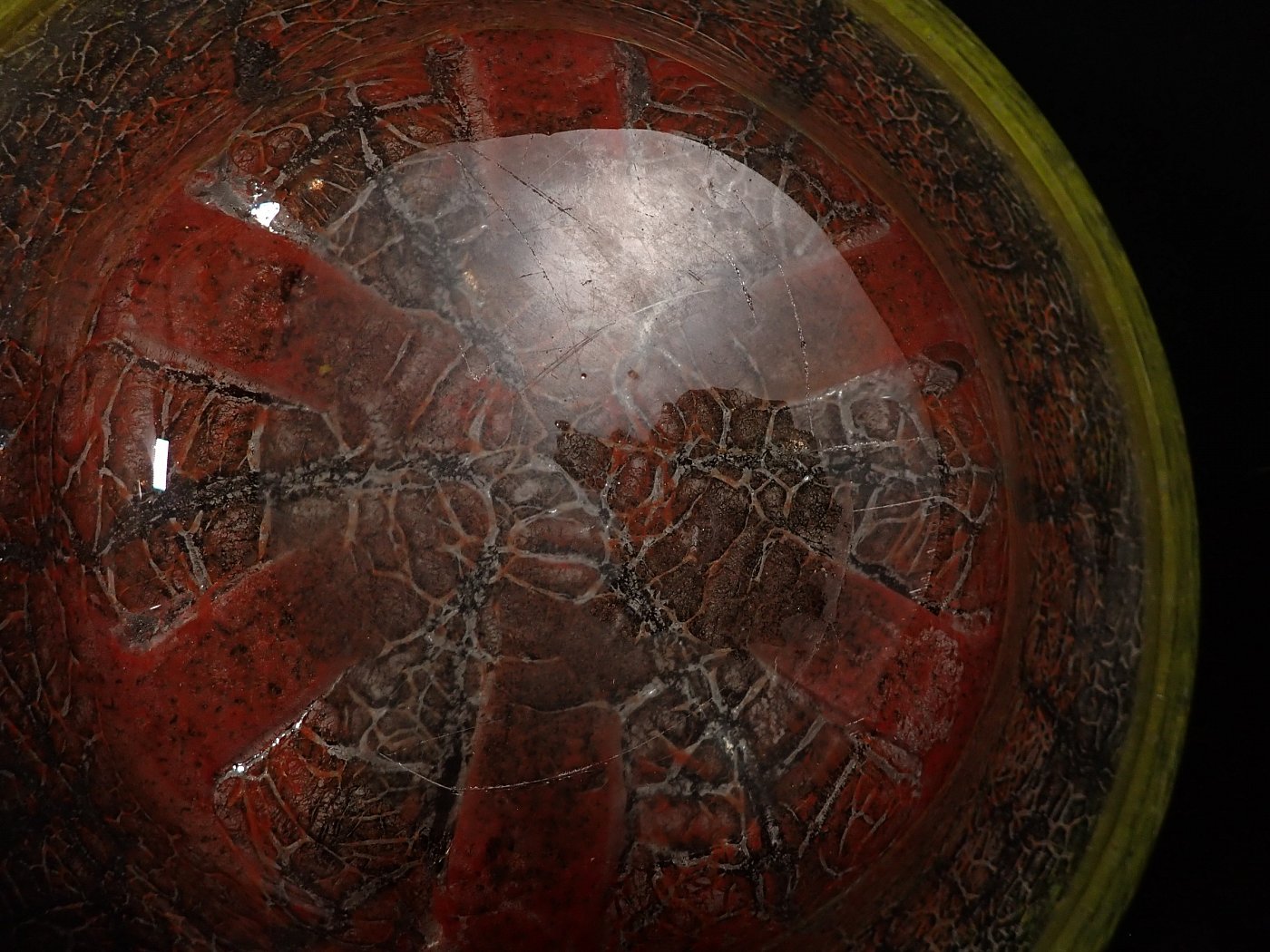 DetailansichtDie Schale wurde Mundgeblasen und hat Lufteinschlüsse und rote Pulvereinschlüsse. Auf der Unterseite sind Kratzer und Abplatzer zu erkennen.