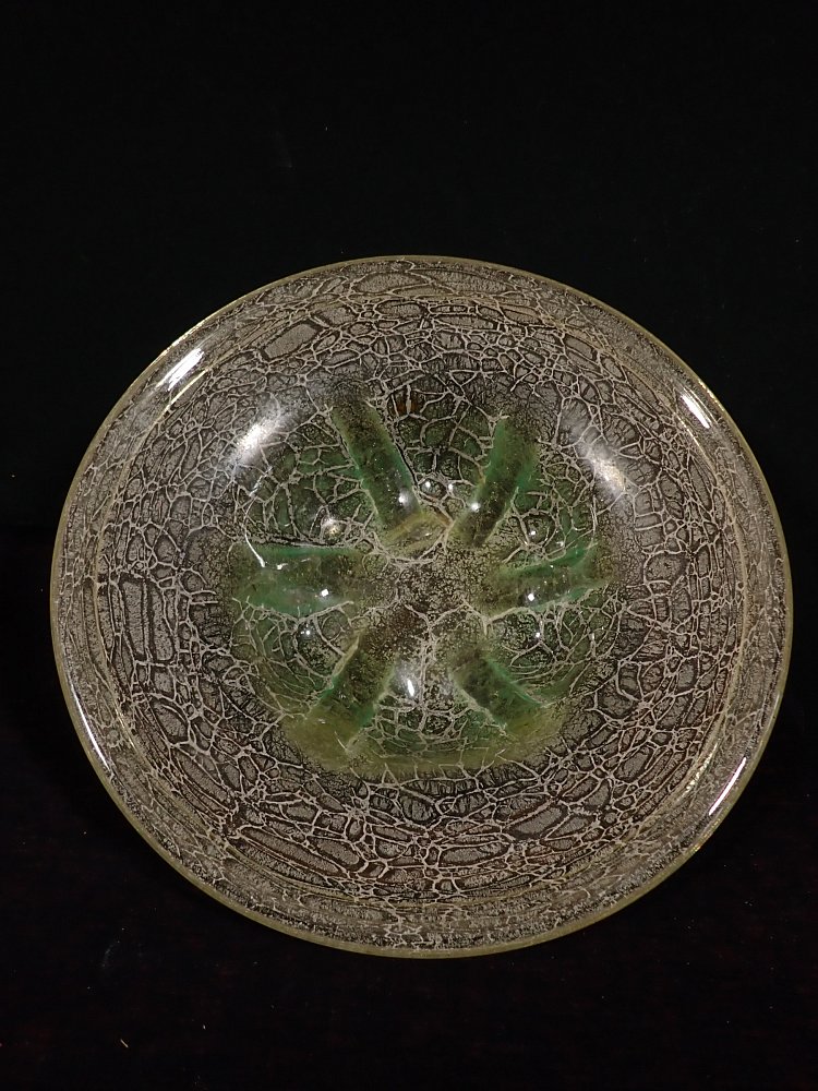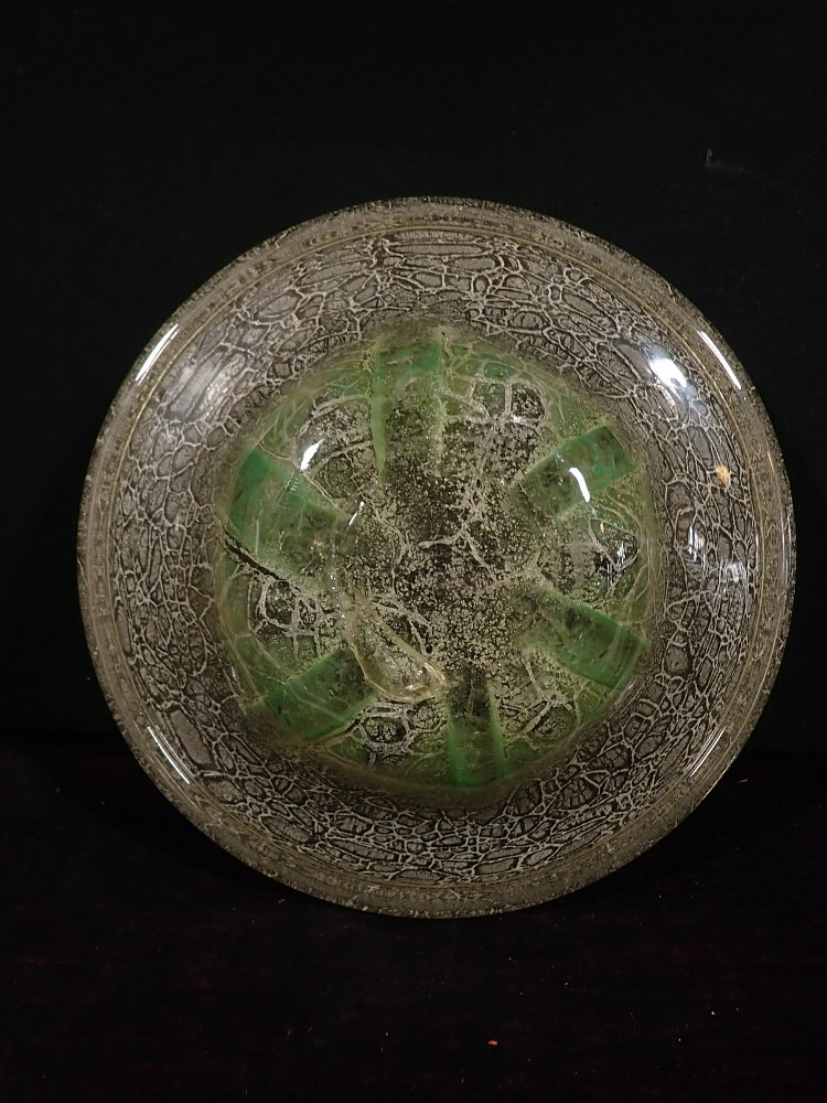 DetailansichtDie Schale besteht aus Glas mit einem Farbverlauf von weiß zu grün mit eingeschlossenen silbrig-weißen Partikeln oder Pulvereinschlüssen. Auf der Unterseite...
