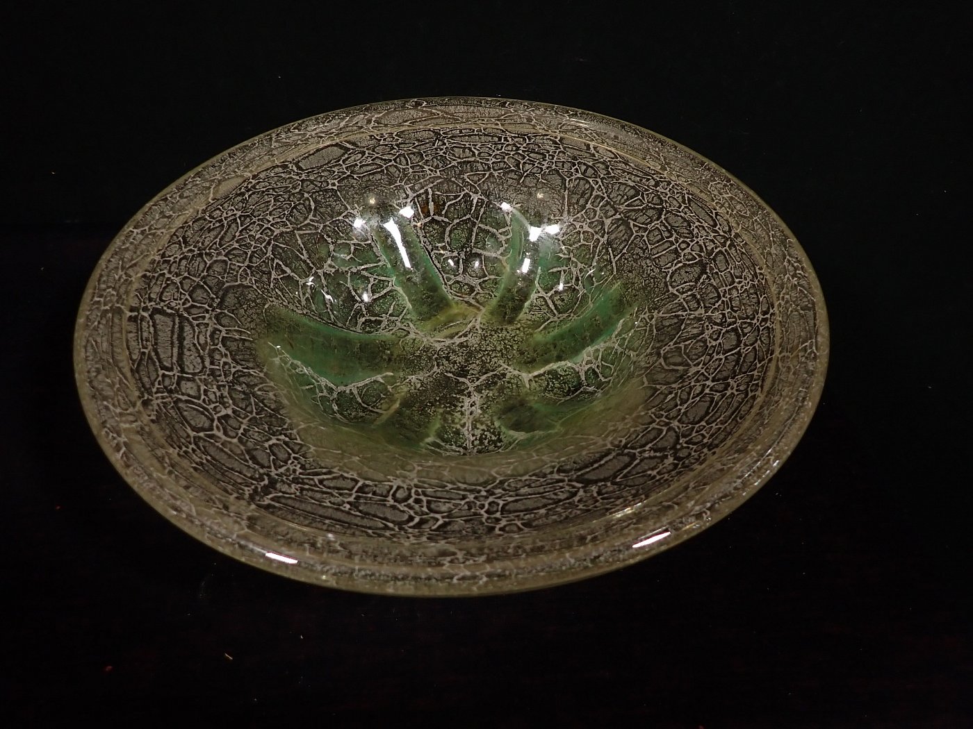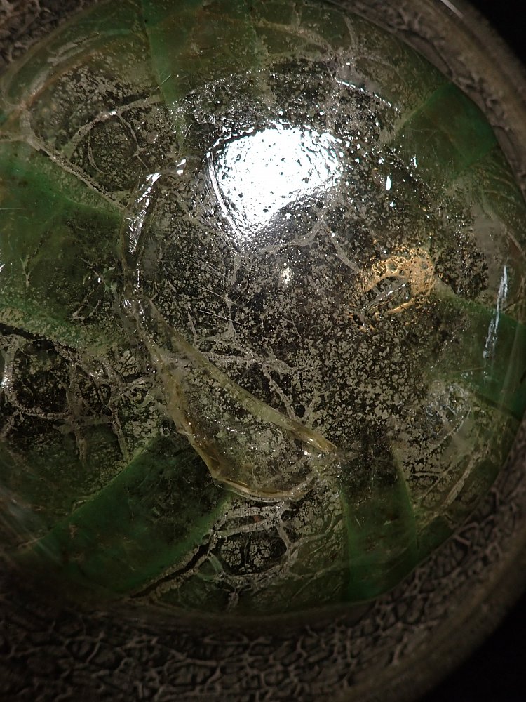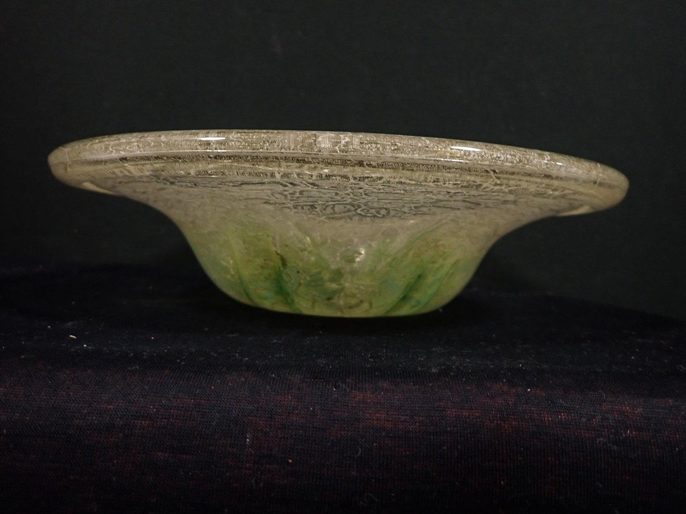 DetailansichtDie Schale besteht aus Glas mit einem Farbverlauf von weiß zu grün mit eingeschlossenen silbrig-weißen Partikeln oder Pulvereinschlüssen.