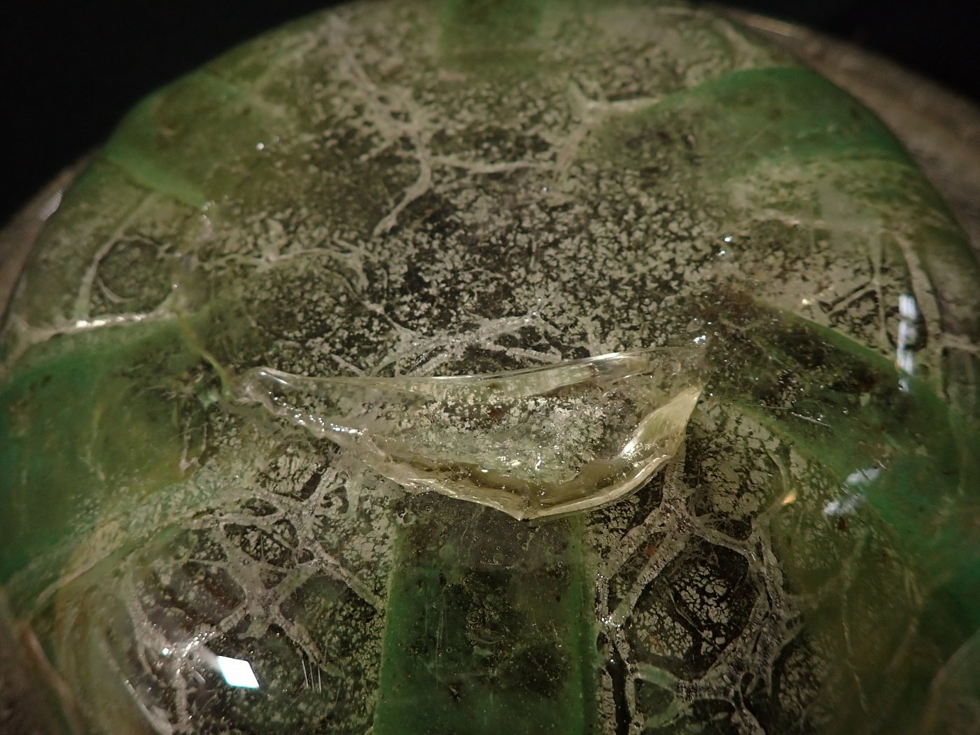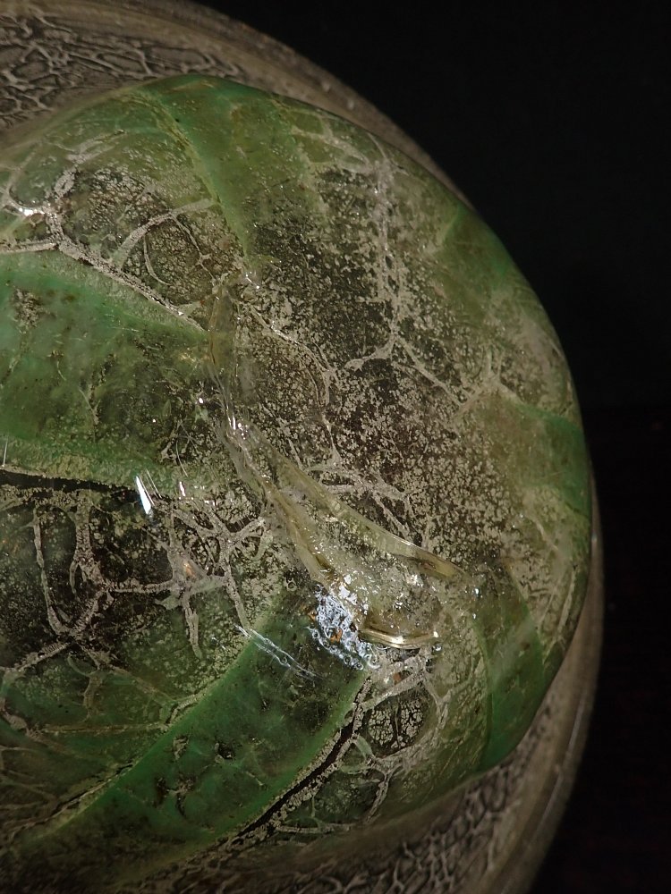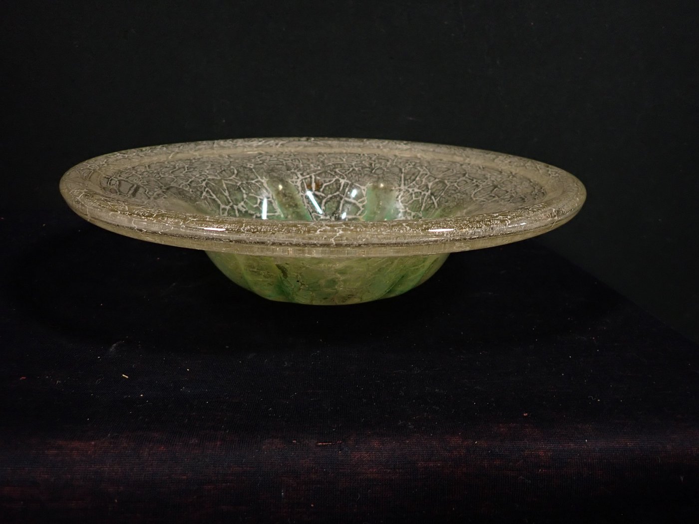 DetailansichtDie Schale besteht aus Glas mit einem Farbverlauf von weiß zu grün mit eingeschlossenen silbrig-weißen Partikeln oder Pulvereinschlüssen.