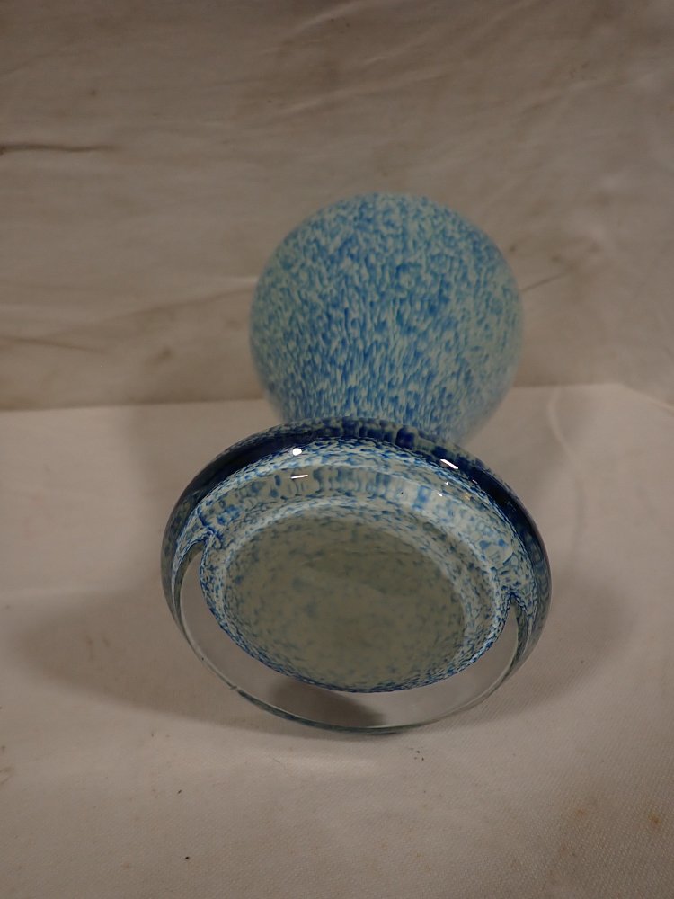 DetailansichtDie Vase besteht aus einem Klaren Glas in einer ovoid Form. Die blaue Farbe kommt von dem Netzartigen blasigen Muster im Glas.
