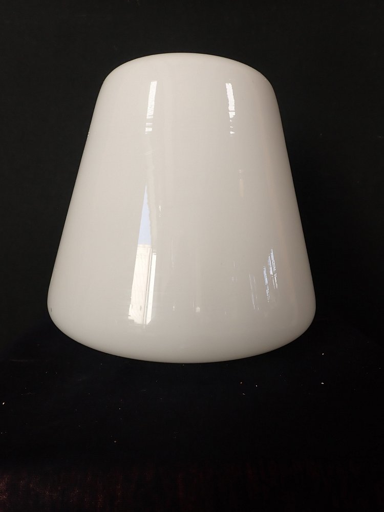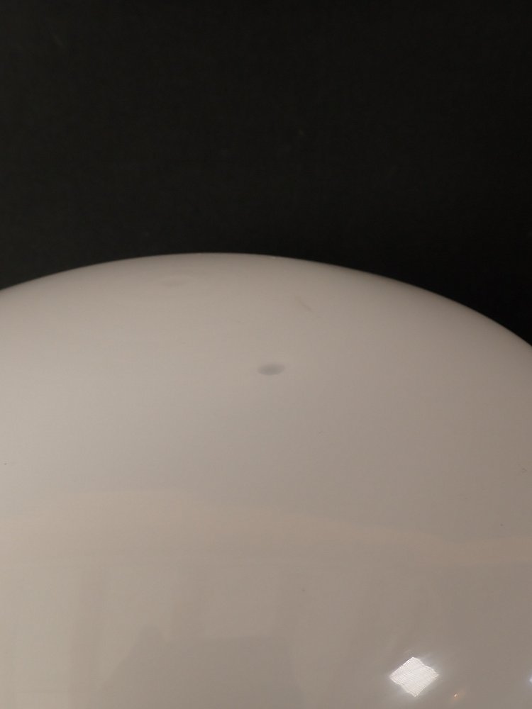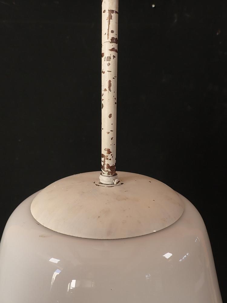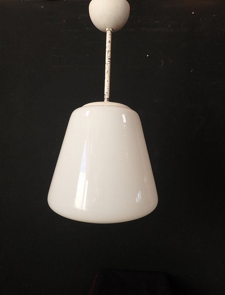 Klassische Hängeleuchte mit großem Glaskörper. Der Opalglaskörper ist mit einem kurzen Metallpendel ausgestattet, welches aktuell eine weiße Lackierung hat,...