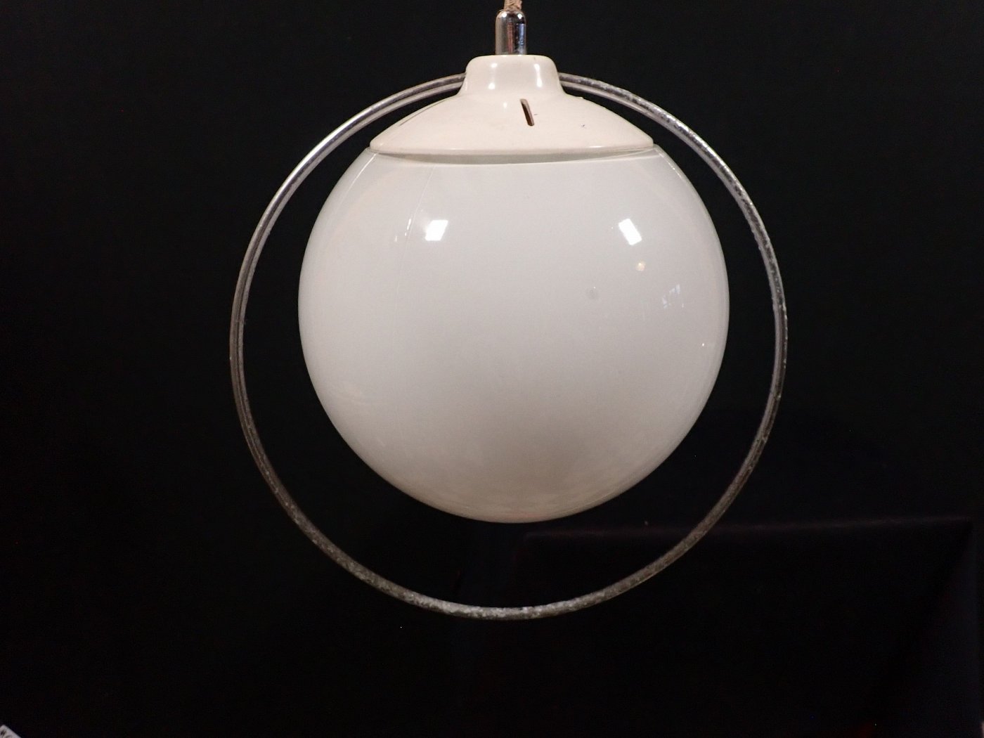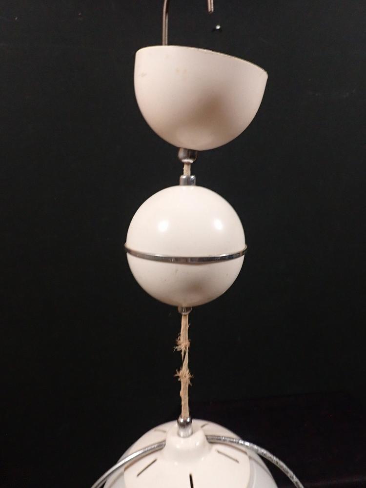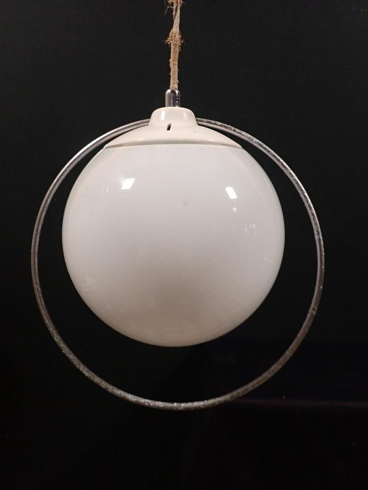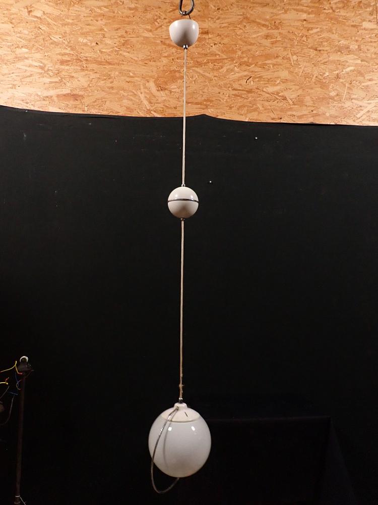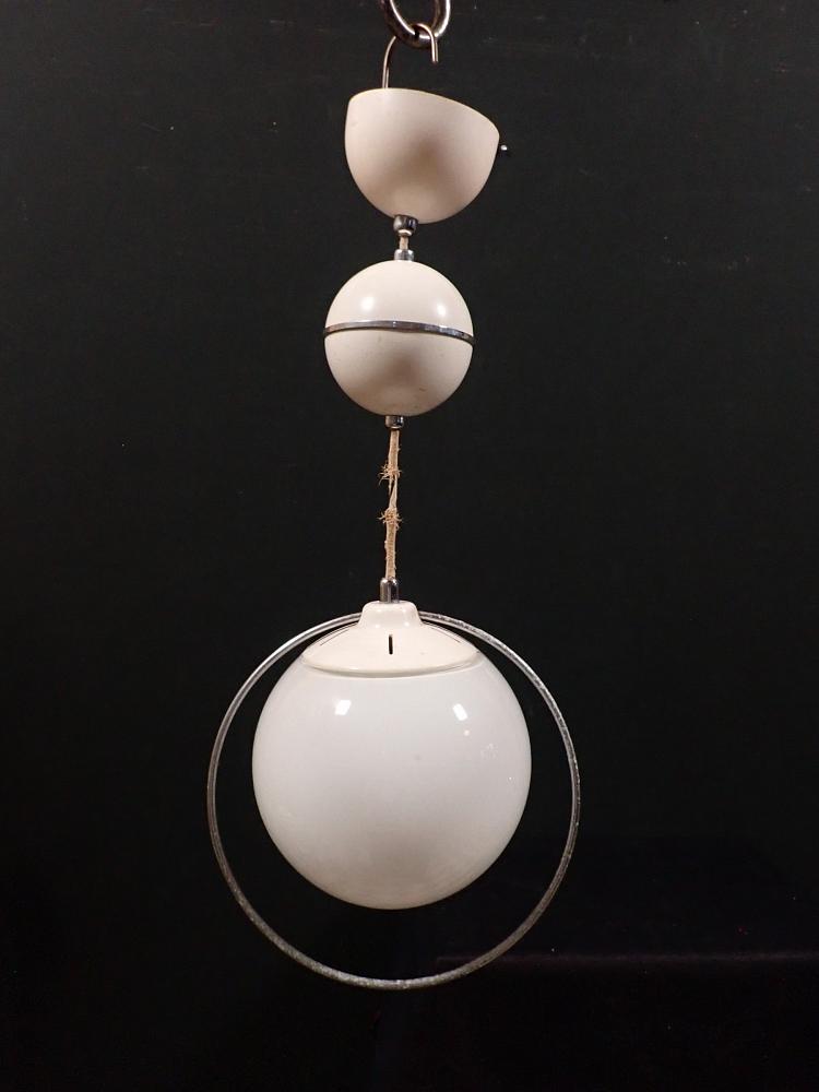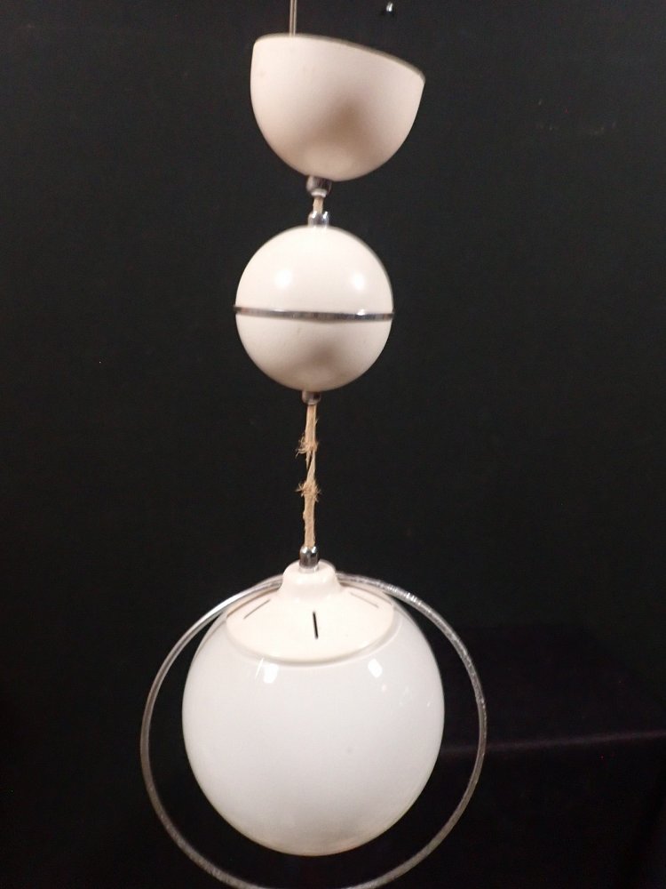 Die Leuchte besteht aus einem Kunststoffpendel mit Kunststoffbaldachin. Die Opal umfangene Gaskugel wird in das Kunststoffpendel eingehängt und wird von einem verchromten Metallring umrandet. Das Zugpendel funktioniert problemlos.
