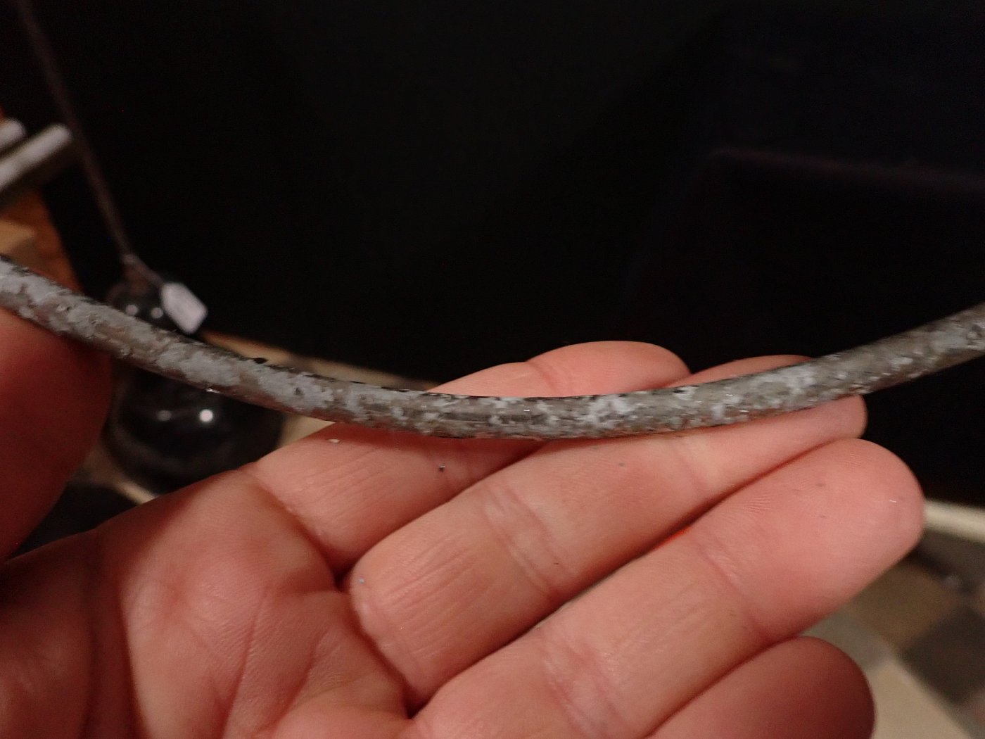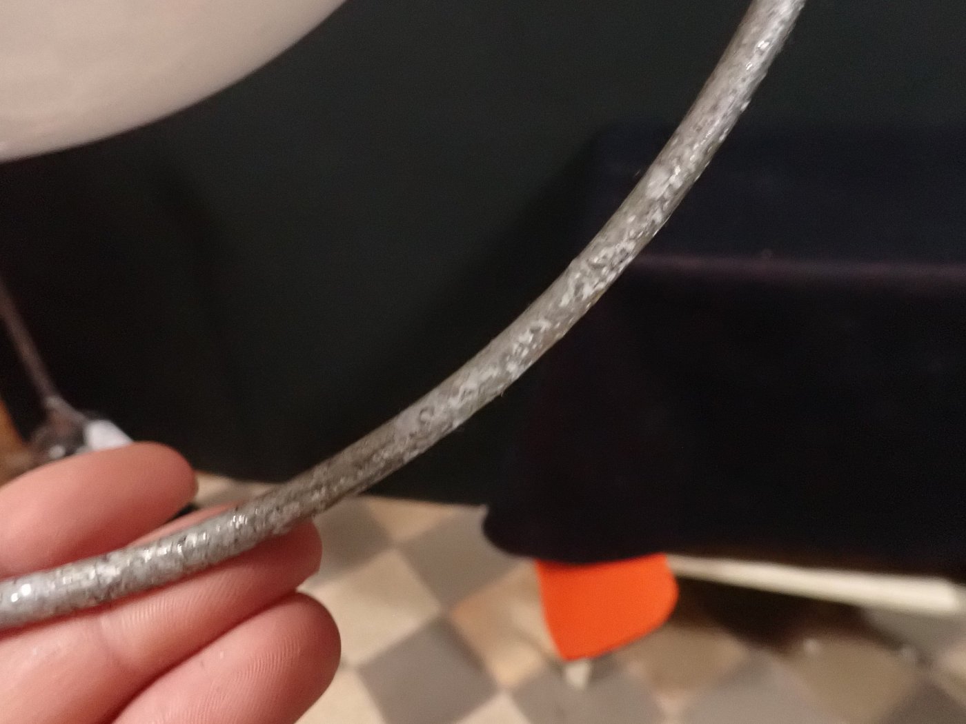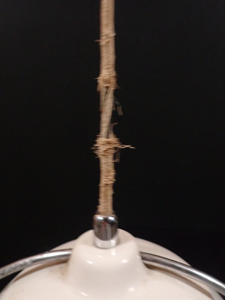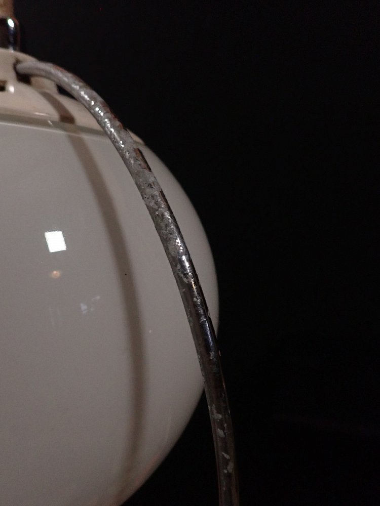 Das Stoffkabel ist an einer Stelle ausgefranst, und müsste erneuert werden. Am verchromten Metallring blättert die Verchromung ab und ist stark angelaufen.