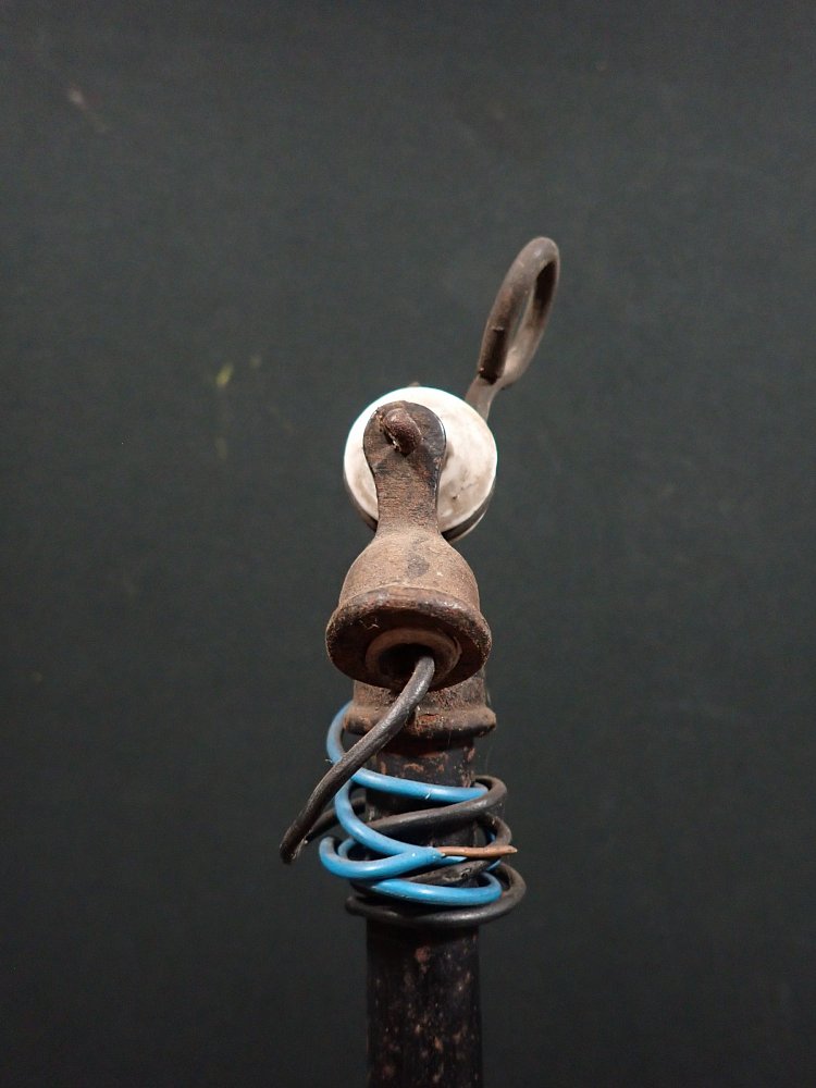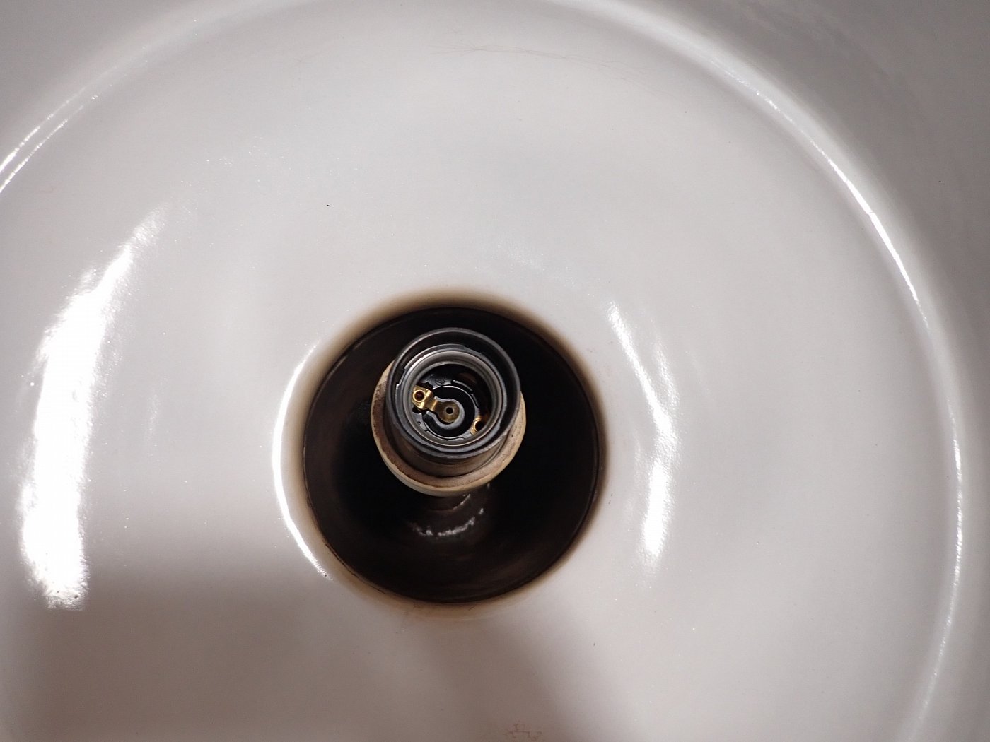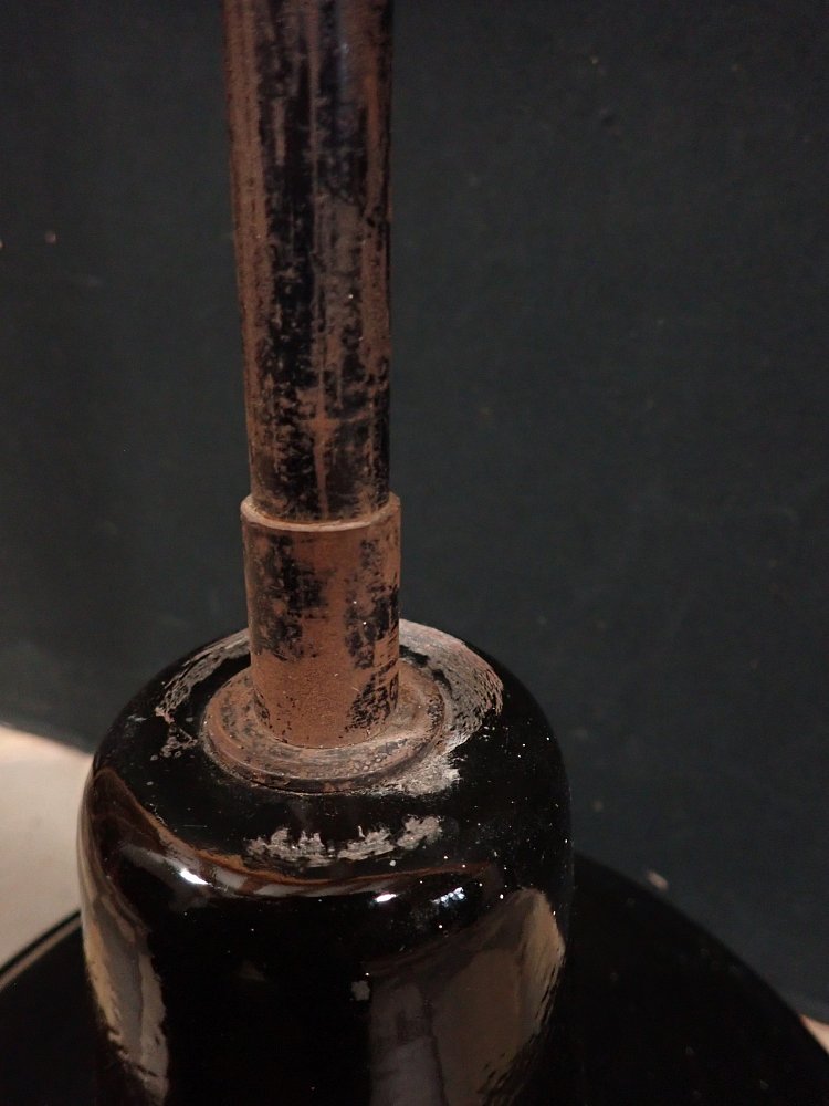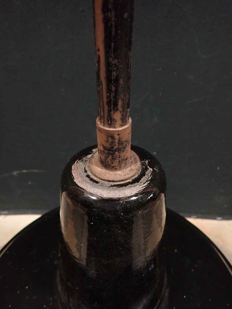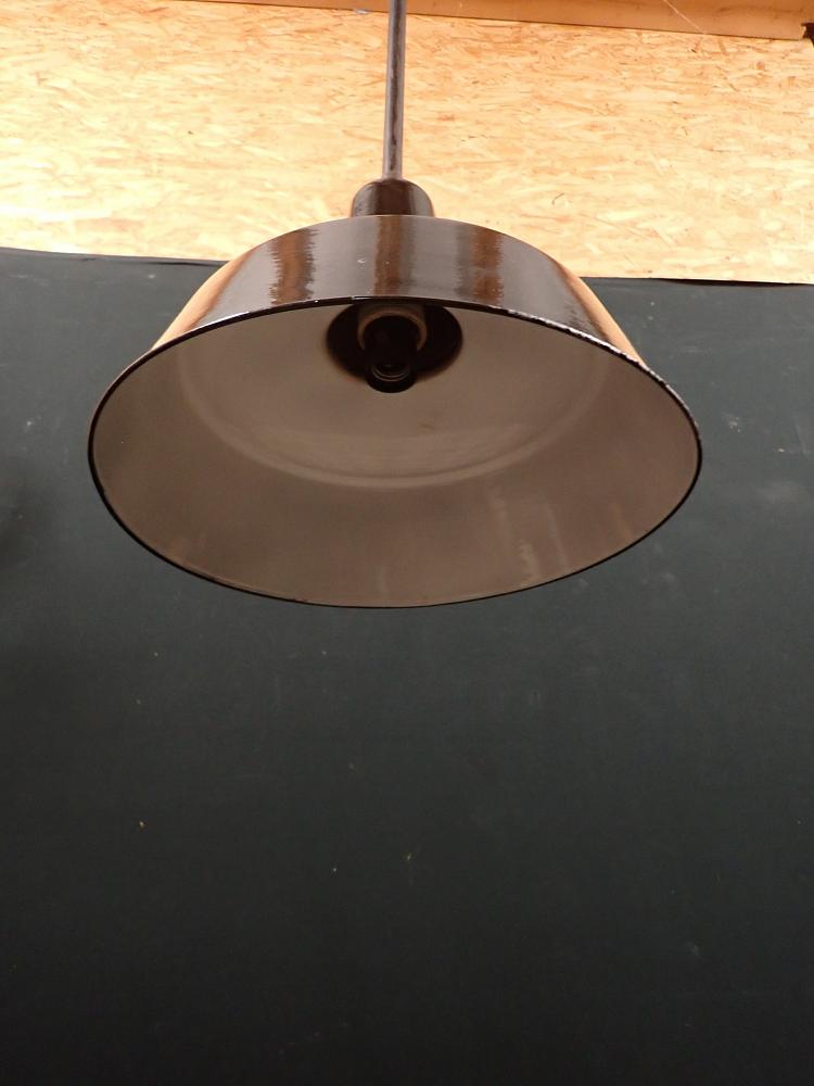 Der Schirm der Leuchte ist ganz klassisch, außen schwarz und innen weiß emailliert und befindet sich ausgenommen von wenigen kleinen Abplatzern, die für Emaille so typisch sind in einem guten Zustand.
