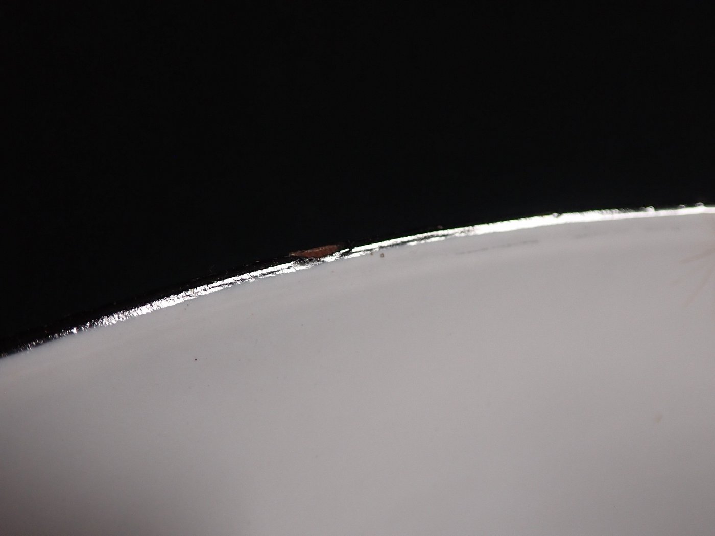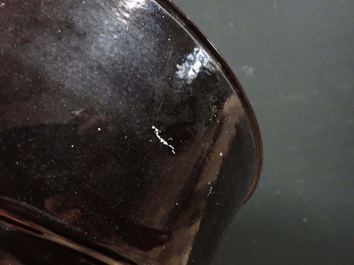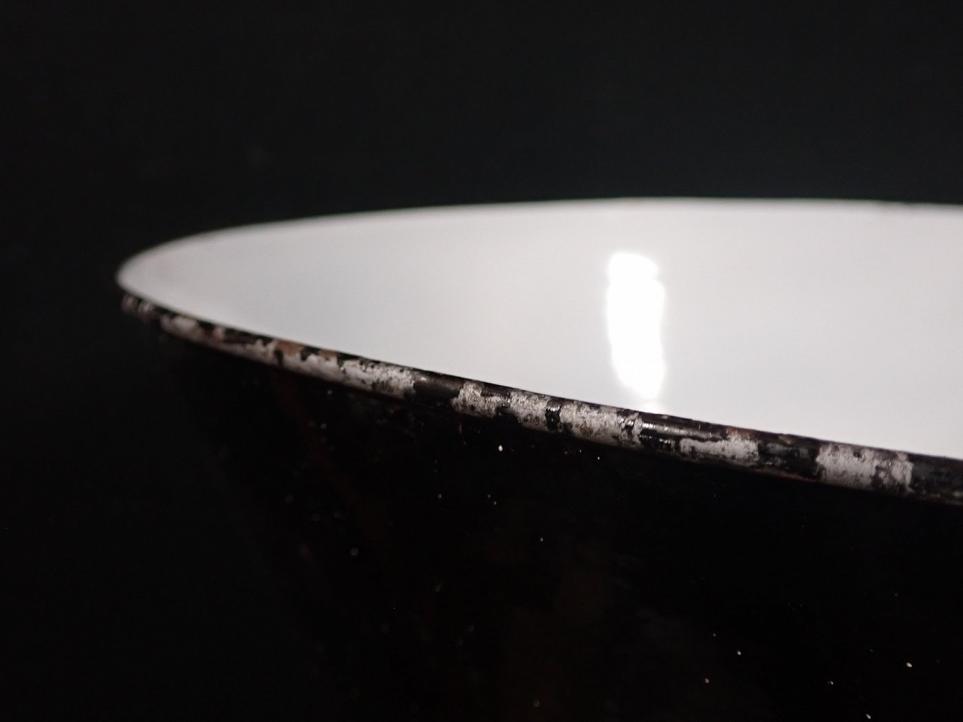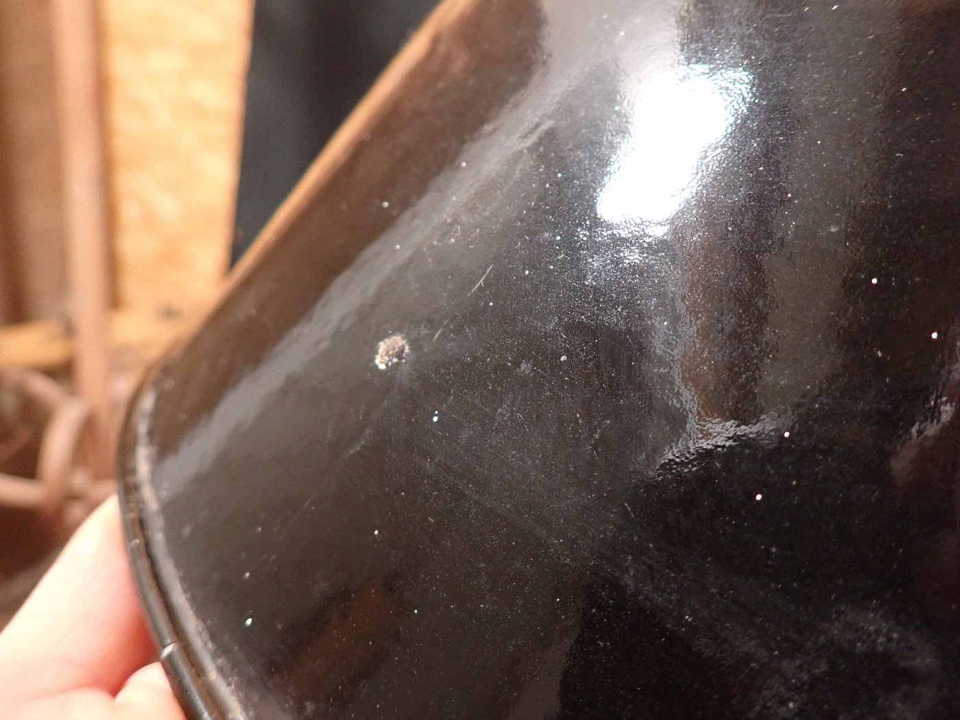 Der Schirm der Leuchte ist ganz klassisch, außen schwarz und innen weiß emailliert und befindet sich ausgenommen von wenigen kleinen Abplatzern, die für Emaille so typisch sind in einem guten Zustand.