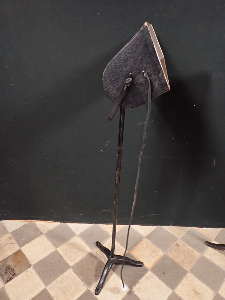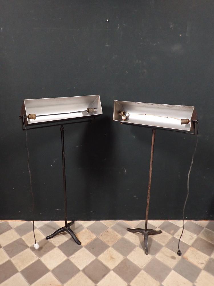 Industrieleuchtenpaar mit großem Schirm. Die beiden Leuchten sind mit schweren Standfüßen ausgestattet, welche den Strahlern einen sicheren Stand gewährleisten. In...