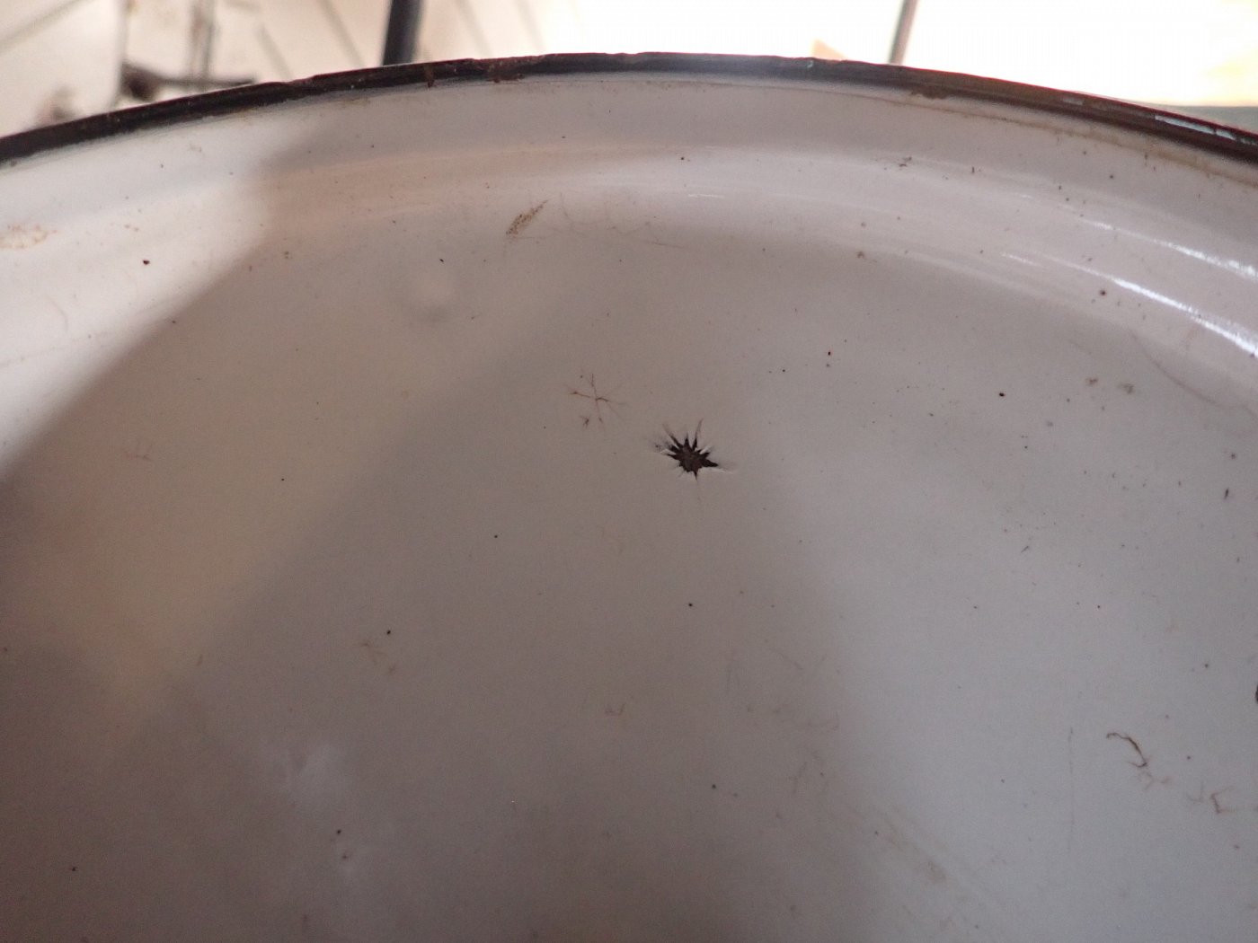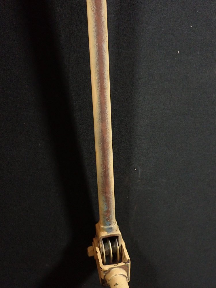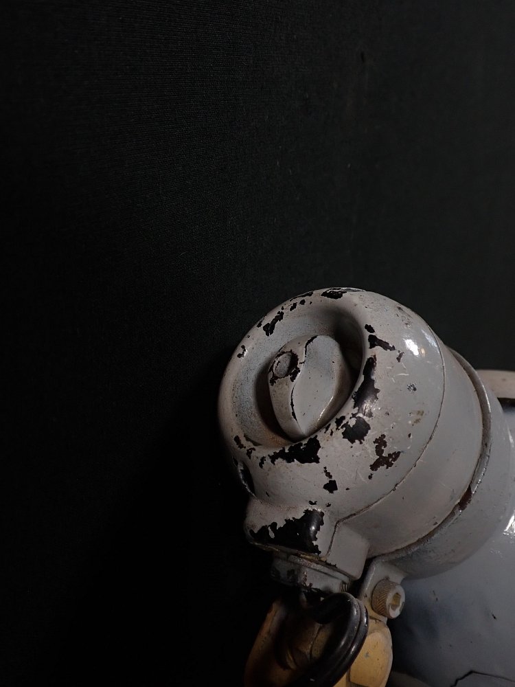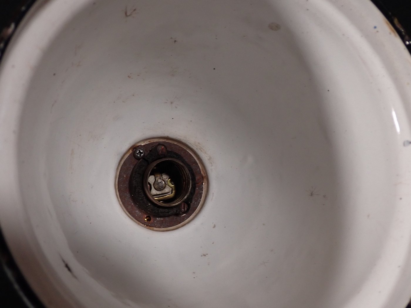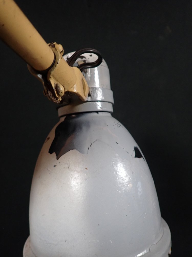 Die Leuchte hat deutliche Gebrauchsspuren und unterschiedlichste Farbschichten, ein echtes Charakterstück sozusagen. Vor einer weiteren Nutzung braucht sie auf jeden Fall eine neue Verkabelung, um wieder sicher genutzt werden zu können.