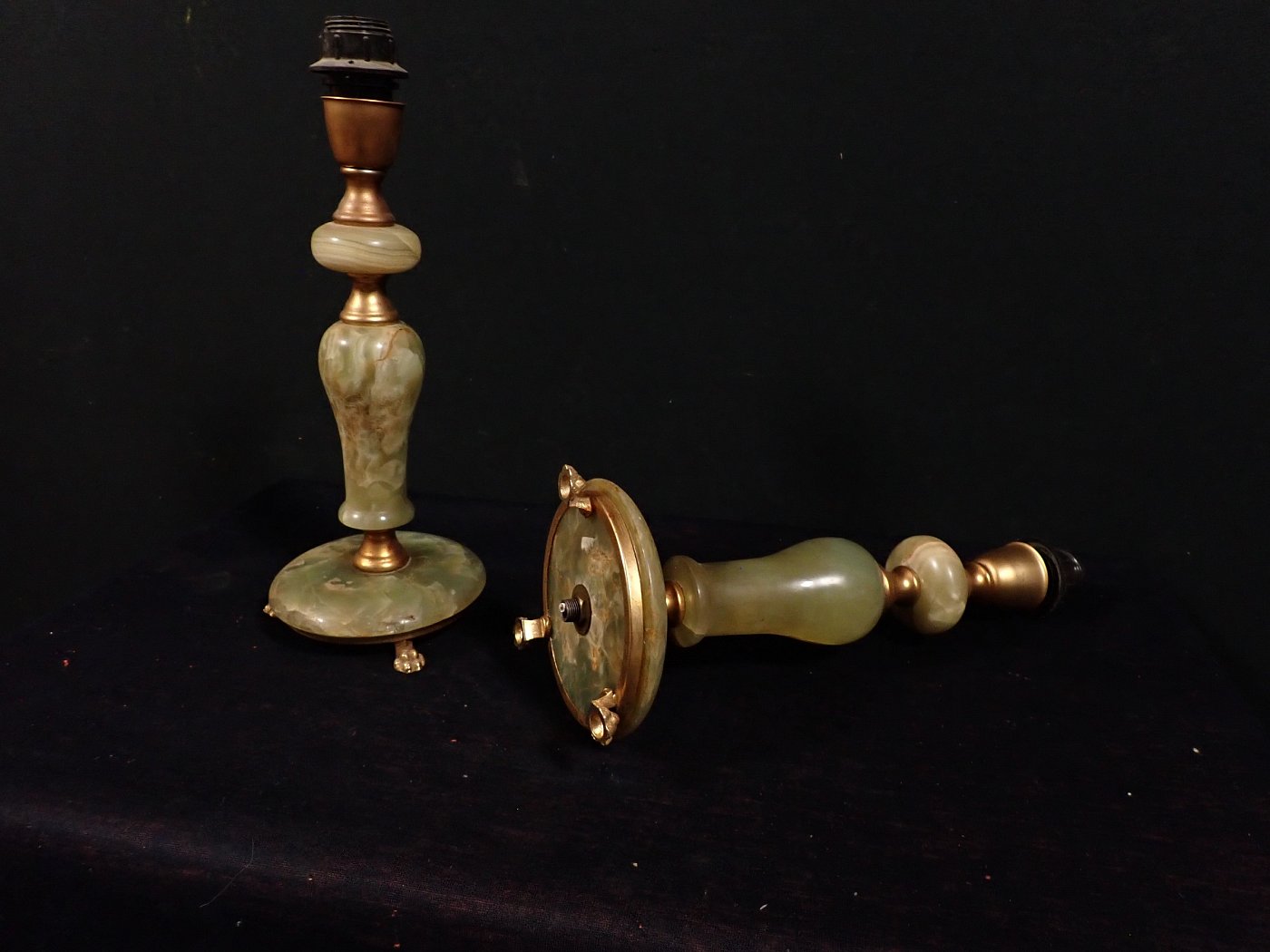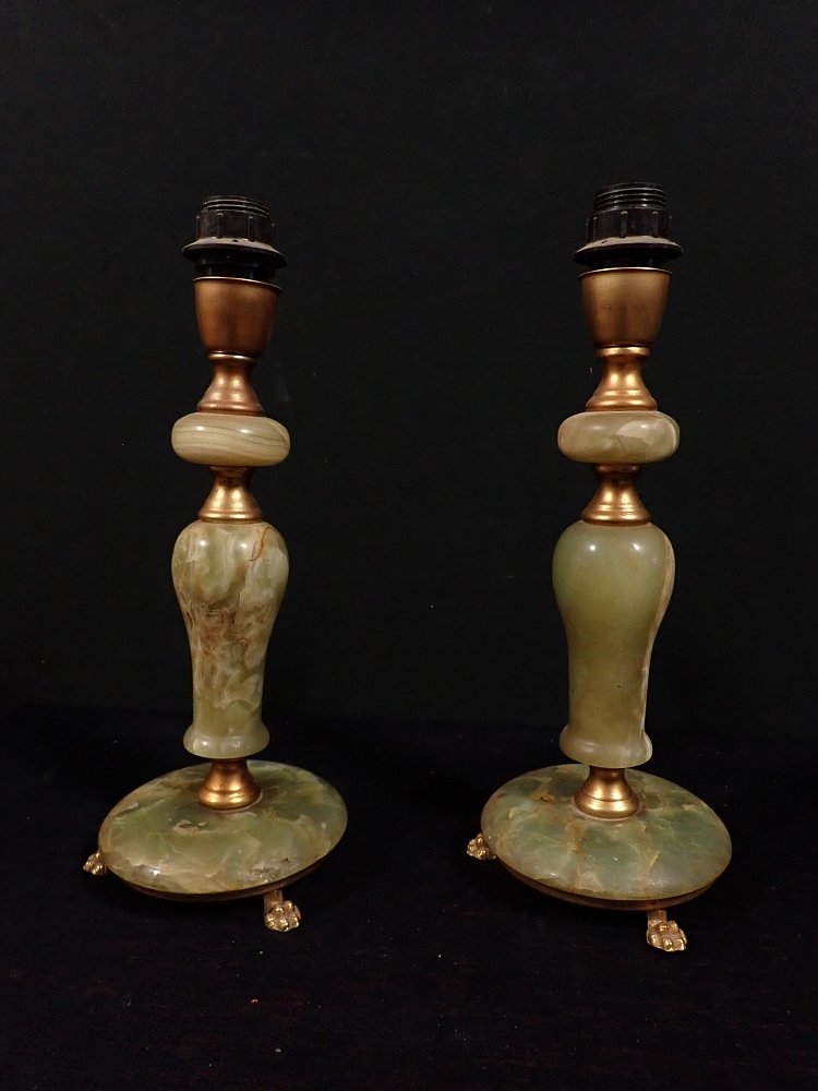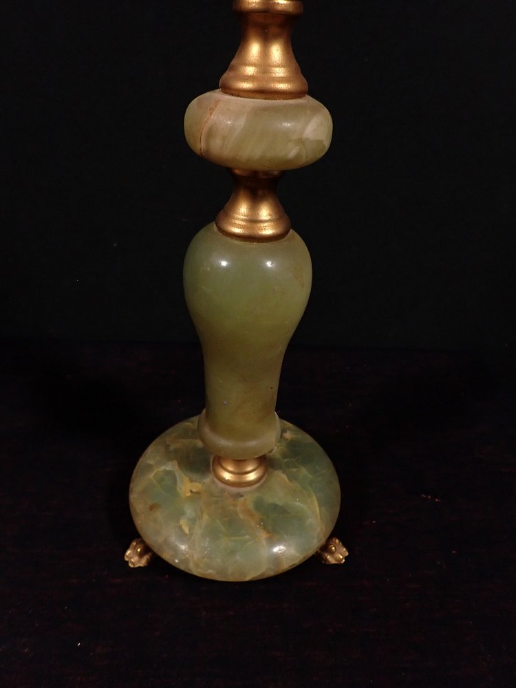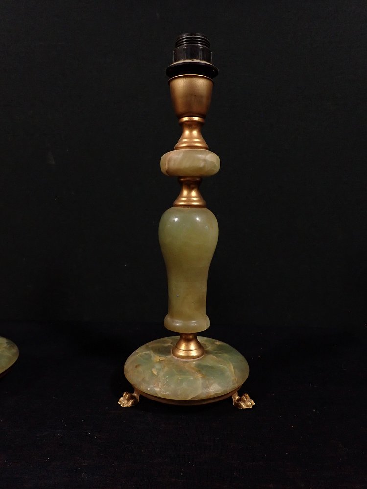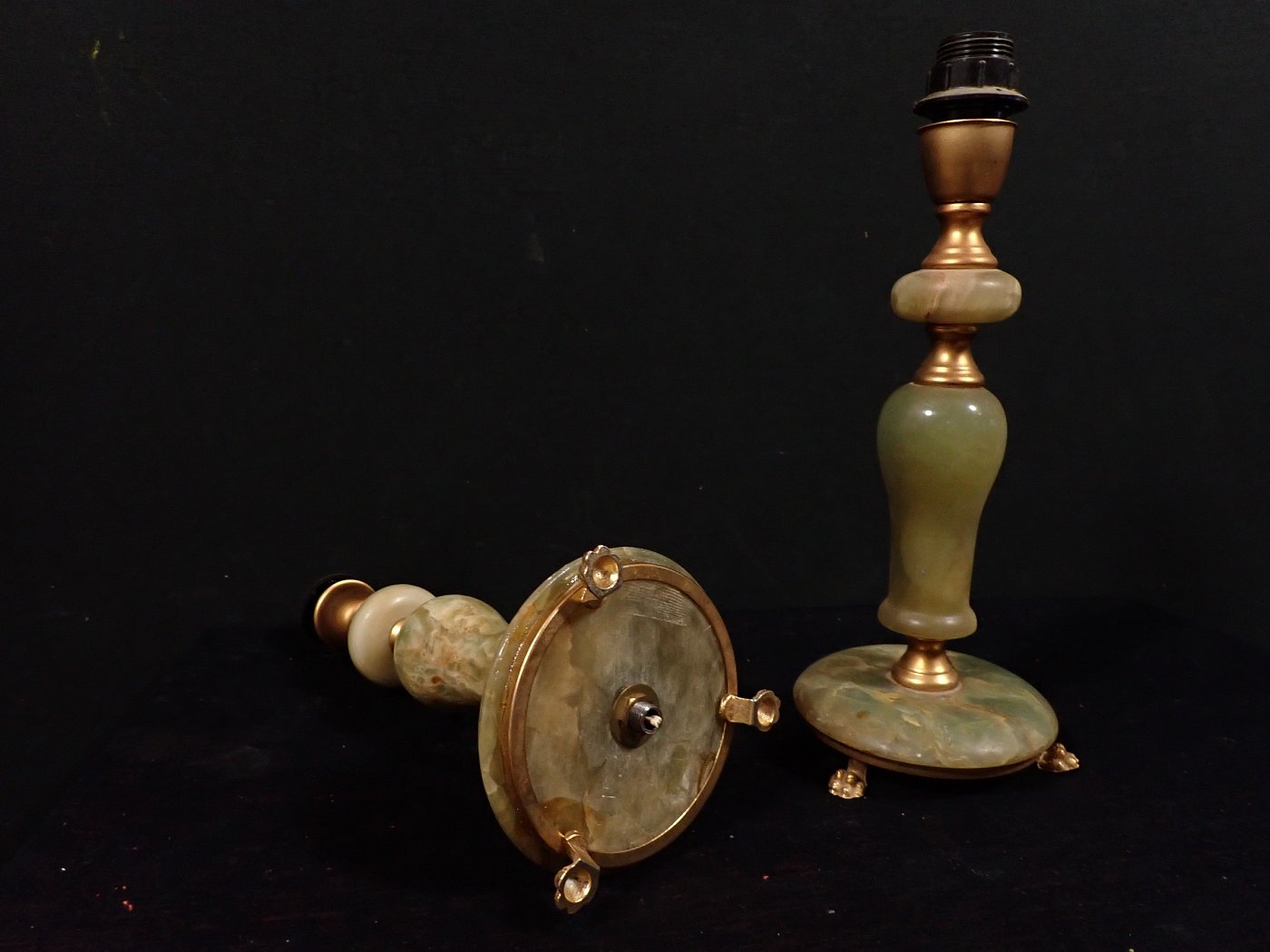 Das Tischleuchten paar besteht aus grünlichem Marmor und steht auf goldenen Messingfüßen. Zwischen den Marmor Elementen sind verzierte Messing Details angebracht, was einen angenehmen Kontrast zum Marmor schafft. Schirme sind keine mehr dabei, was die Möglichkeit schafft den passenden Schirm nach eigenem Geschmack selbst auszusuchen.