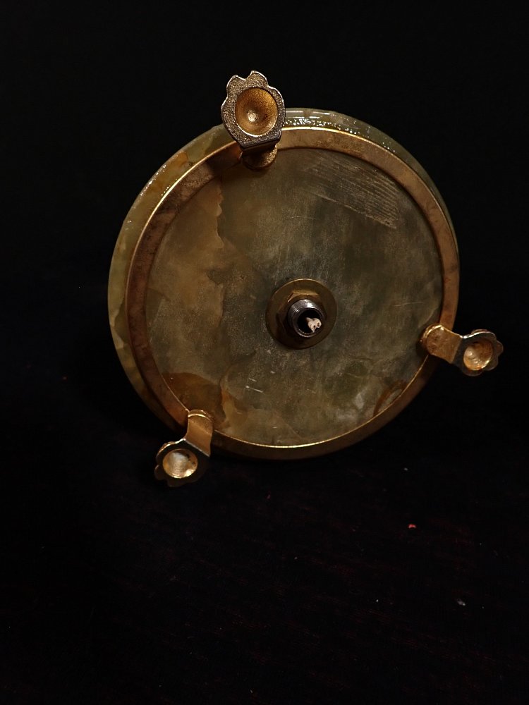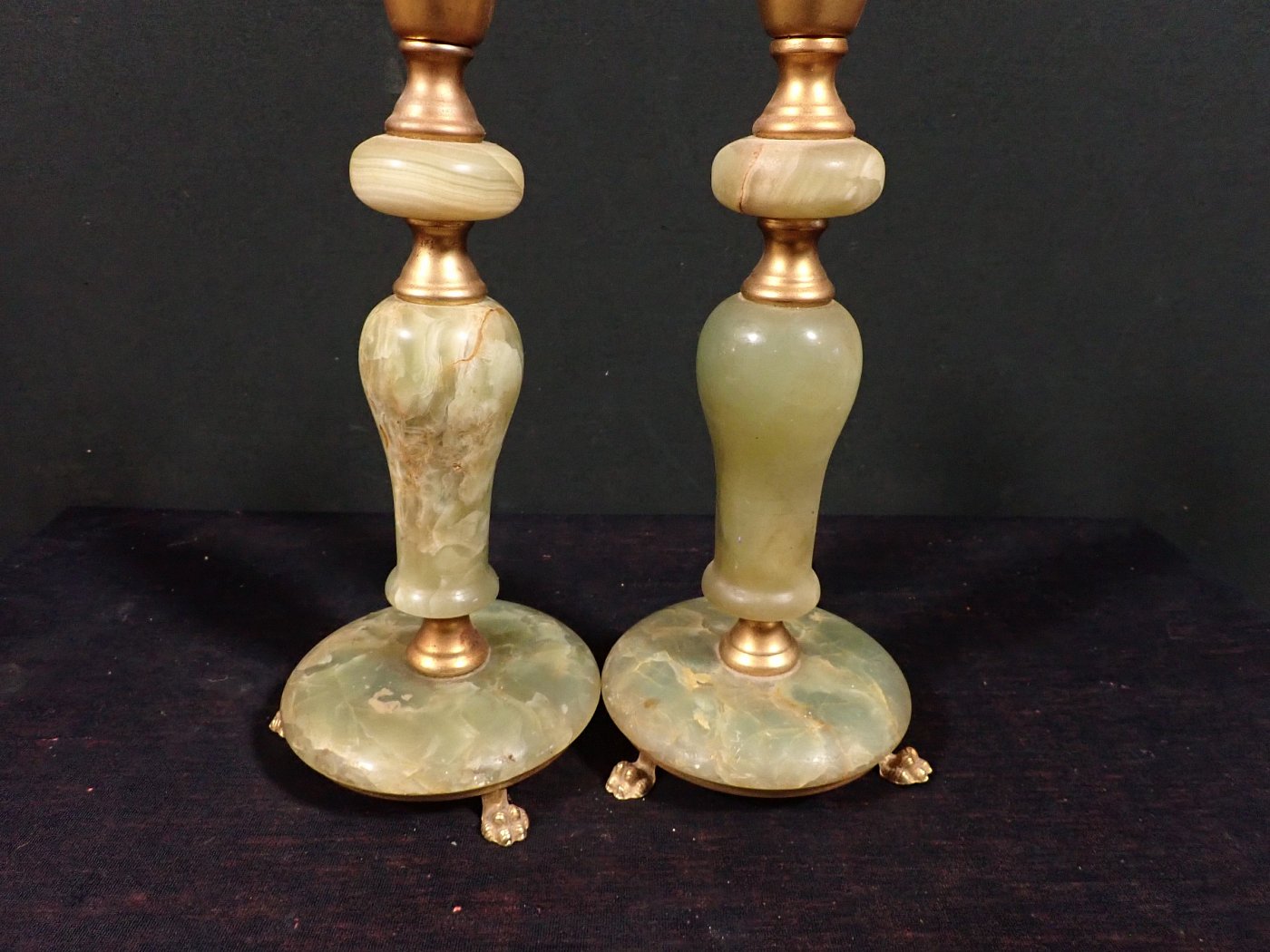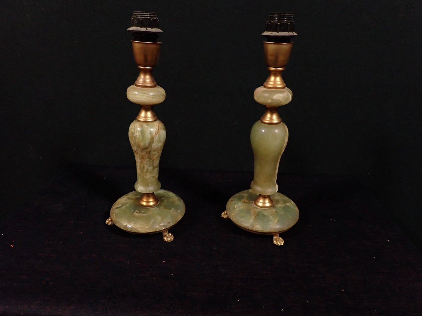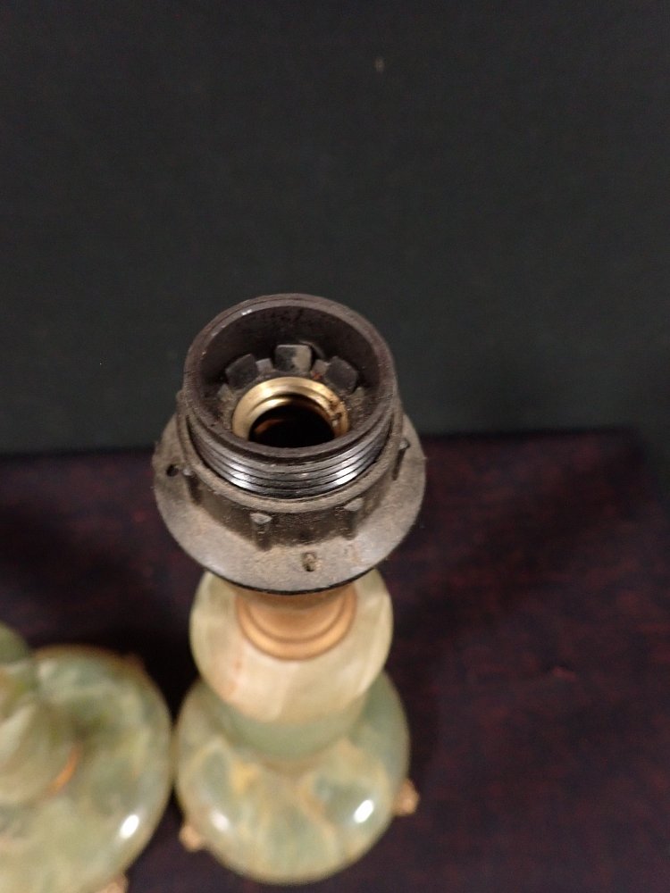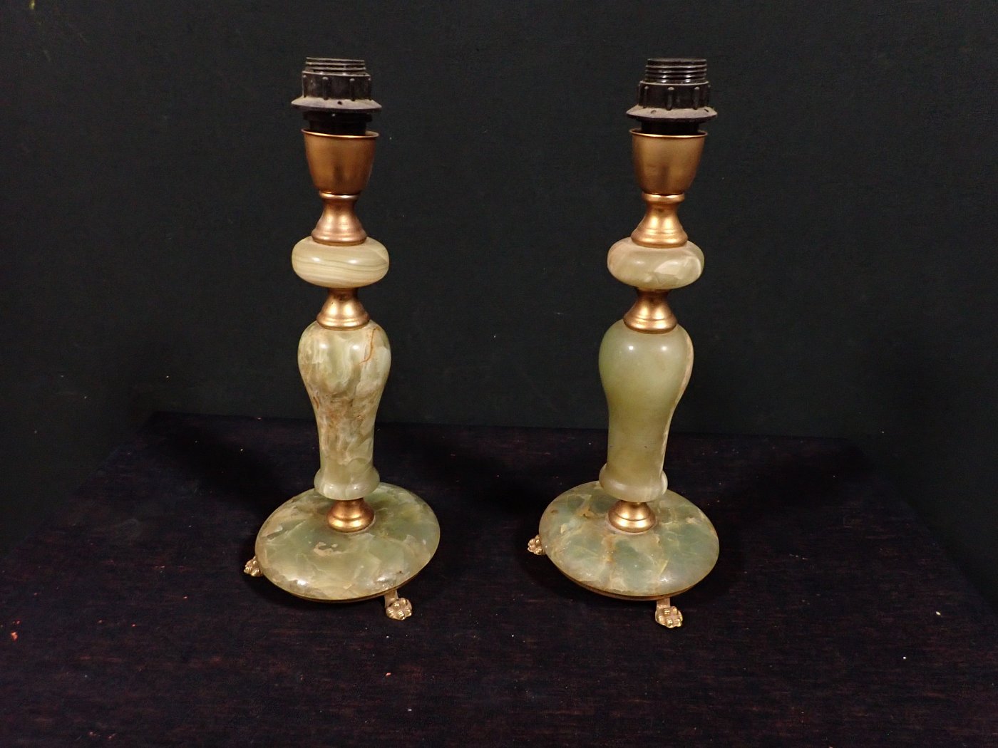 Das Tischleuchten paar besteht aus grünlichem Marmor und steht auf goldenen Messingfüßen. Zwischen den Marmor Elementen sind verzierte Messing Details angebracht, was einen angenehmen Kontrast zum Marmor schafft. Schirme sind keine mehr dabei, was die Möglichkeit schafft den passenden Schirm nach eigenem Geschmack selbst auszusuchen.