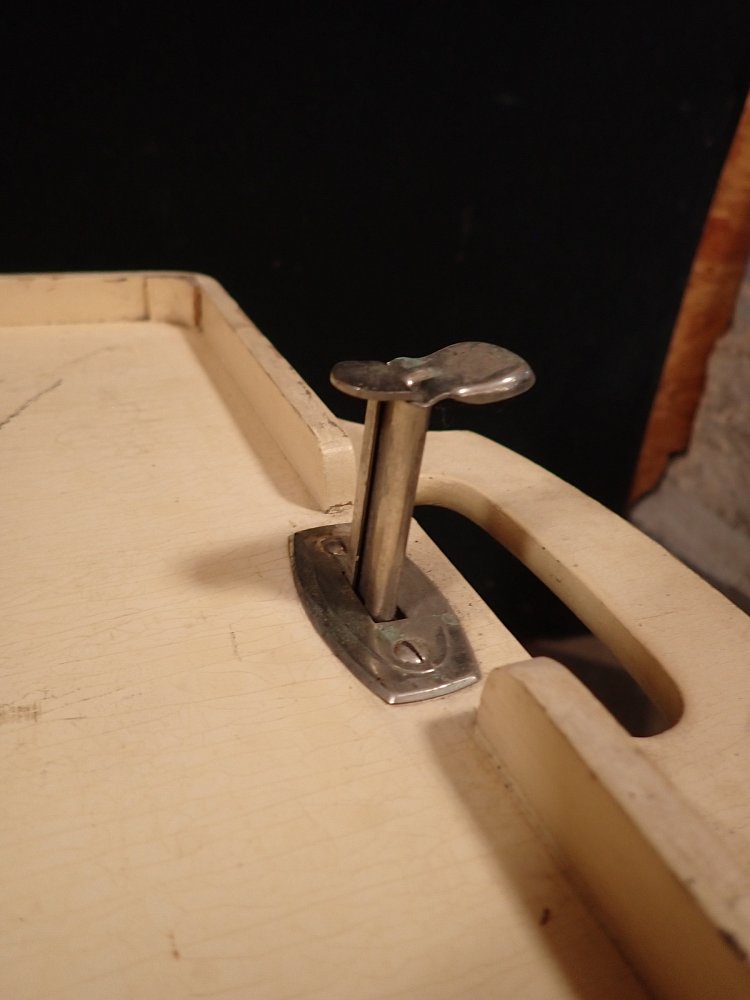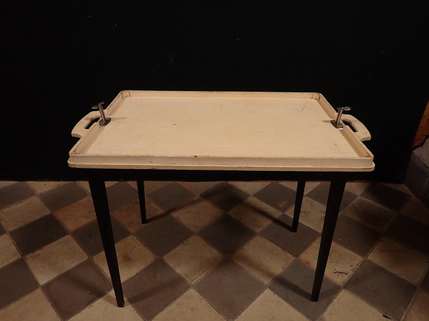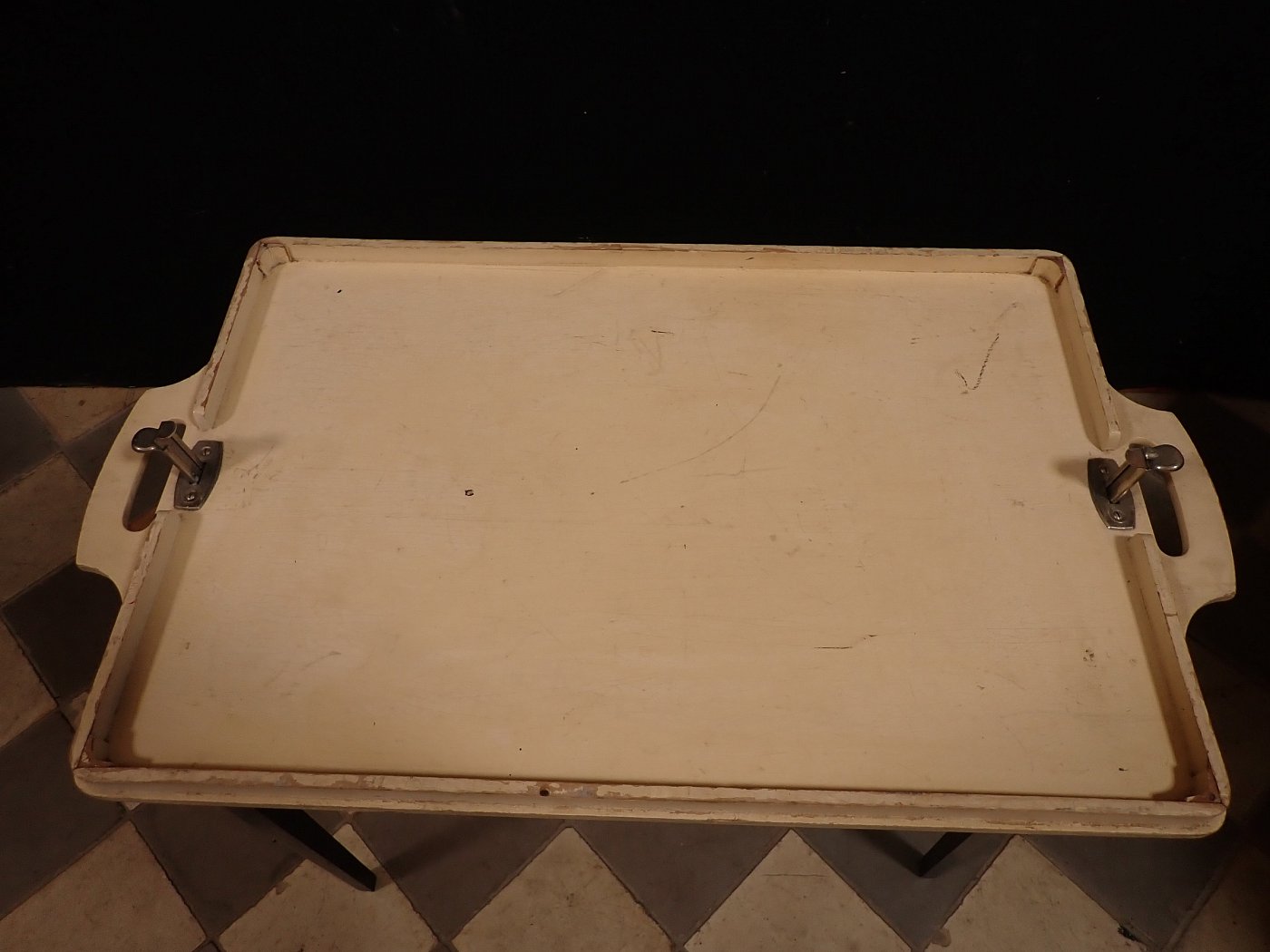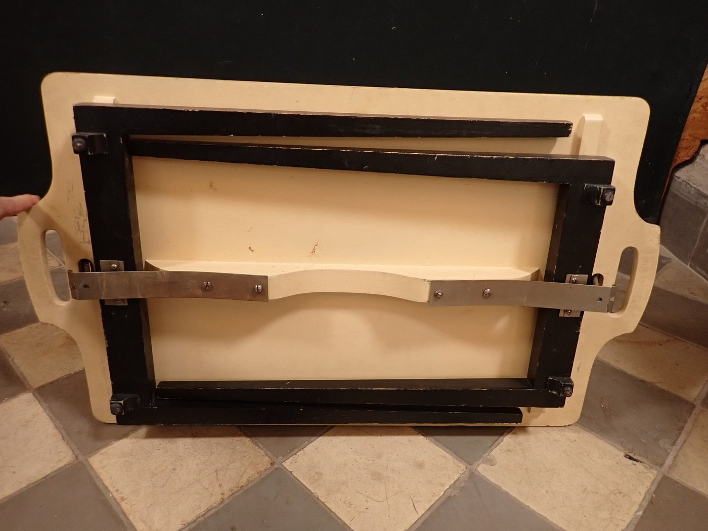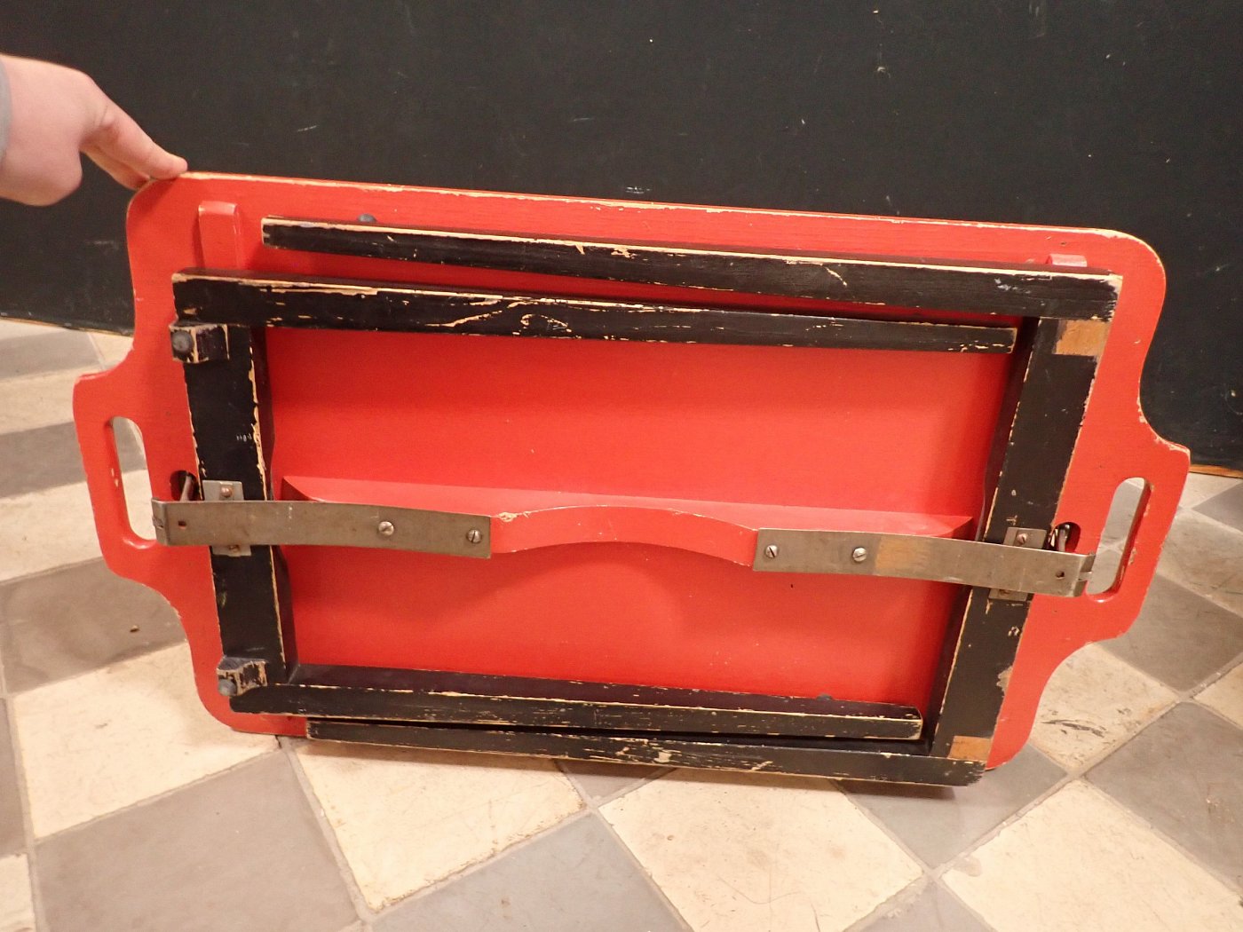 Die Tischplatte besteht aus farbig lackiertem Holz, die Füße bestehen aus schwarz lackiertem Holz. Über die zwei Hebel neben den Griffen sind die Füße mechanisch ausklappbar und wieder einklappbar. Praktisch ist der Tisch z.B. an einem vollen Frühstückstisch, zum Abstellen des Brotkörbchens oder wenn man sich das Frühstück lieber gleich ans Bett bringen lassen möchte.