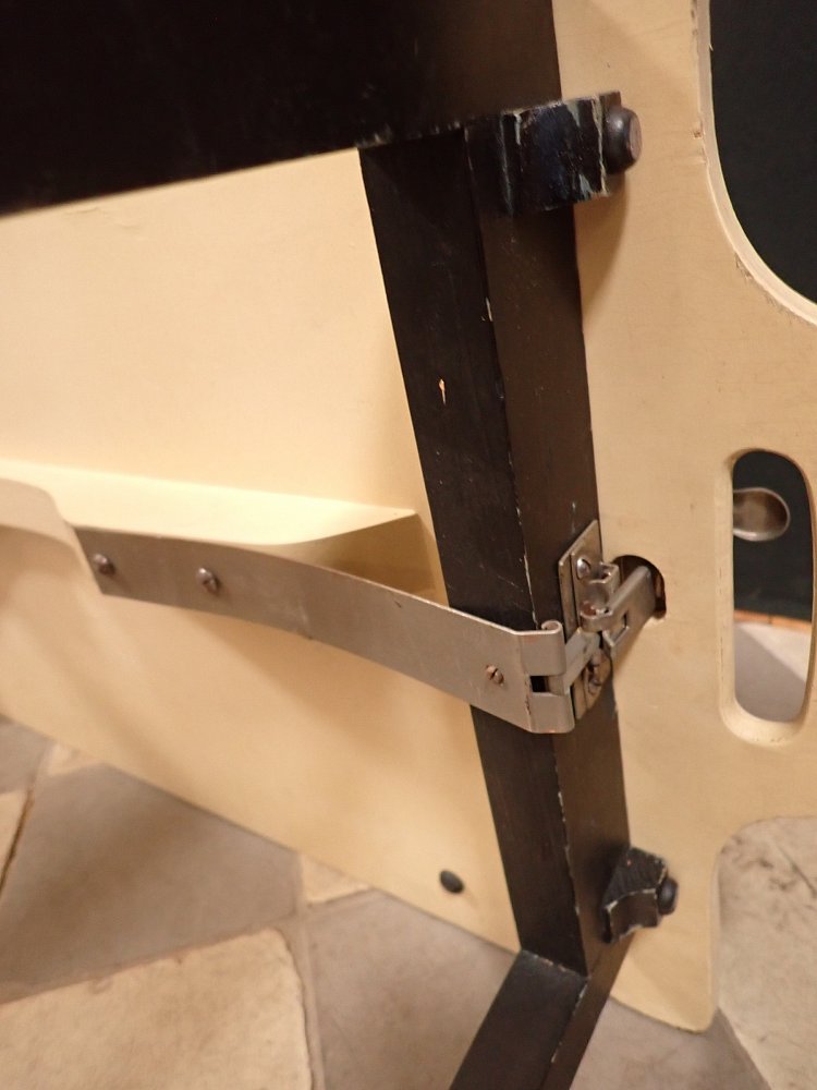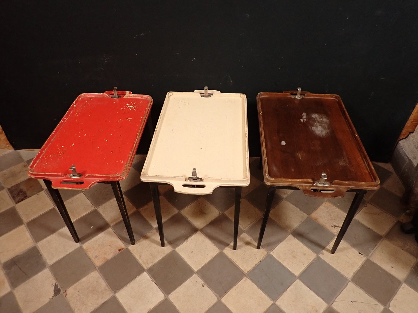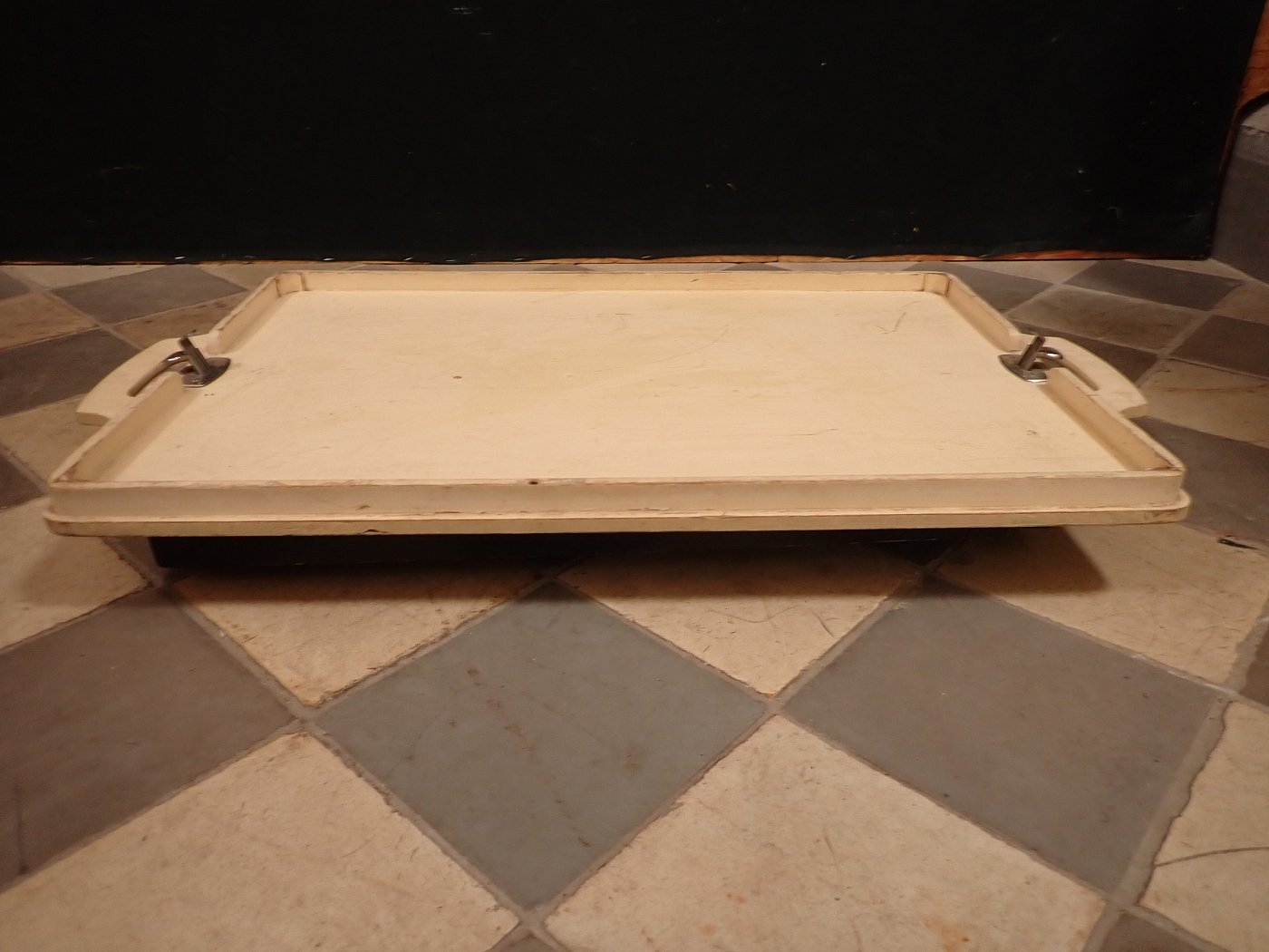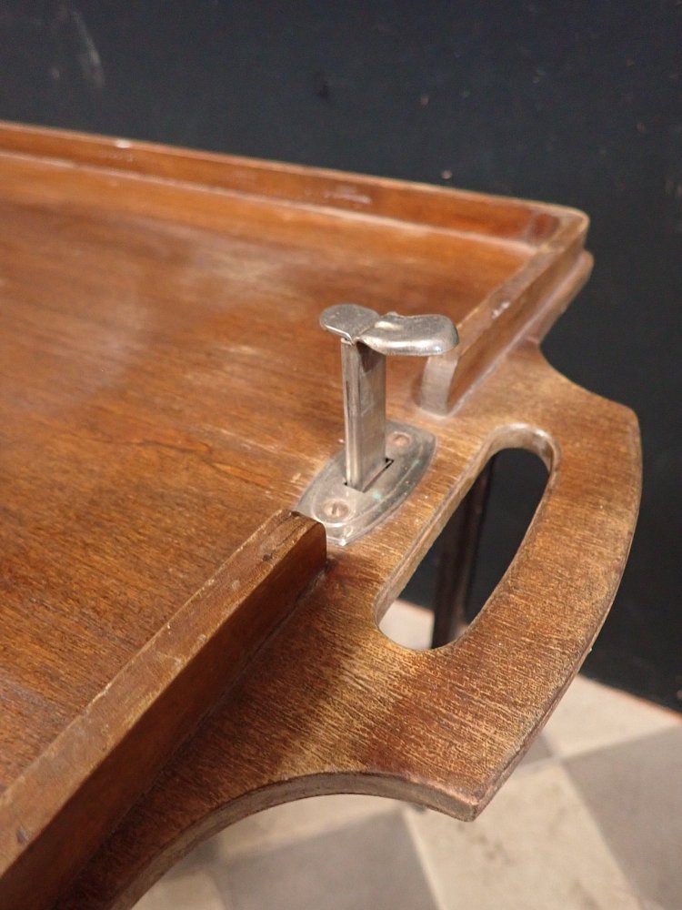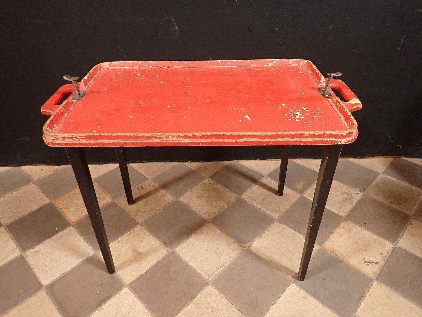 Die Tischplatte besteht aus farbig lackiertem Holz, die Füße bestehen aus schwarz lackiertem Holz. Über die zwei Hebel neben den Griffen sind die Füße mechanisch ausklappbar und wieder einklappbar. Praktisch ist der Tisch z.B. an einem vollen Frühstückstisch, zum Abstellen des Brotkörbchens oder wenn man sich das Frühstück lieber gleich ans Bett bringen lassen möchte.