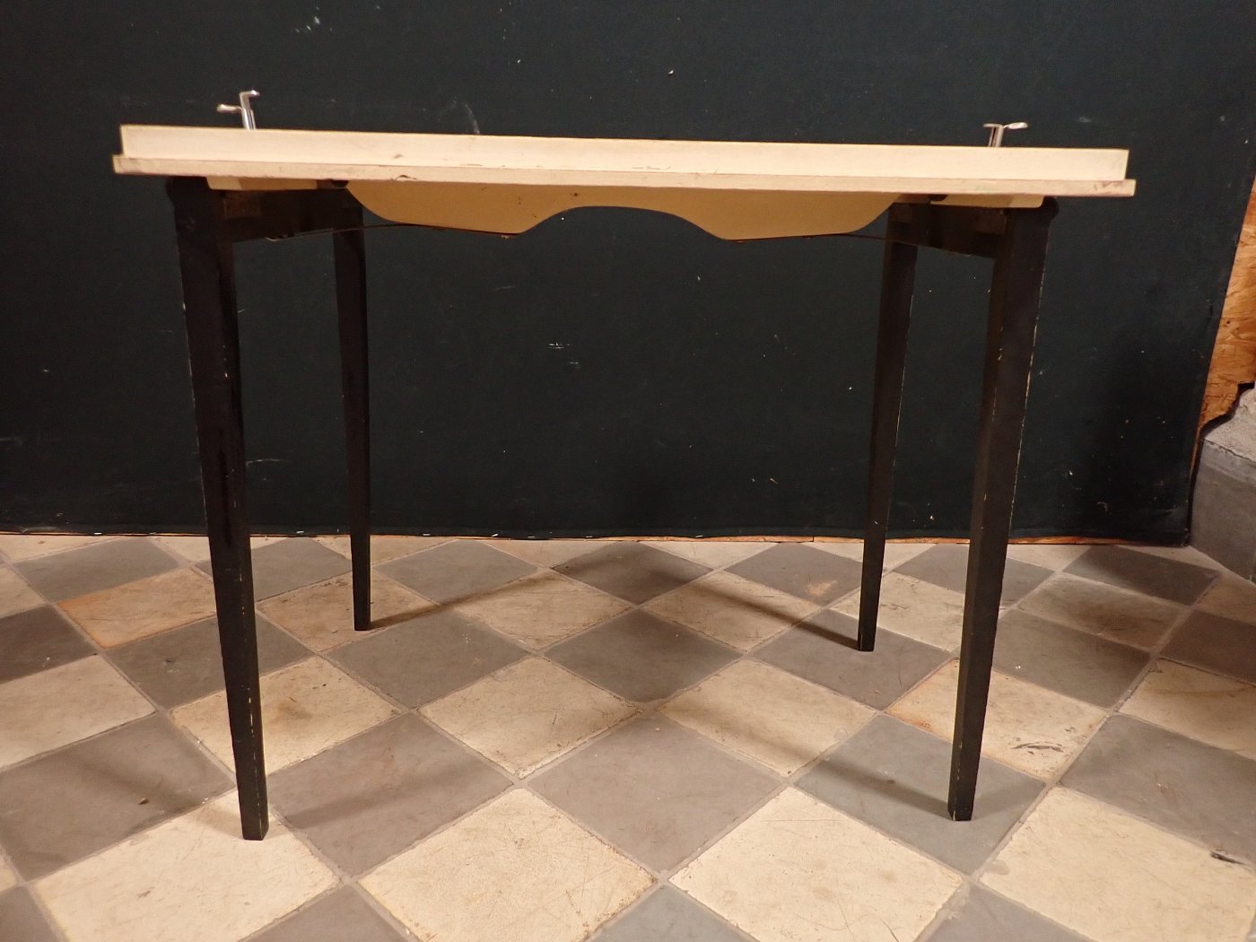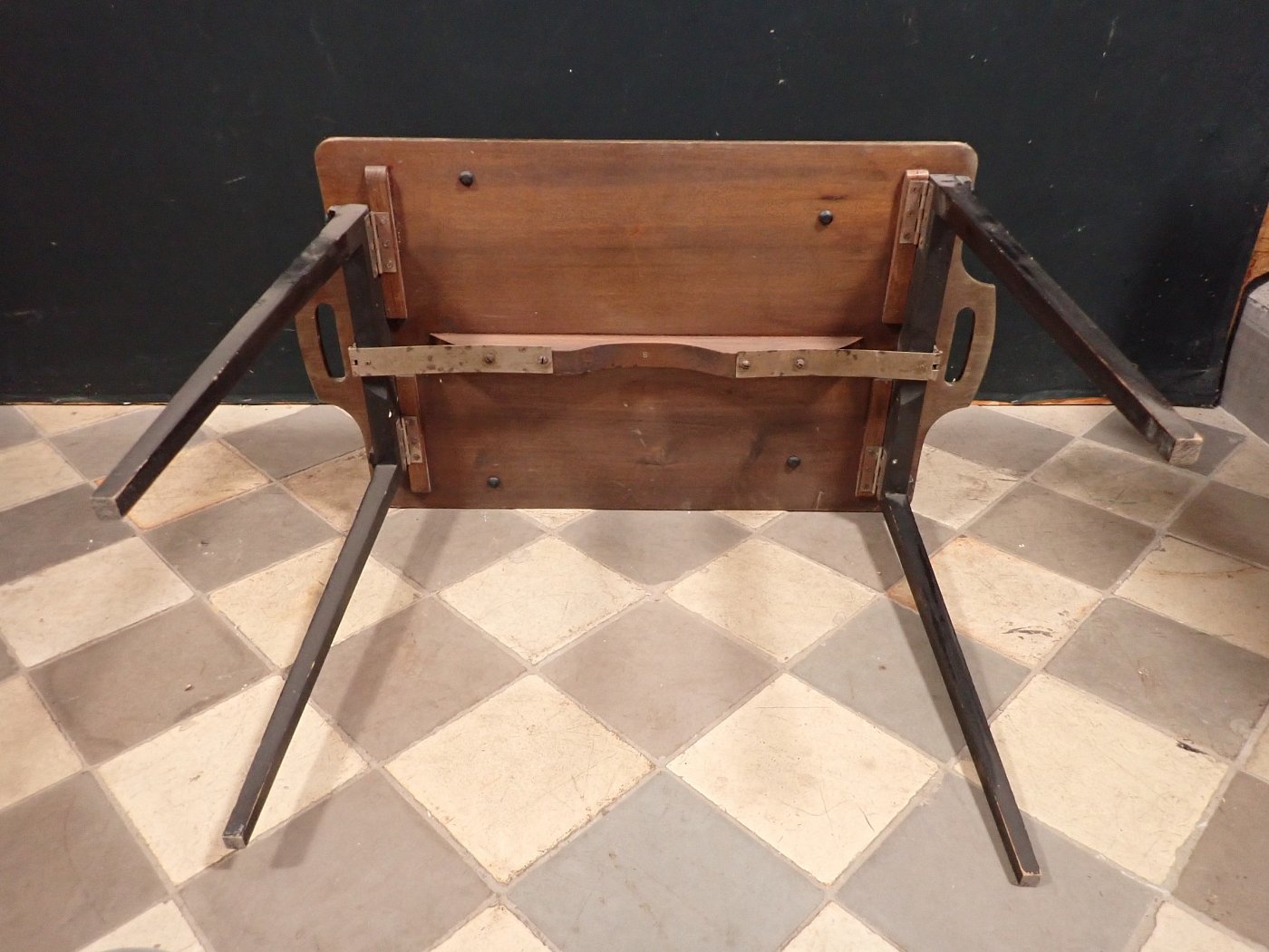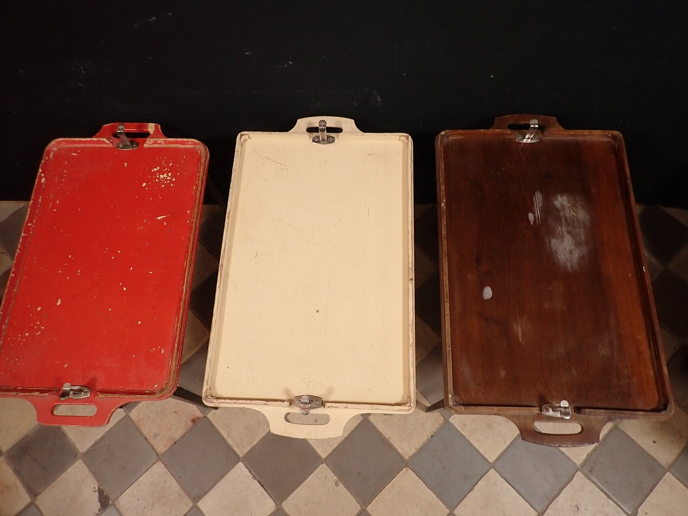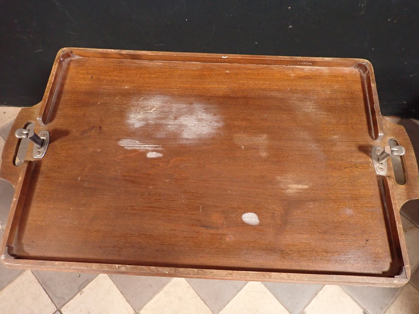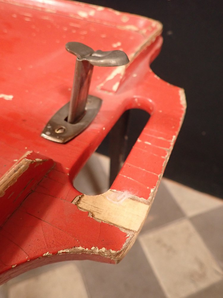 Die Tischplatte besteht aus farbig lackiertem Holz, die Füße bestehen aus schwarz lackiertem Holz. Über die zwei Hebel neben den Griffen sind die Füße mechanisch ausklappbar und wieder einklappbar. Praktisch ist der Tisch z.B. an einem vollen Frühstückstisch, zum Abstellen des Brotkörbchens oder wenn man sich das Frühstück lieber gleich ans Bett bringen lassen möchte.