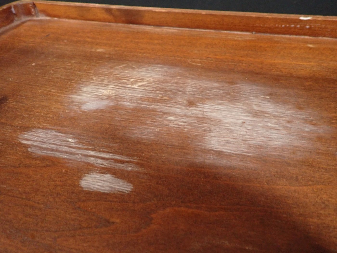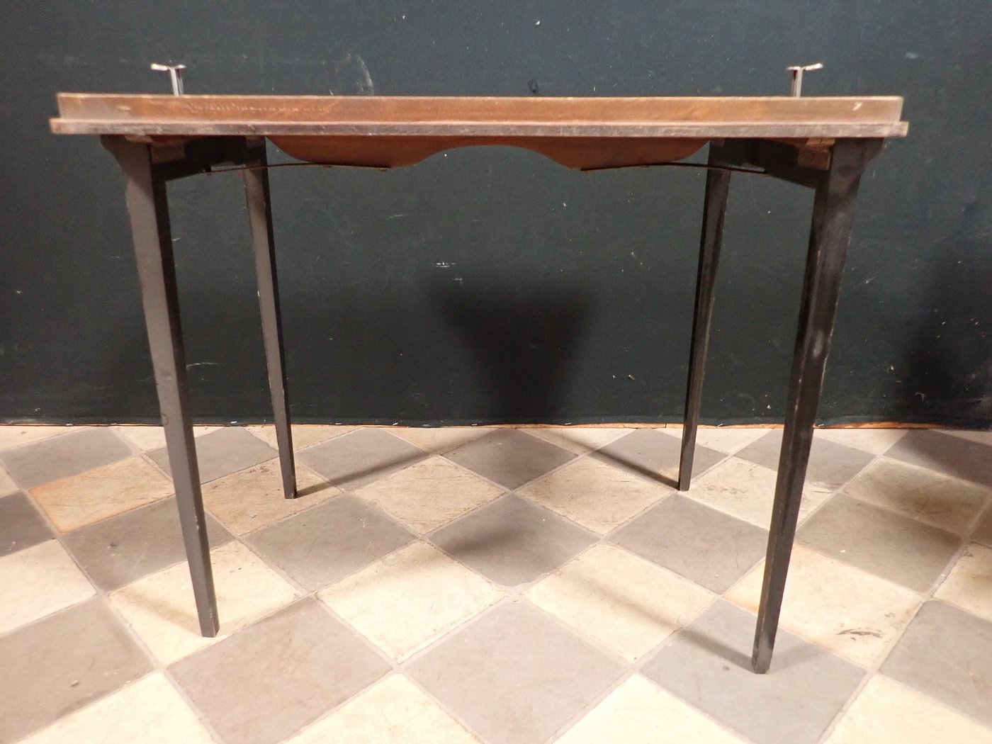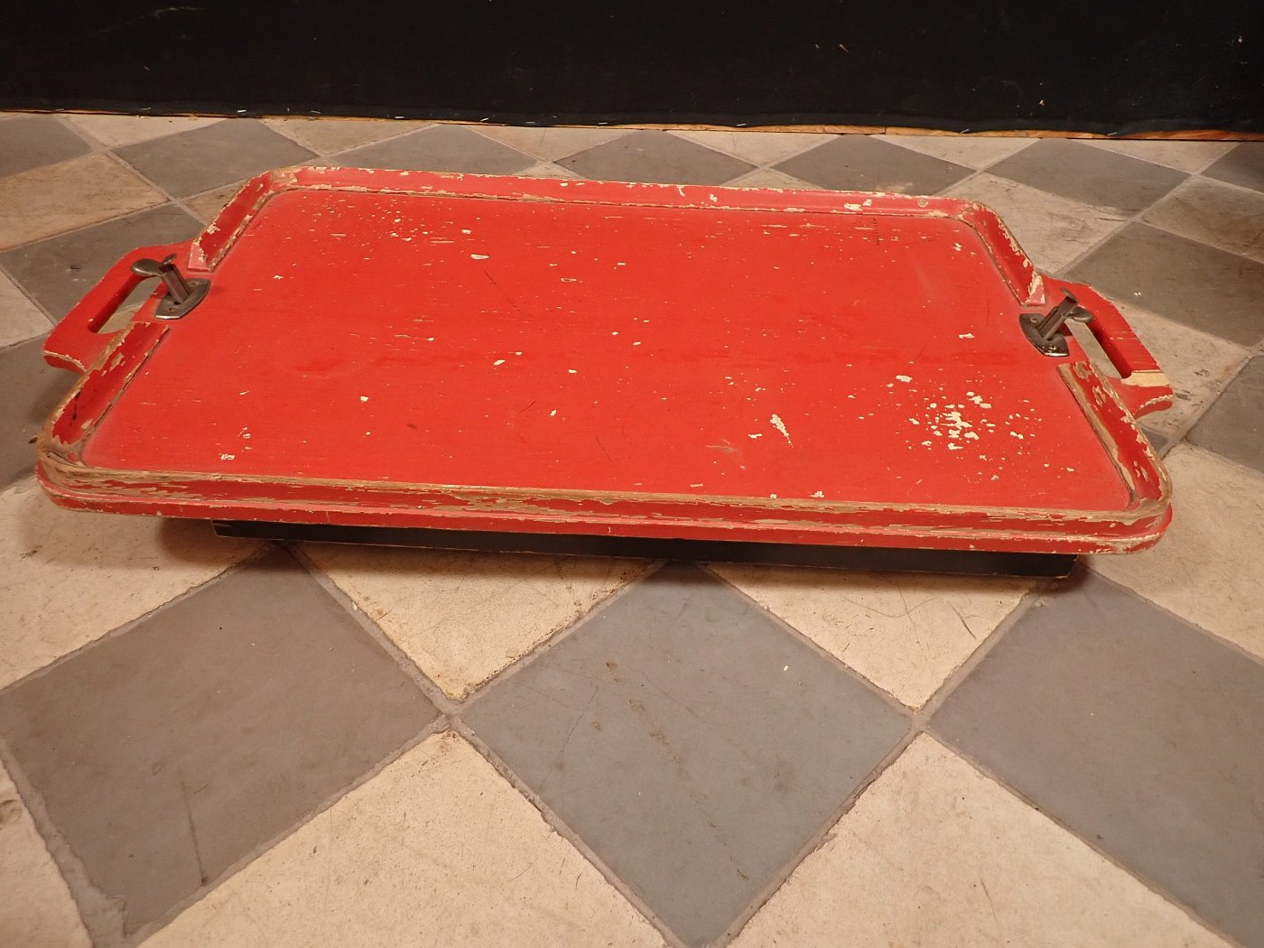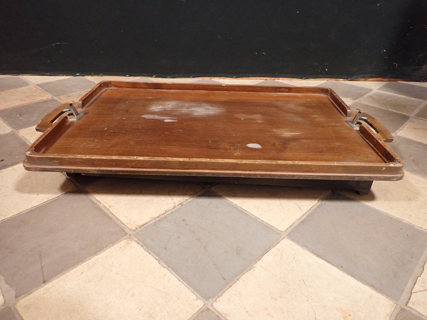 Die Tischplatte besteht aus farbig lackiertem Holz, die Füße bestehen aus schwarz lackiertem Holz. Über die zwei Hebel neben den Griffen sind die Füße mechanisch ausklappbar und wieder einklappbar. Praktisch ist der Tisch z.B. an einem vollen Frühstückstisch, zum Abstellen des Brotkörbchens oder wenn man sich das Frühstück lieber gleich ans Bett bringen lassen möchte.