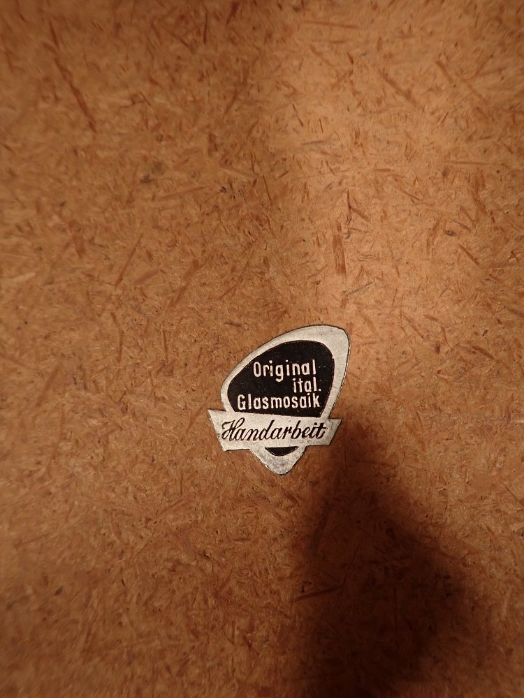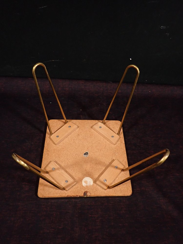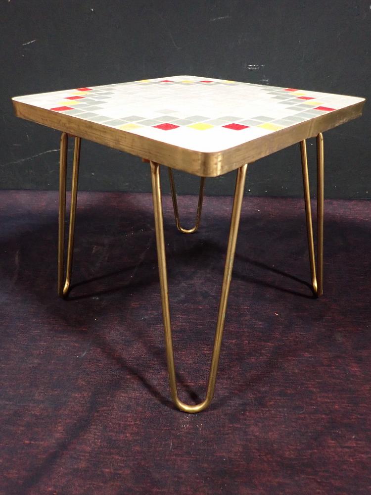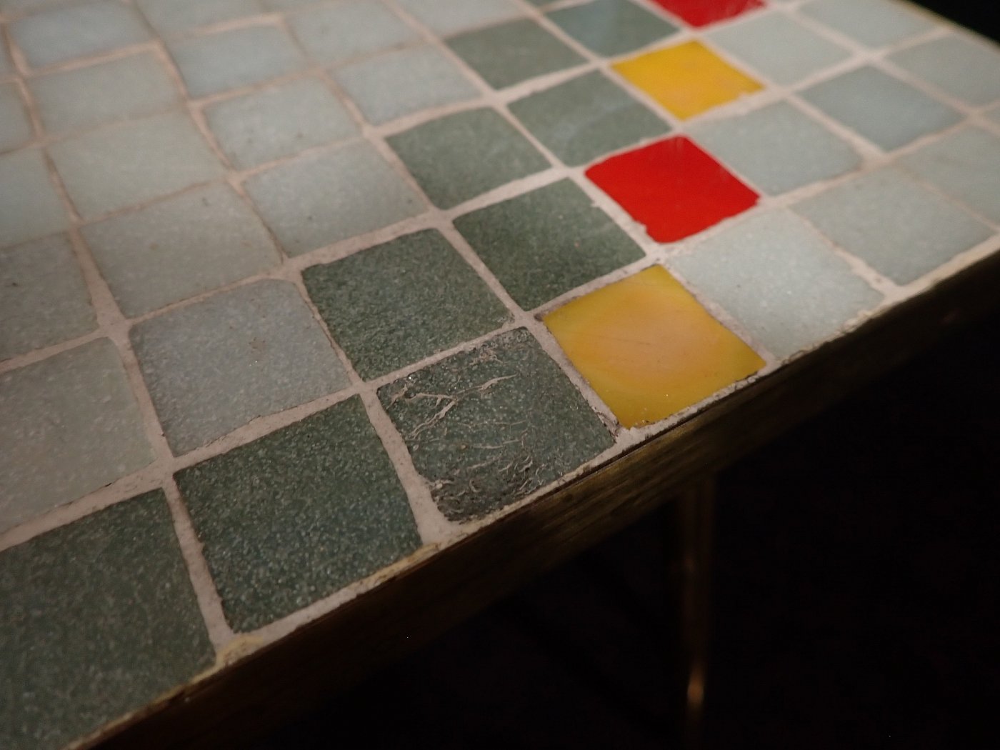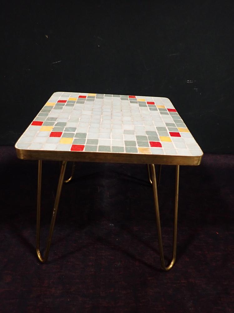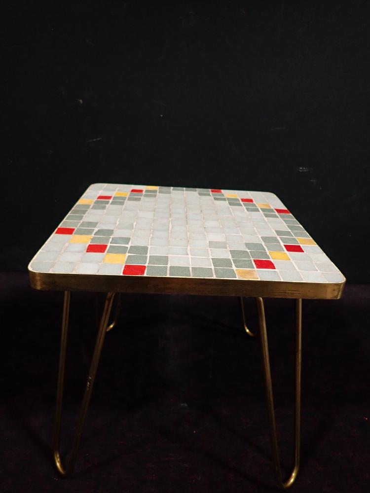 Diese Art Hocker wurde in den 60er-Jahren als Blumenbank genutzt. Die aufwendige geflieste Mosaik Oberfläche bildet einen schönen Kontrast zu der Messingumrandung und die geformten Messingfüße runden das Gesamtbild ab. Auf der Unterseite befindet sich ein Aufkleber mit der Aufschrift "Original italienisches Glasmosaik, Handarbeit".