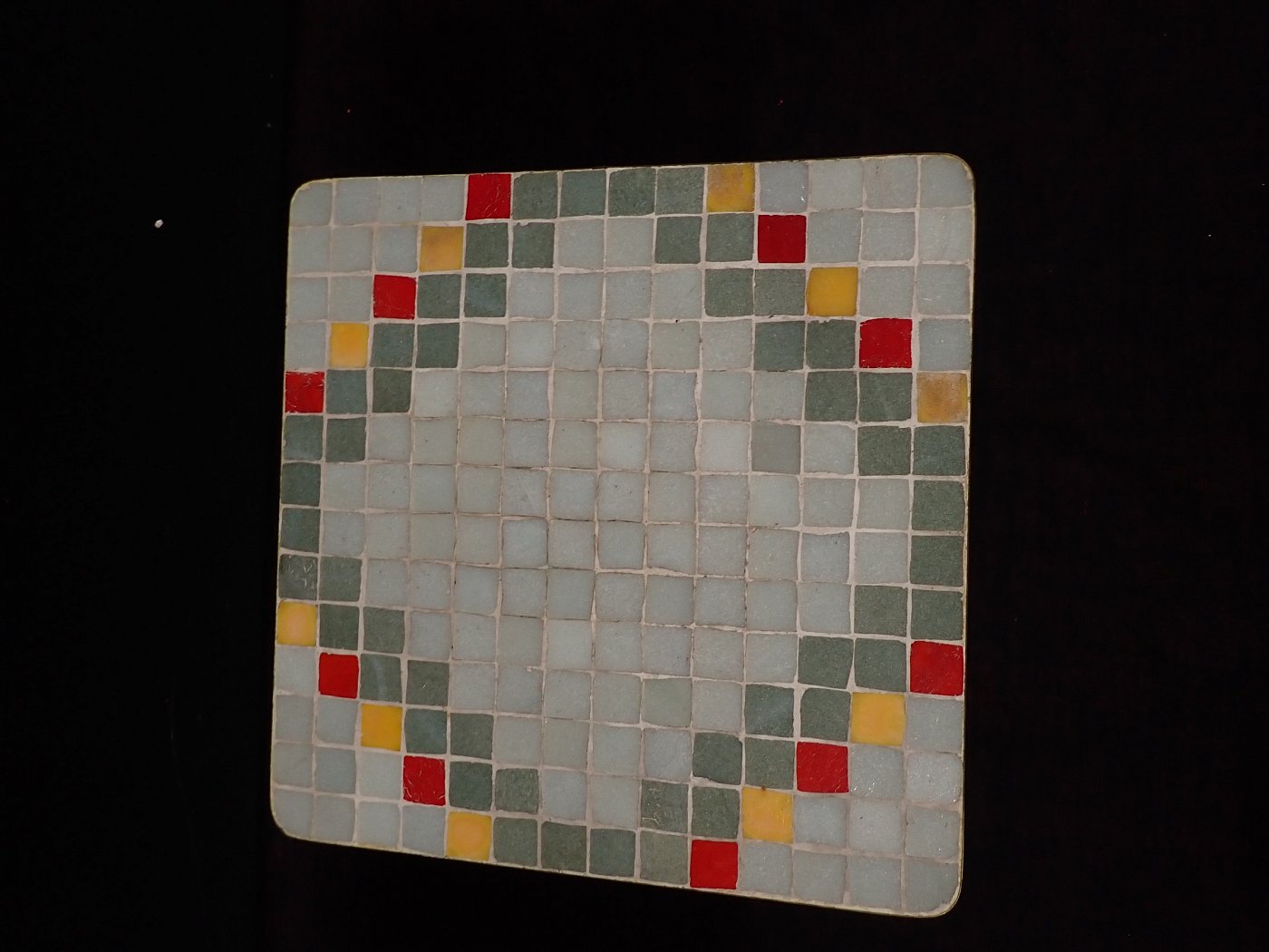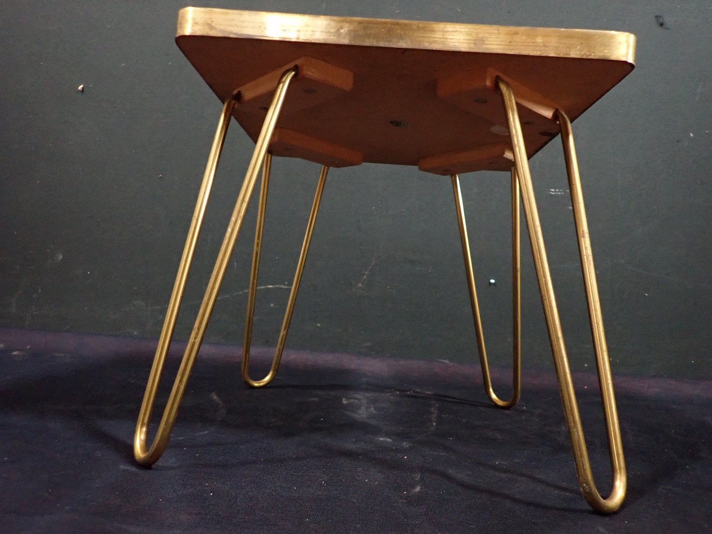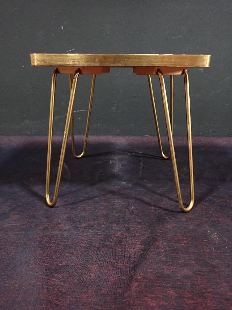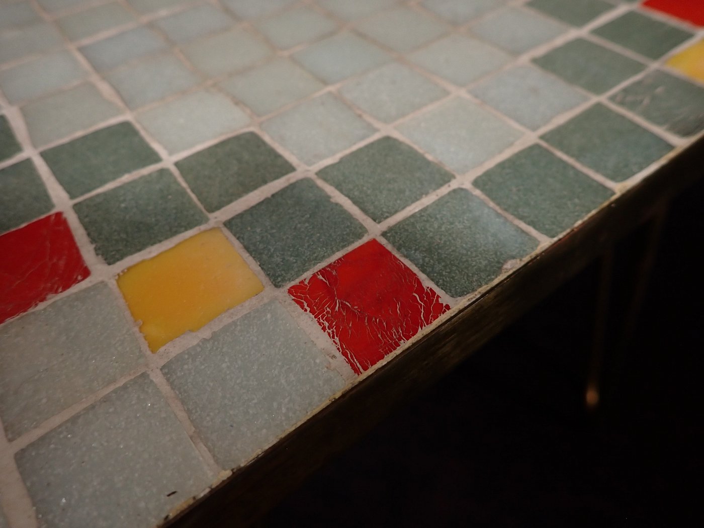 Diese Art Hocker wurde in den 60er-Jahren als Blumenbank genutzt. Die aufwendige geflieste Mosaik Oberfläche bildet einen schönen Kontrast zu der Messingumrandung und die geformten Messingfüße runden das Gesamtbild ab. Auf der Unterseite befindet sich ein Aufkleber mit der Aufschrift "Original italienisches Glasmosaik, Handarbeit".