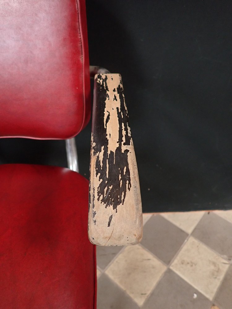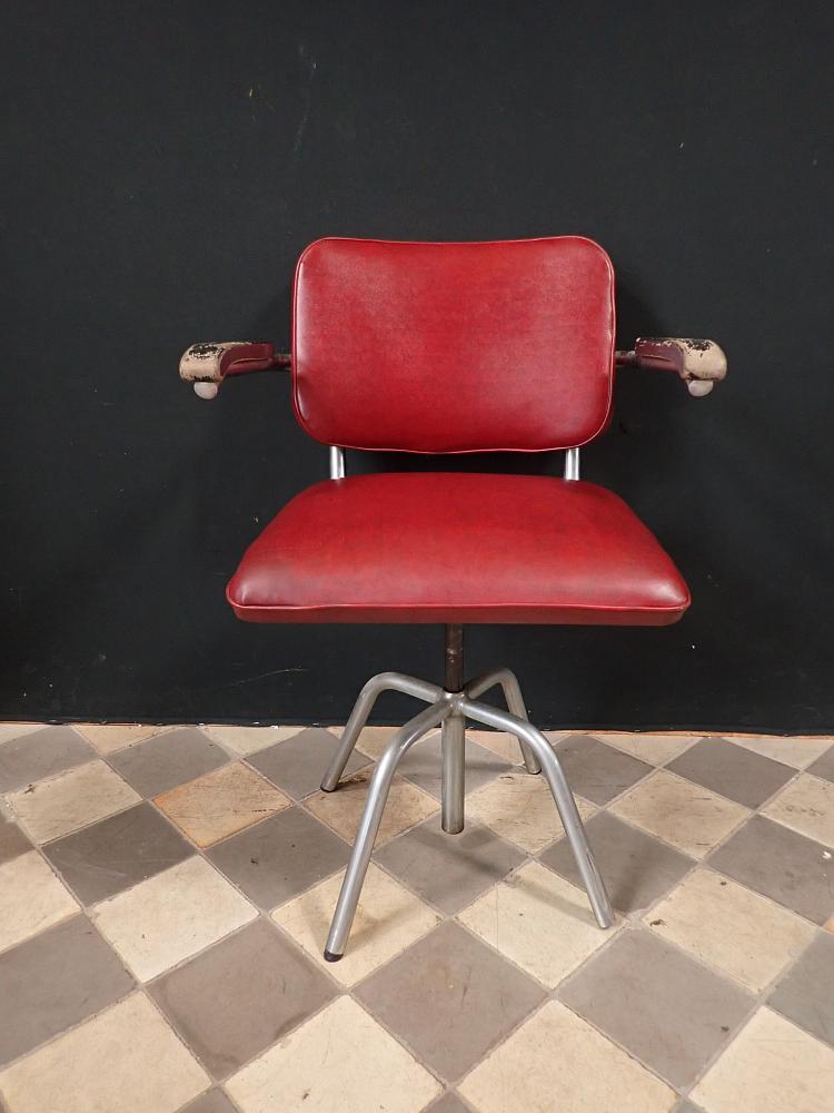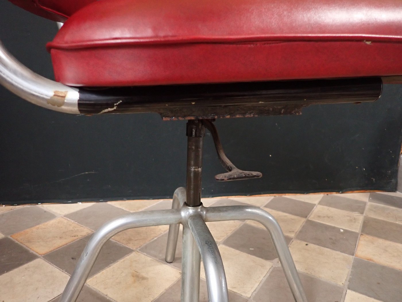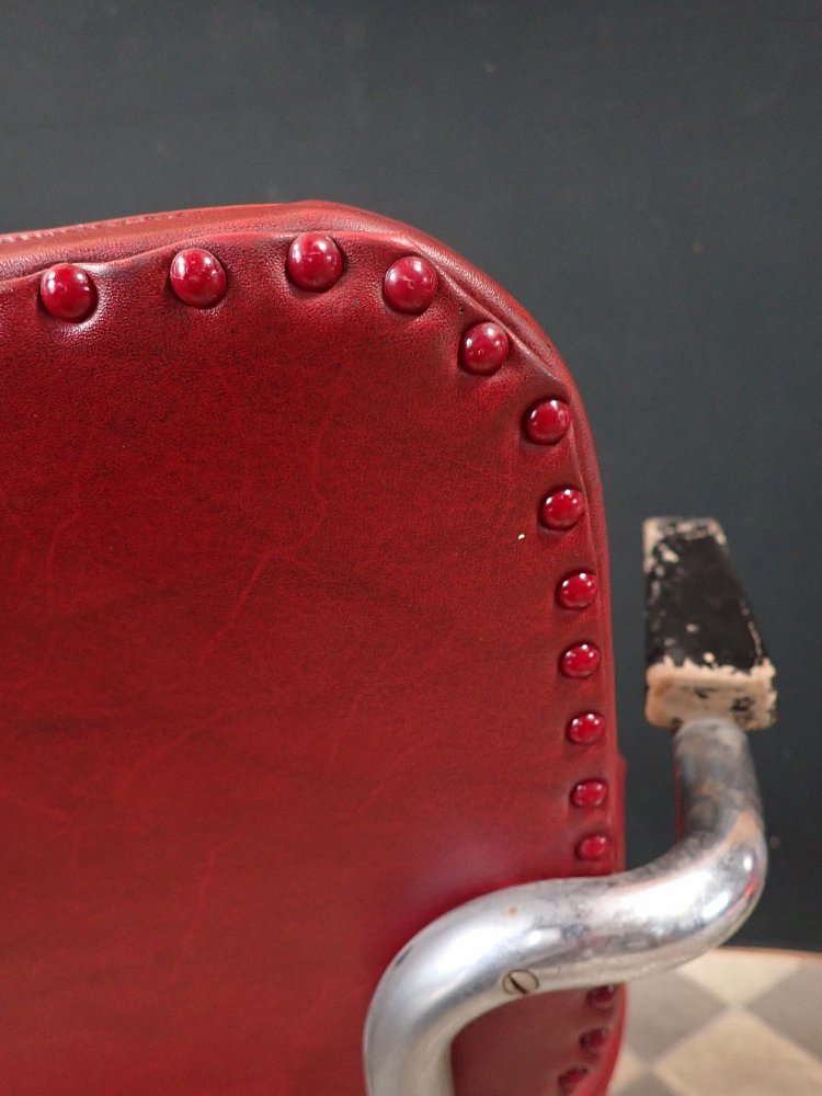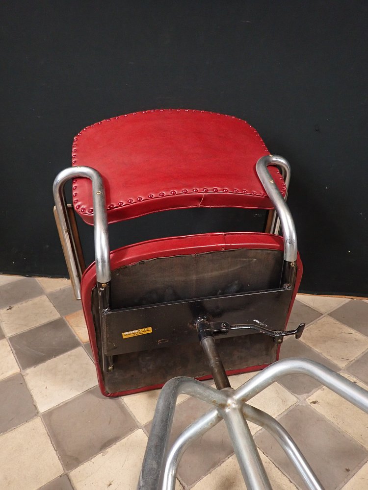 Sitzfläche und Rückenlehne sind mit rotem Leder bezogen und werden von einem Stahlrohrgestell getragen. Der Sitz lässt sich in der Höhe verstellen und ist drehbar.