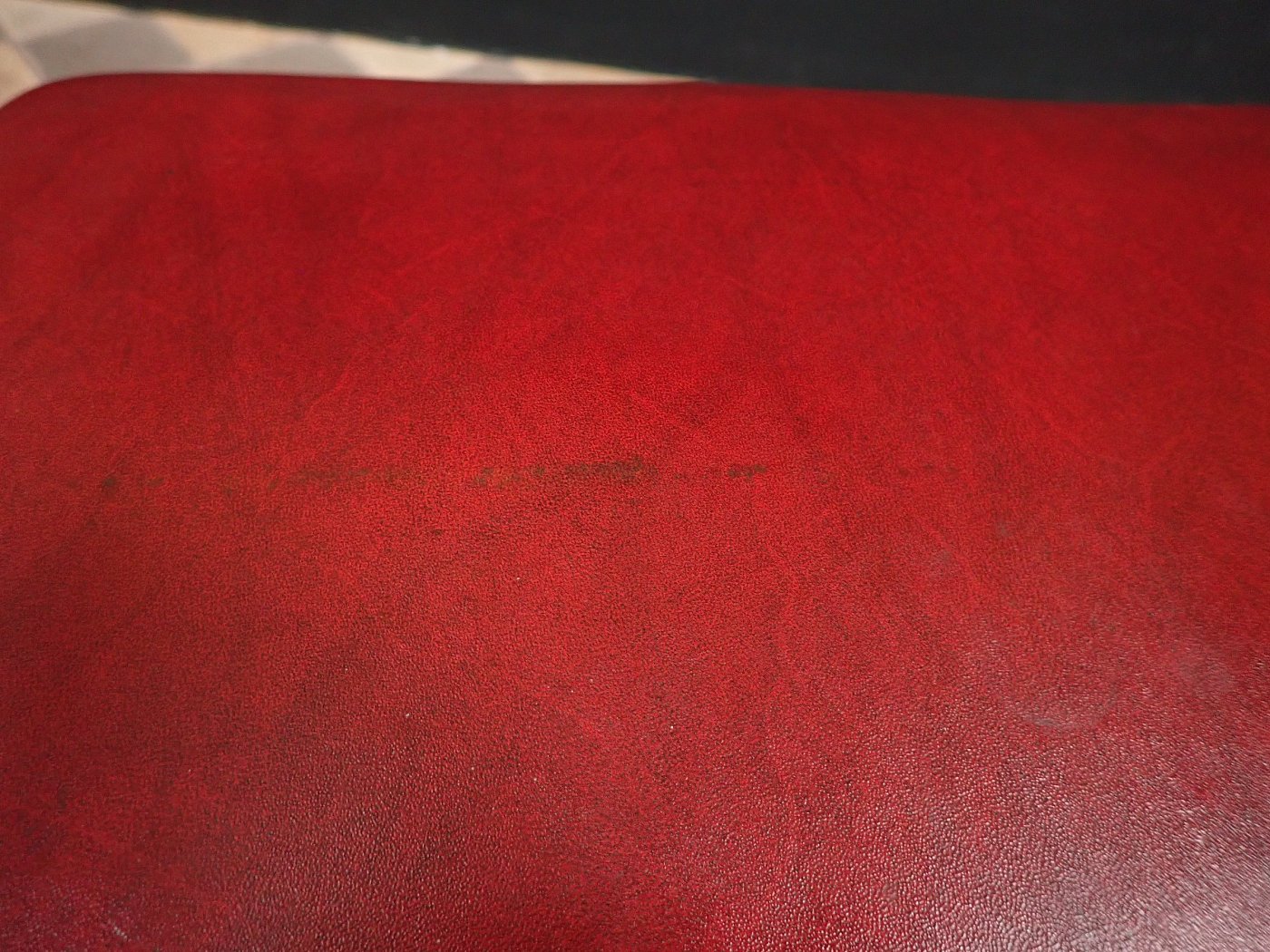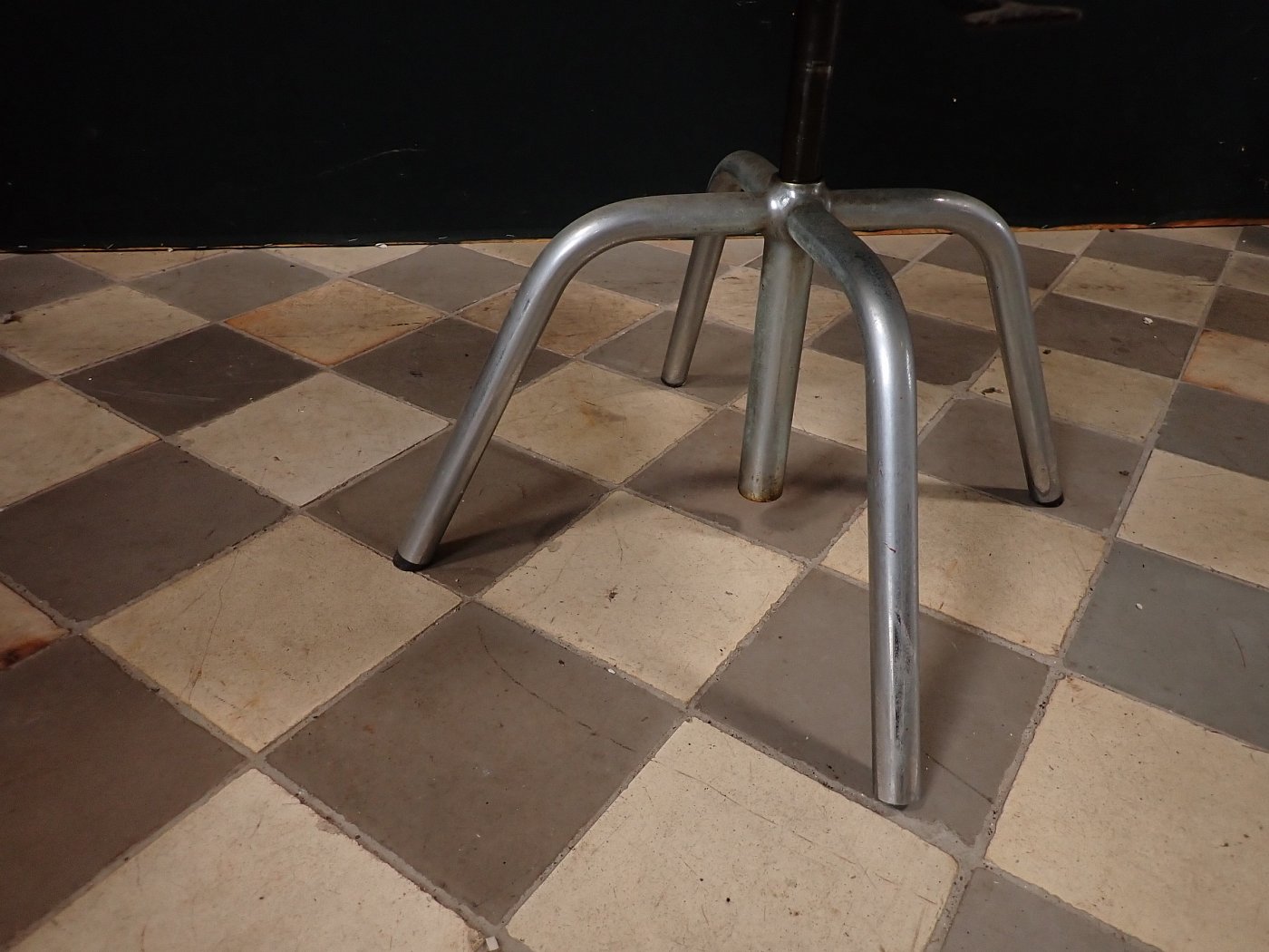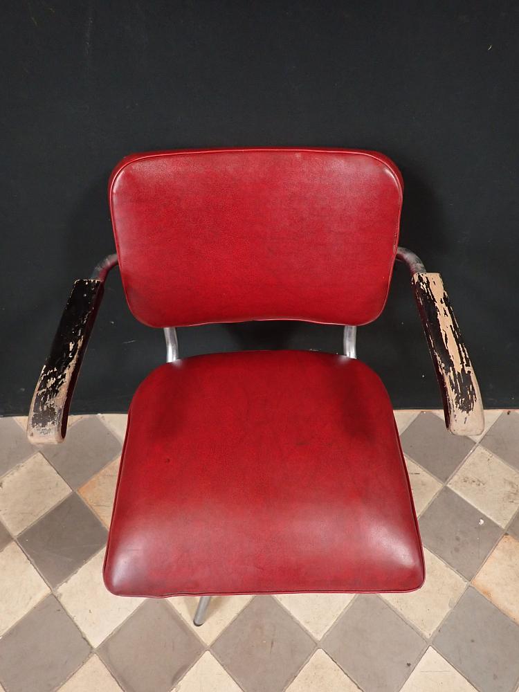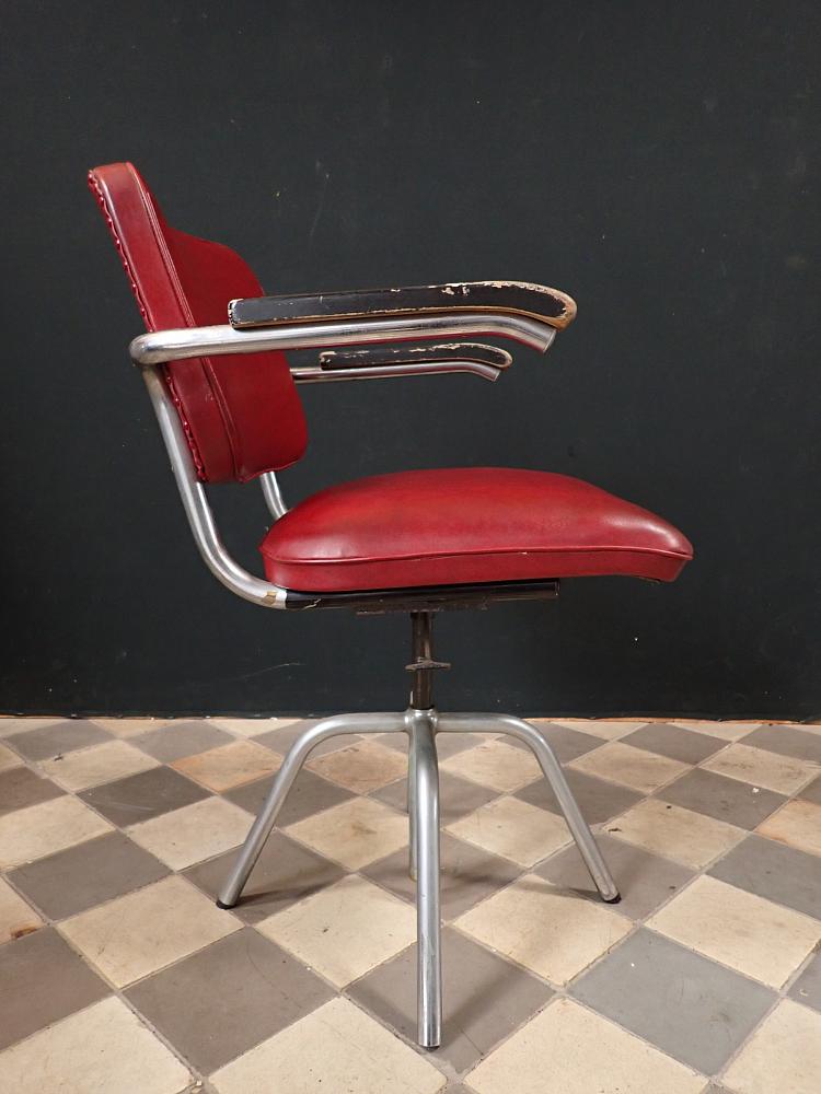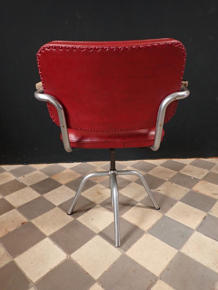 Sitzfläche und Rückenlehne sind mit rotem Leder bezogen und werden von einem Stahlrohrgestell getragen. Der Sitz lässt sich in der Höhe verstellen und ist drehbar.