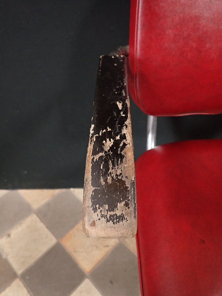 An den hölzernen Armlehnen löst sich größtenteils der schwarze Lack. Diese müssen vor einer weiteren Nutzung auf jeden Fall überarbeitet werden.