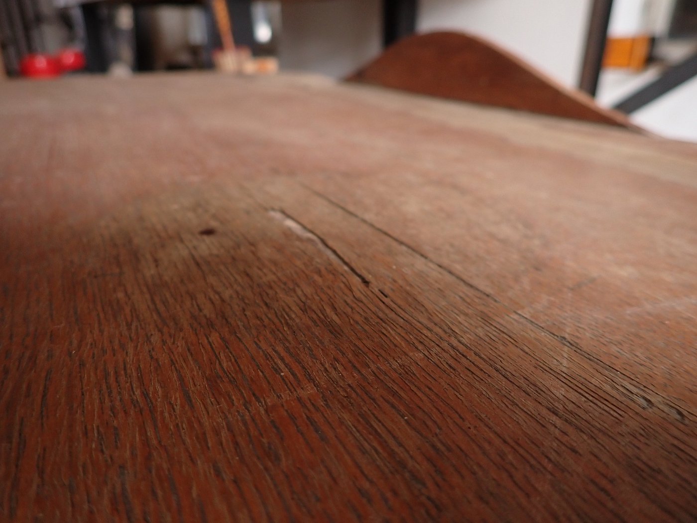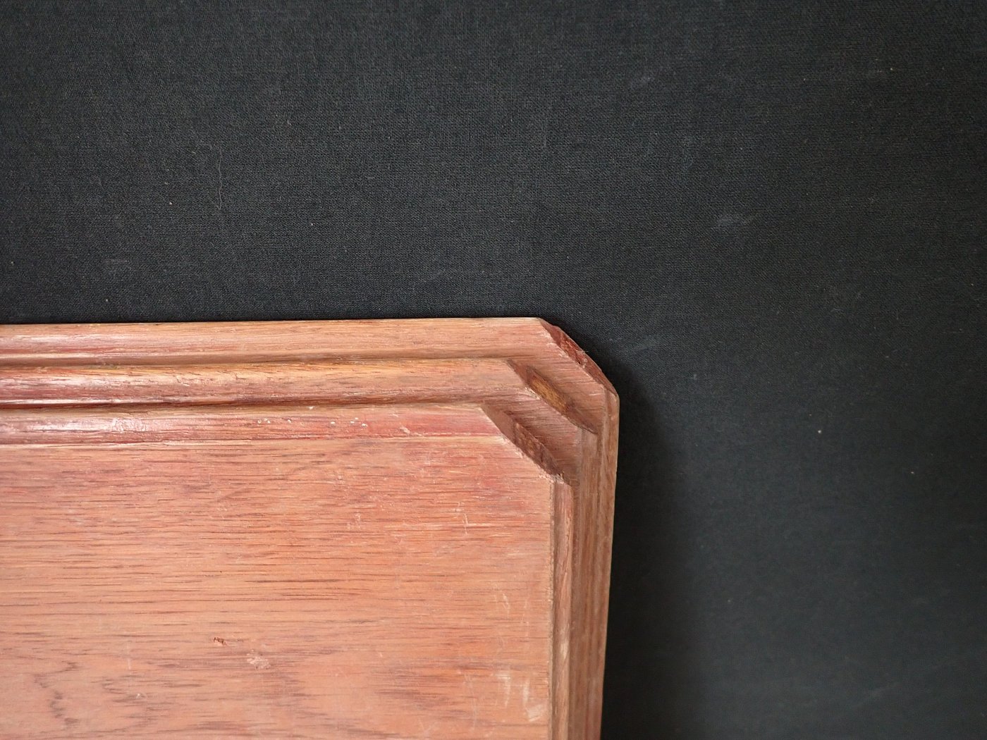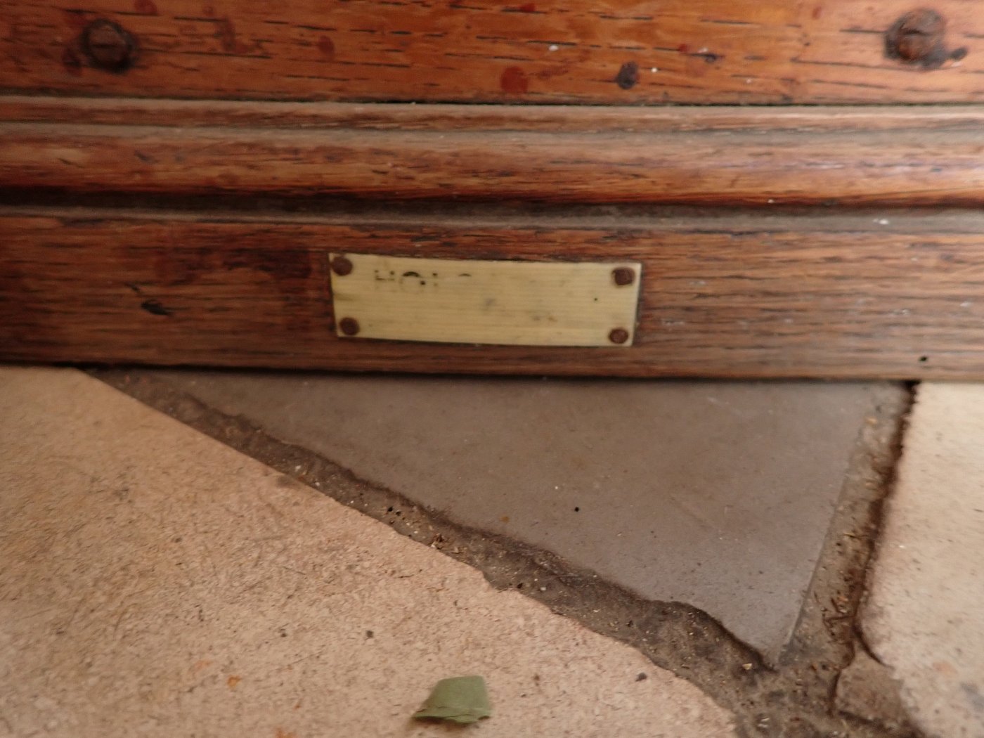 DetailansichtAntiker Schrank aus massiver Eiche. Der Schrank ist schlicht, aber beeindruckend. Die Türen sind in Kassetten gearbeitet, dazwischen eine Schublade.