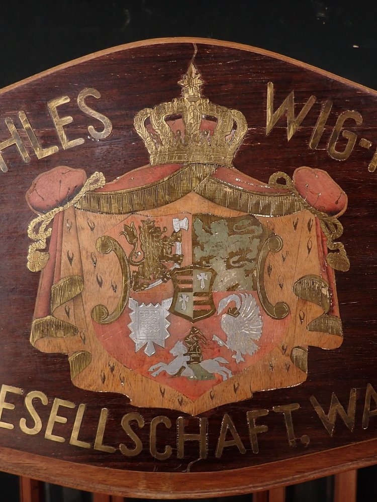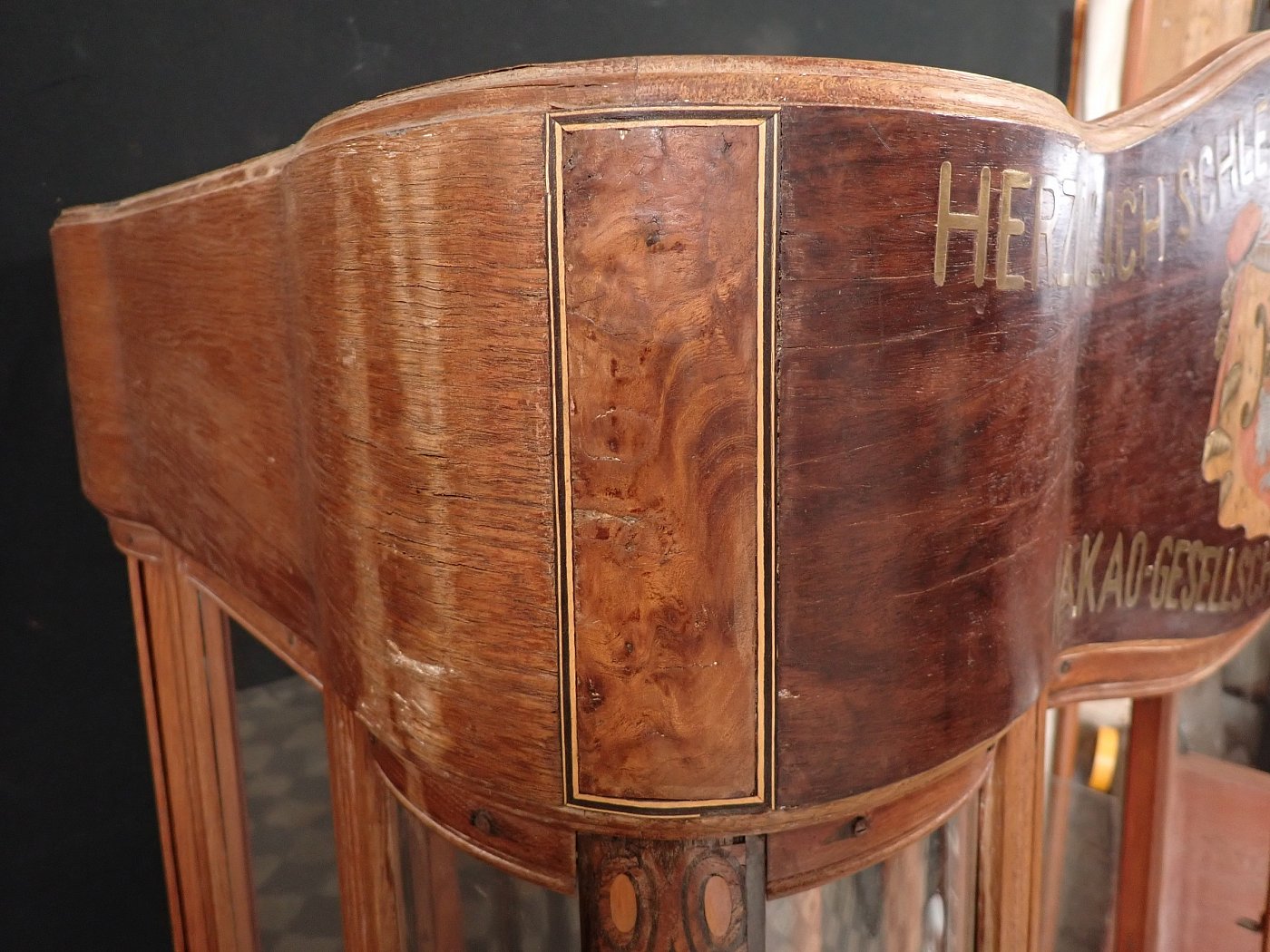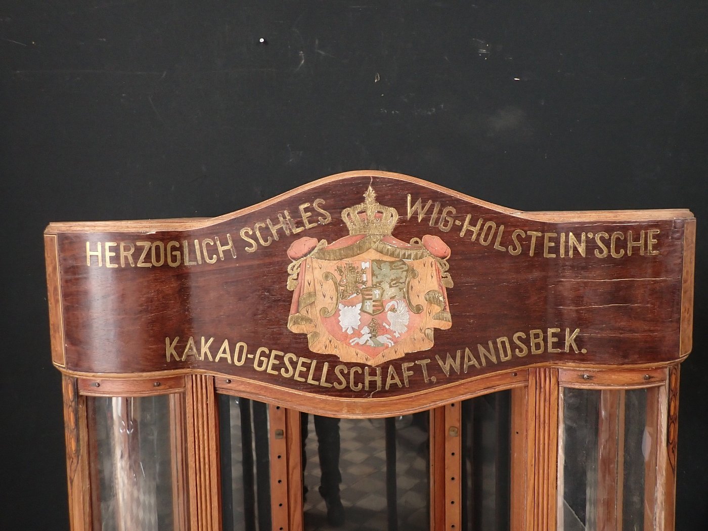 Auf der Vorderseite ist die Vitrine mit Intarsienarbeiten und dem Schriftzug "Herzoglich Schleswig-Holstein´sche Kakao-Gesellschaft Wandsbek" äußerst detailliert und dekorativ gearbeitet.
