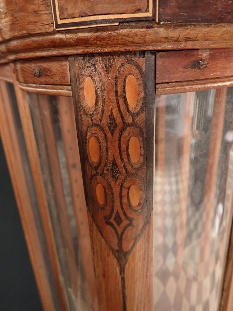 Die Holzvitrine ist ringsum mit Glasscheiben ausgestattet, teilweise sogar mit gebogenen Gläsern. Zur Bestückung gibt es auf der Rückseite der Vitrine eine Tür und es sind drei passende Einlegeböden vorhanden.
