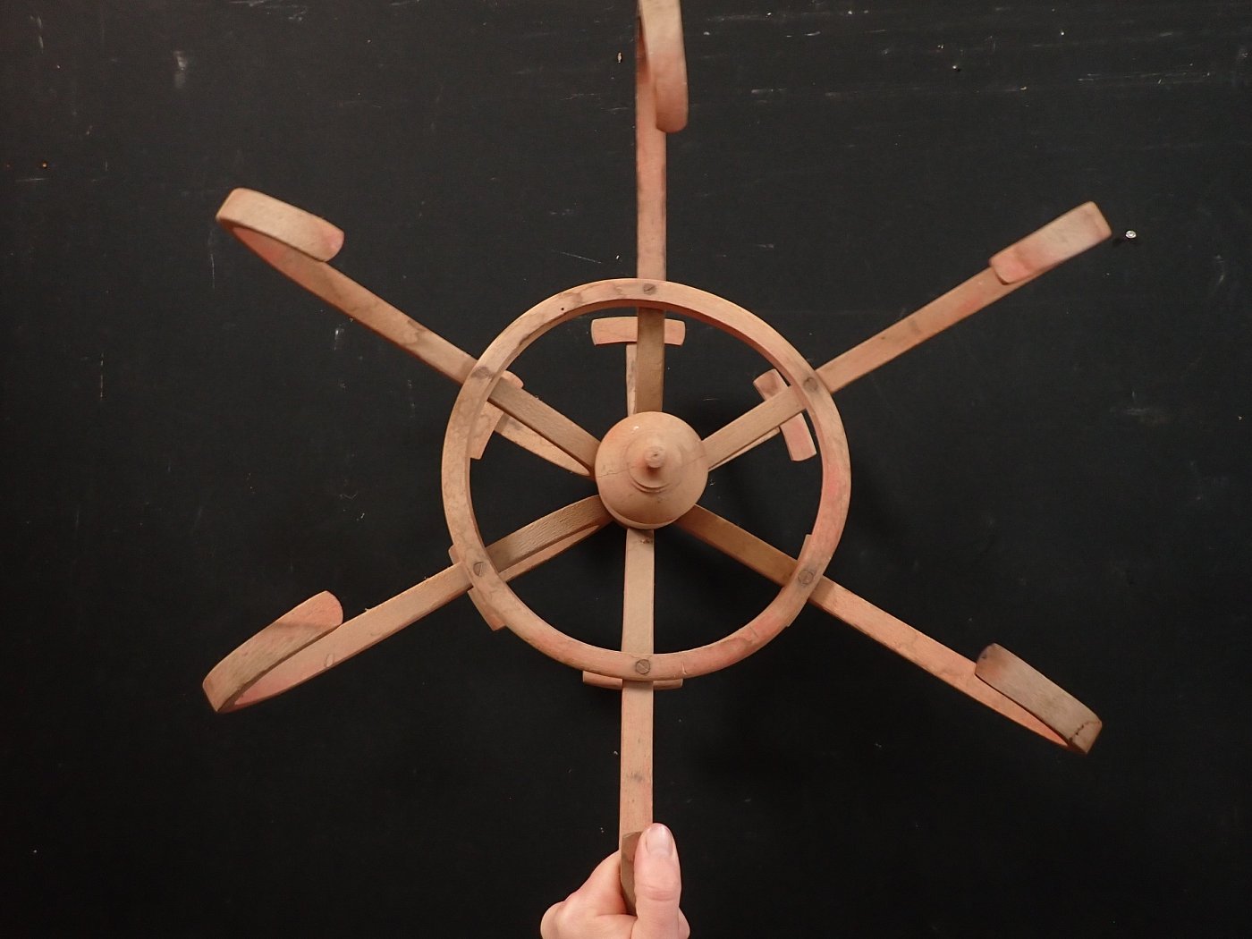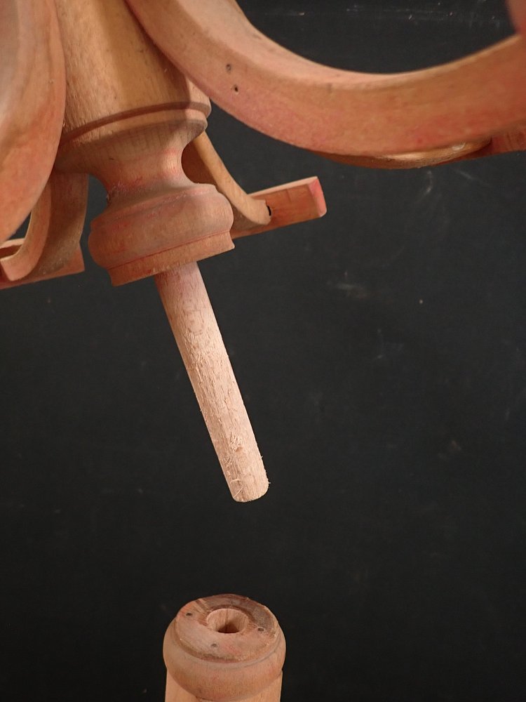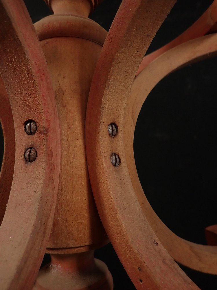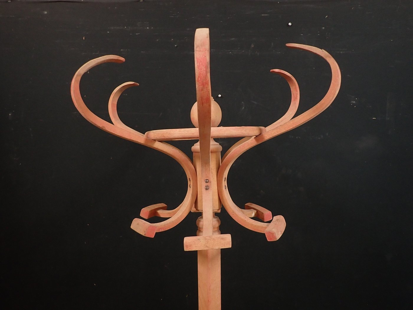 Die Basis der Garderobe bildet ein gekreuzter Fuß, an dem die gebogenen Hölzer, welche den Ring des Schirmständers tragen, befestigt sind.