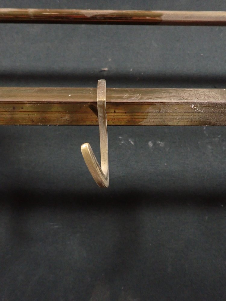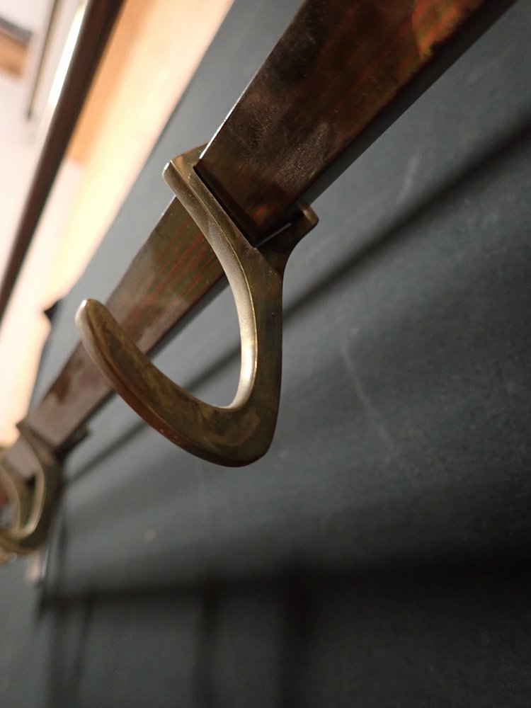 Die Messinggarderobe ist über die komplette Breite mit fünf Rundstäben ausgestattet, welche eine Hutablage bilden. Darunter ist an den Wandhalterungen eine quadratische Stange eingearbeitet, die mit Haken ausgestattet ist und Platz für zahlreiche Jacken, Taschen, Mäntel usw. bietet.