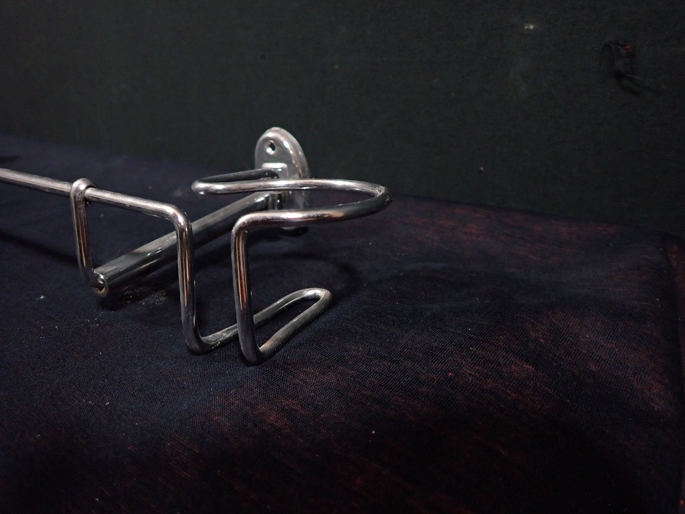DetailansichtBecherhalter zur Wandmontage. Die schlanken Halter sind aus einem Stück gebogen und in einer kleinen runden Platte befestigt, welche direkt an der Wand festgeschraubt...