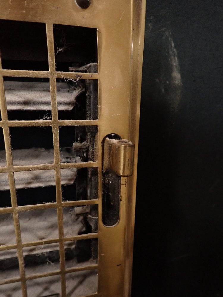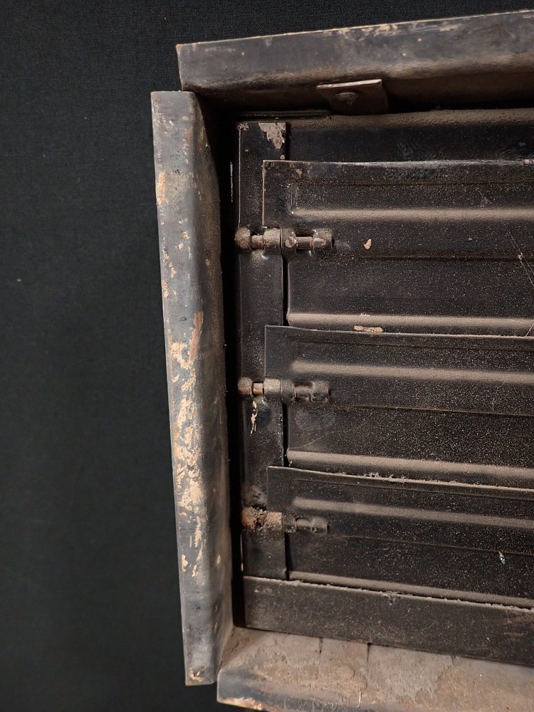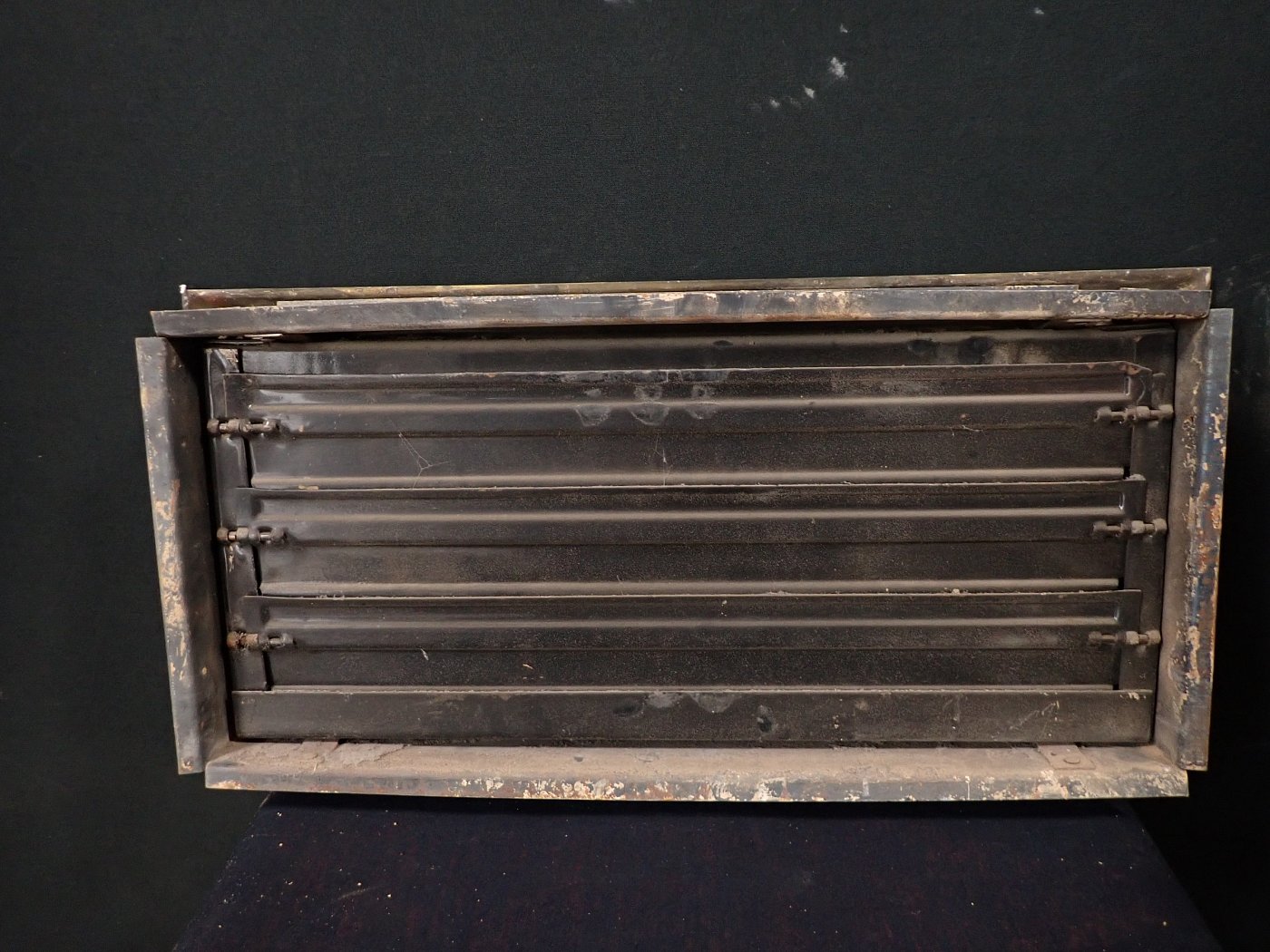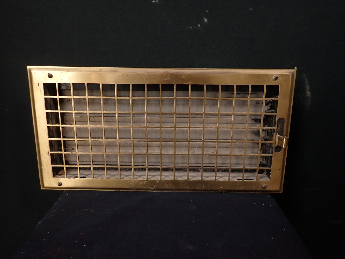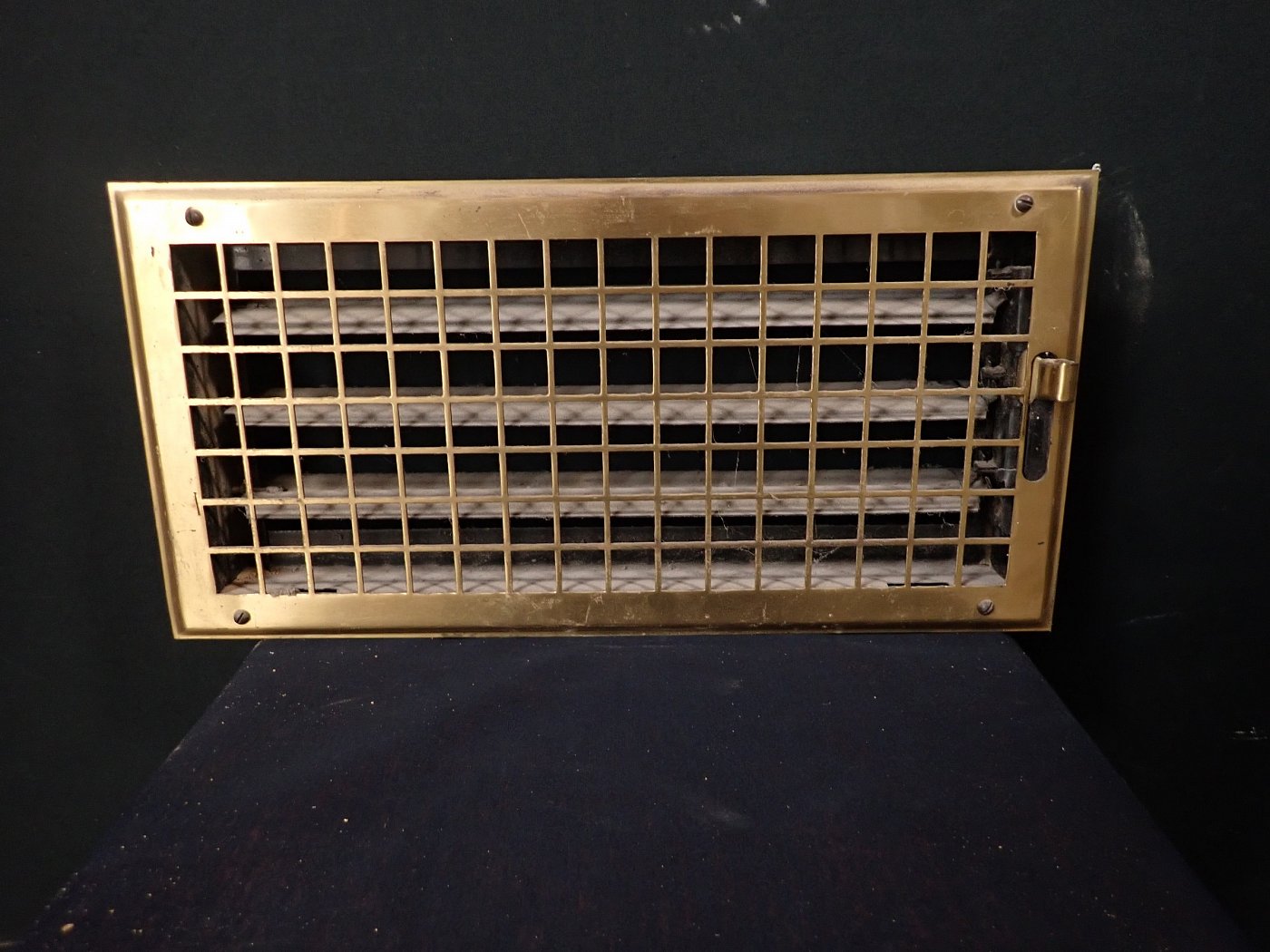 Lüftungsgitter aus Messing. Das kleine Gitter war in einem Kachelofen verbaut und ist mit Lamellen ausgestattet, die sich über einen kleinen Schubriegel verstellen...
